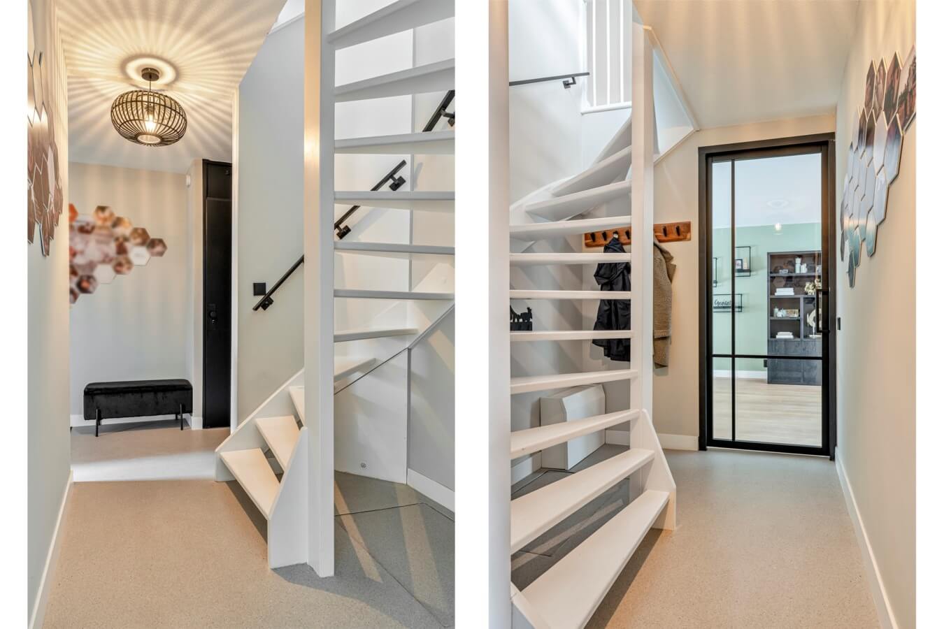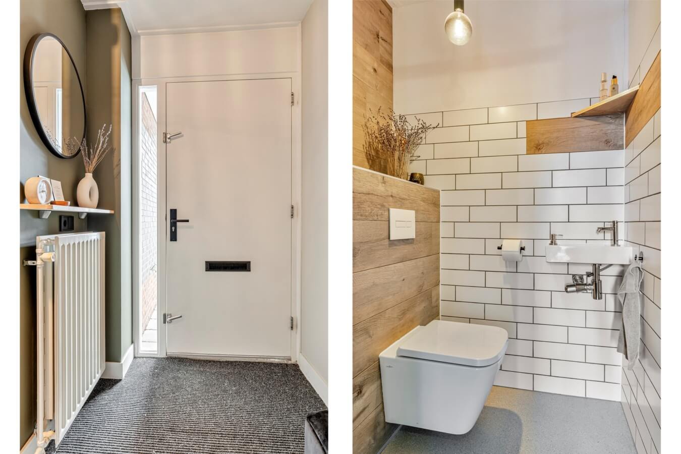 Wanneer je de voordeur opent kom je terecht in de ruime hal, waar je de meterkast, de moderne toiletruimte met hangend closet en fonteintje en de trapopgang kan vinden. Als de moderne afwerkingen in de hal de toon zetten voor de rest van de woning, dan staat je nog een hoop te wachten. Zullen we de stoere taatsdeur openen en gaan kijken of dat klopt?