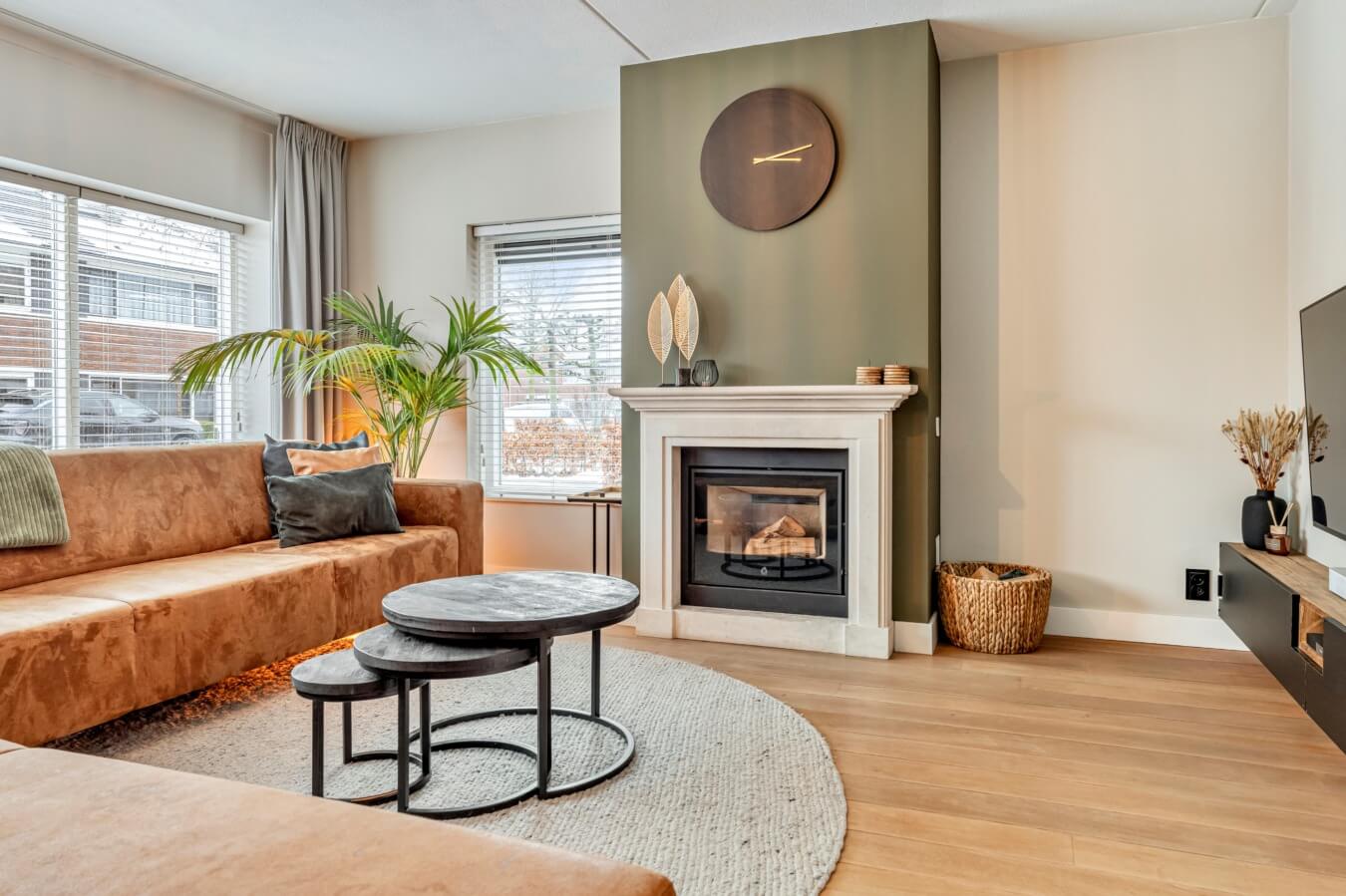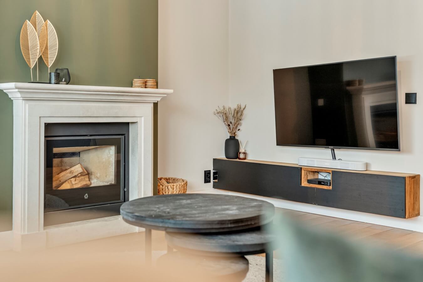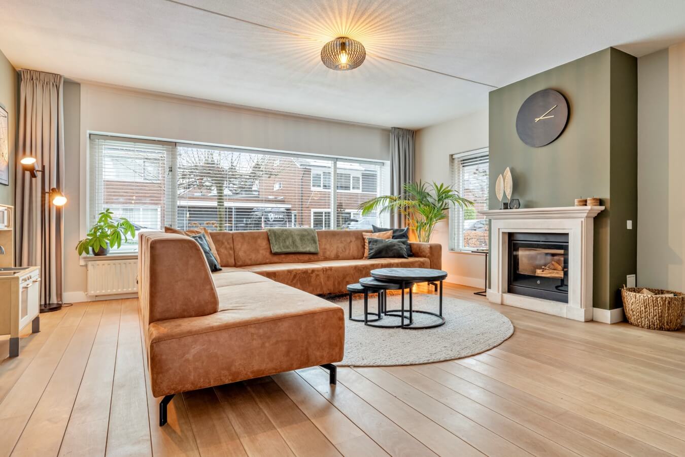 En of. Direct bij binnenkomst in de woonkamer word je omarmd door een gevoel van comfortabel woongenot. Van een stijlvolle uitstraling tot mooie afwerkingen; het ruime zitgedeelte nabij de sfeervolle schouw en houtkachel is tot in de puntjes uitgevoerd. De eiken houten vloer geeft de ruimte extra warmte, terwijl de strakke wand- en plafondafwerking zorgt voor een eigentijdse uitstraling.