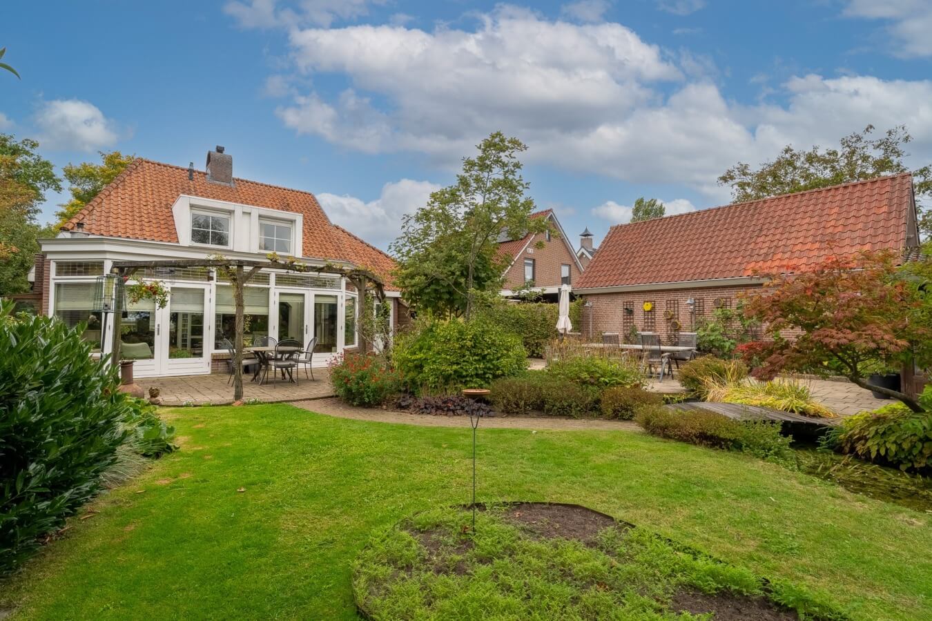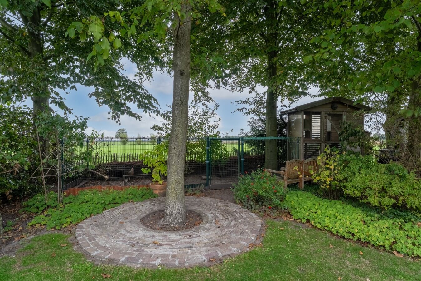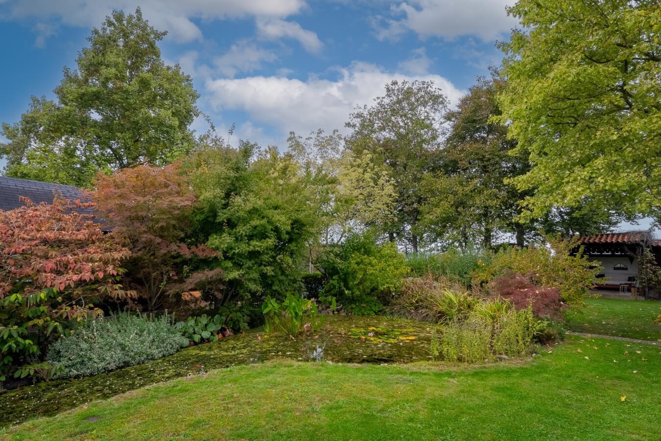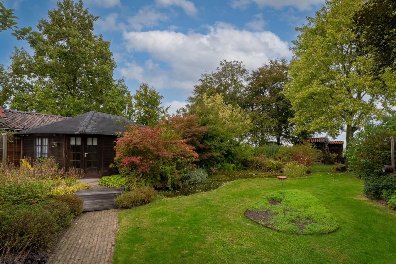 De tuin omsluit de woning en is fraai aangelegd met sierbestrating, gazon, volwassen bomen en een vijverpartij. Aan de achterzijde geniet je van vrij uitzicht over de aangrenzende weilanden, een idyllische plek waar rust en natuur samenkomen. Een tuinhuisje biedt extra bergruimte, en dankzij de royale afmetingen van het perceel is er altijd wel een zonnig plekje te vinden.