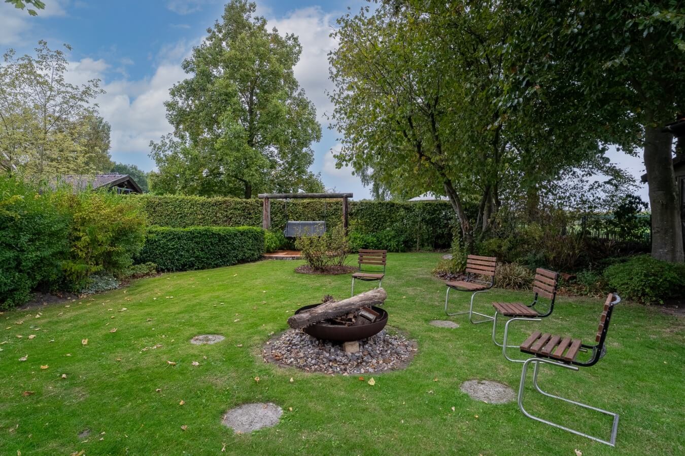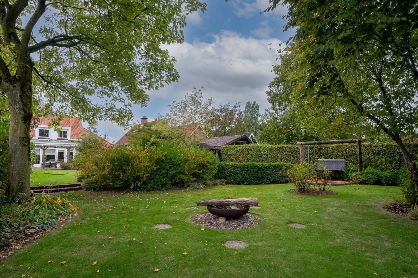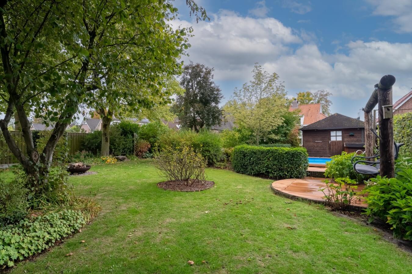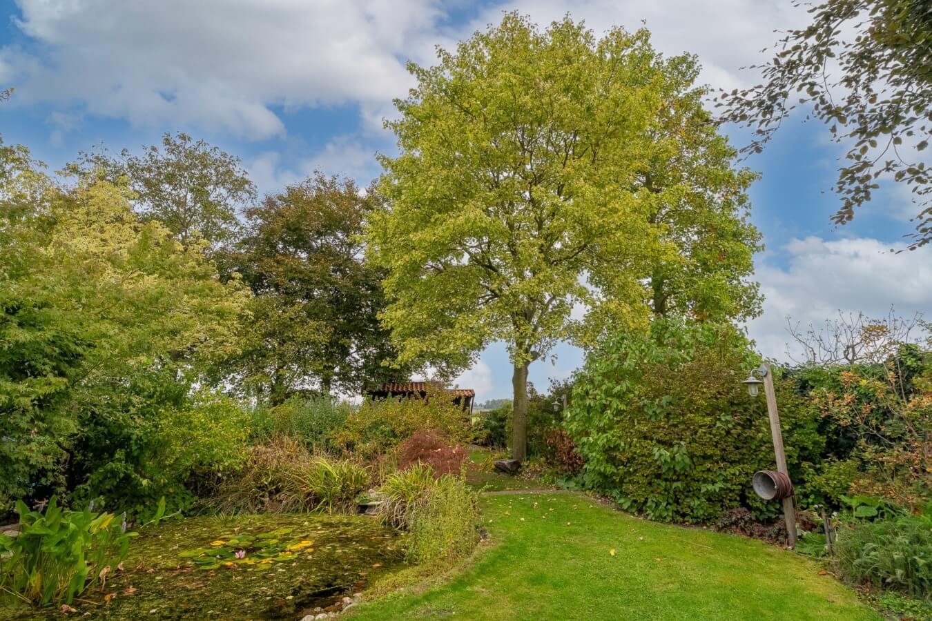 De tuin omsluit de woning en is fraai aangelegd met sierbestrating, gazon, volwassen bomen en een vijverpartij. Aan de achterzijde geniet je van vrij uitzicht over de aangrenzende weilanden, een idyllische plek waar rust en natuur samenkomen. Een tuinhuisje biedt extra bergruimte, en dankzij de royale afmetingen van het perceel is er altijd wel een zonnig plekje te vinden.