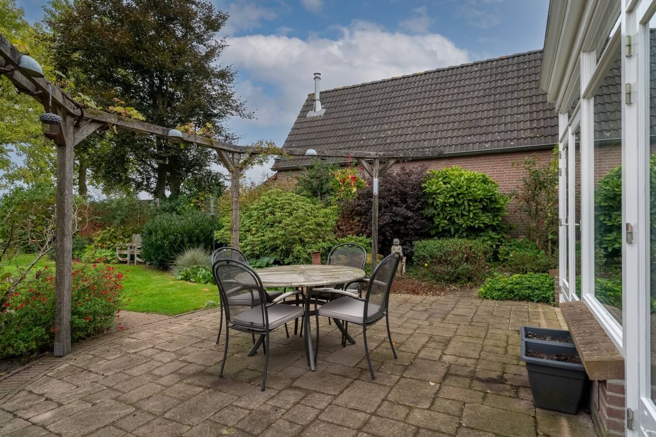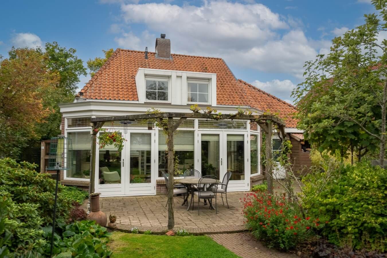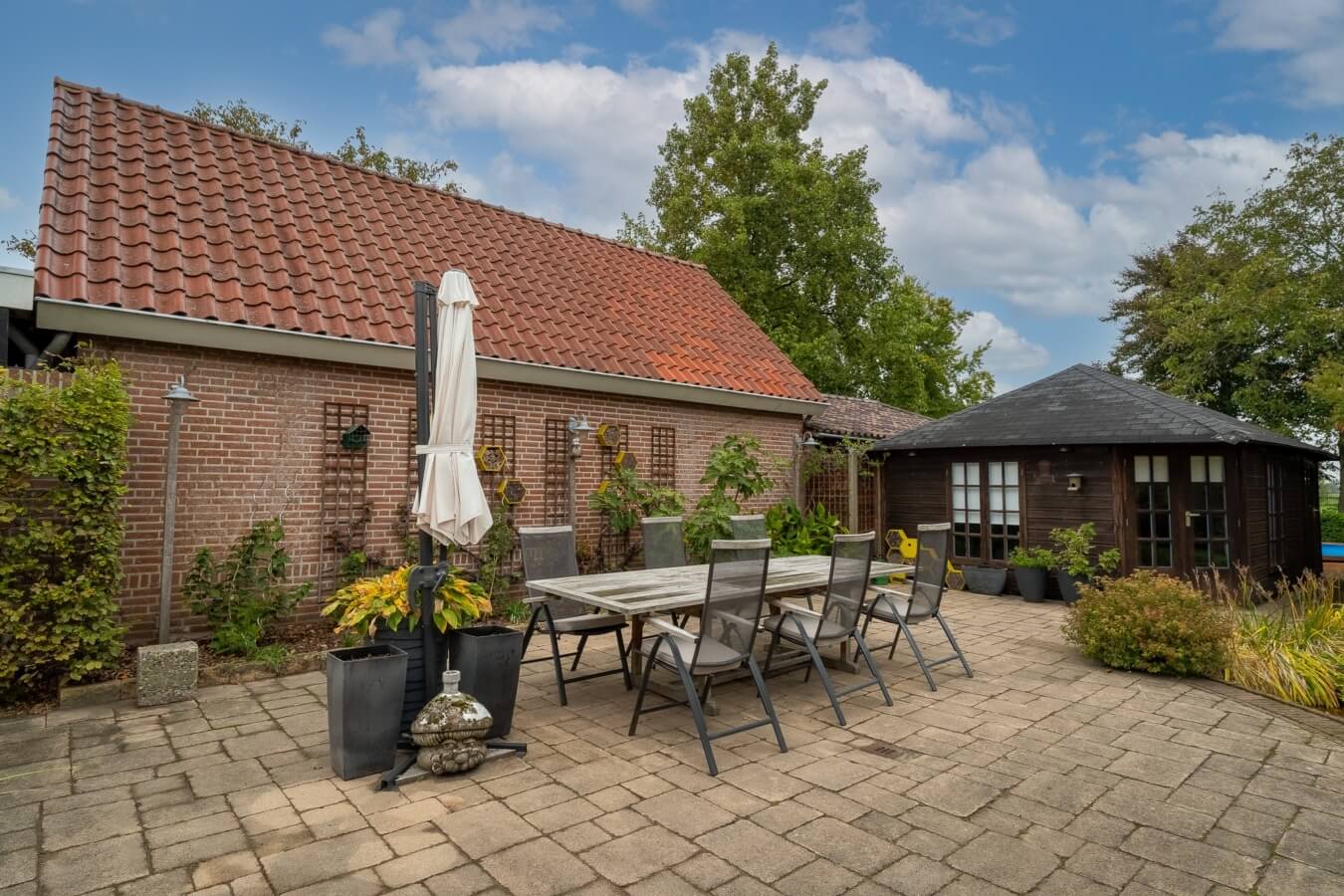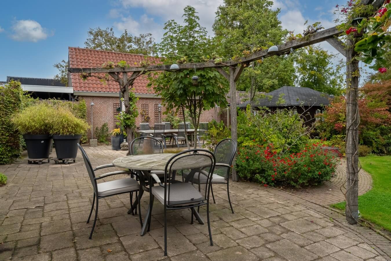 De tuin omsluit de woning en is fraai aangelegd met sierbestrating, gazon, volwassen bomen en een vijverpartij. Aan de achterzijde geniet je van vrij uitzicht over de aangrenzende weilanden, een idyllische plek waar rust en natuur samenkomen. Een tuinhuisje biedt extra bergruimte, en dankzij de royale afmetingen van het perceel is er altijd wel een zonnig plekje te vinden.