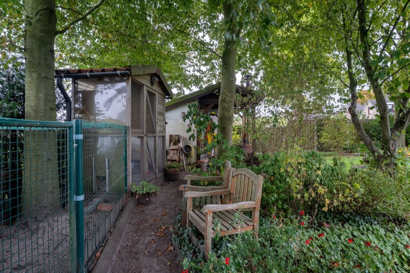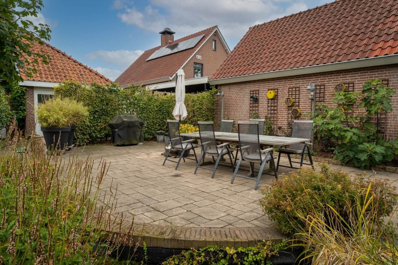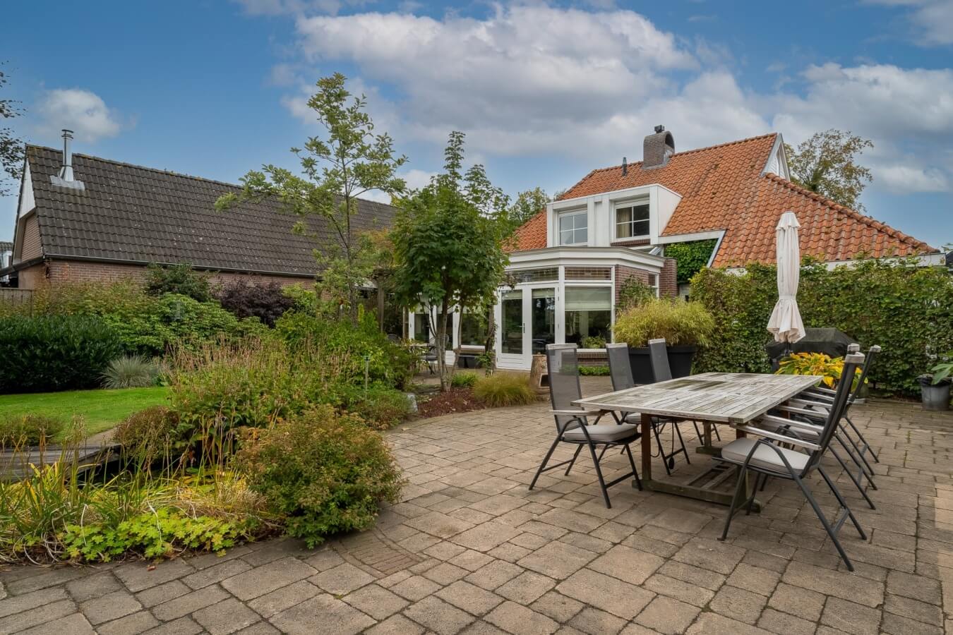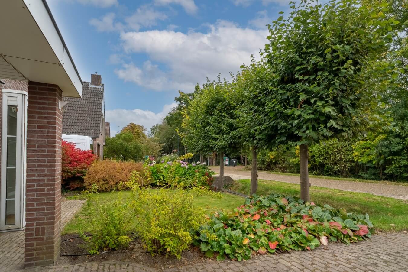 De tuin omsluit de woning en is fraai aangelegd met sierbestrating, gazon, volwassen bomen en een vijverpartij. Aan de achterzijde geniet je van vrij uitzicht over de aangrenzende weilanden, een idyllische plek waar rust en natuur samenkomen. Een tuinhuisje biedt extra bergruimte, en dankzij de royale afmetingen van het perceel is er altijd wel een zonnig plekje te vinden.