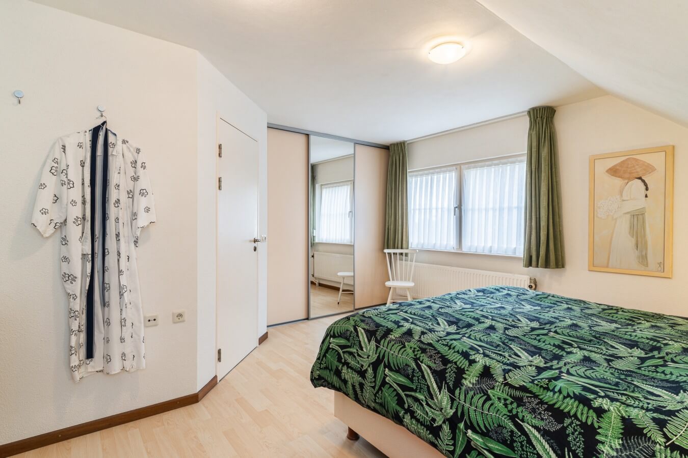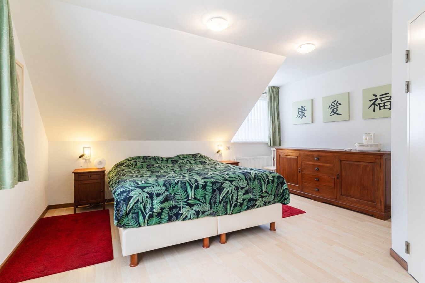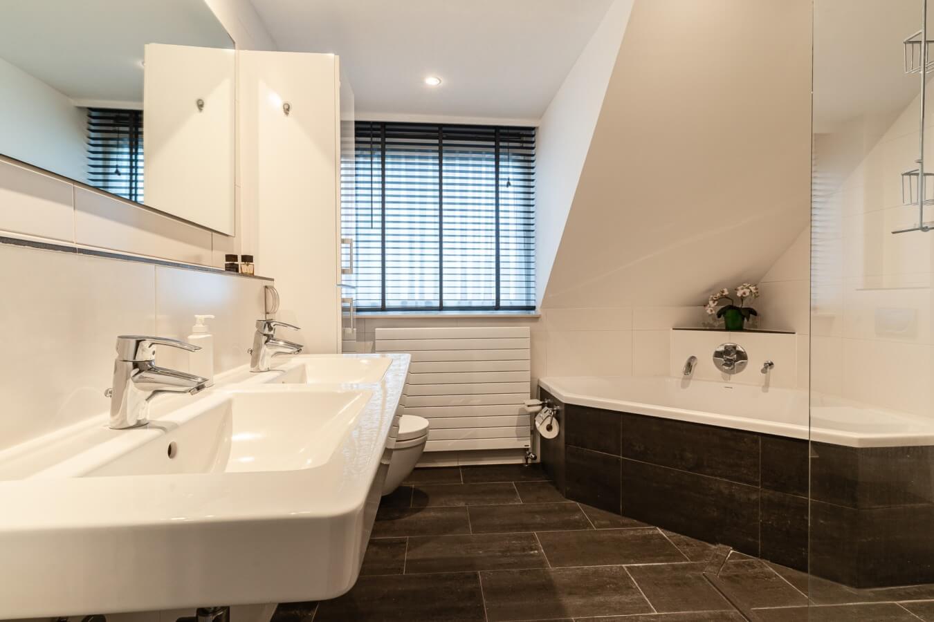 De overloop met laminaatvloer geeft toegang tot drie ruime slaapkamers, allen voorzien van laminaat en deels met vaste kasten, een van de slaapkamers aan de achterzijde beschikt bovendien over een wastafel. De badkamer is compleet uitgerust met ligbad, inloopdouche, dubbele wastafelmeubel en toilet.