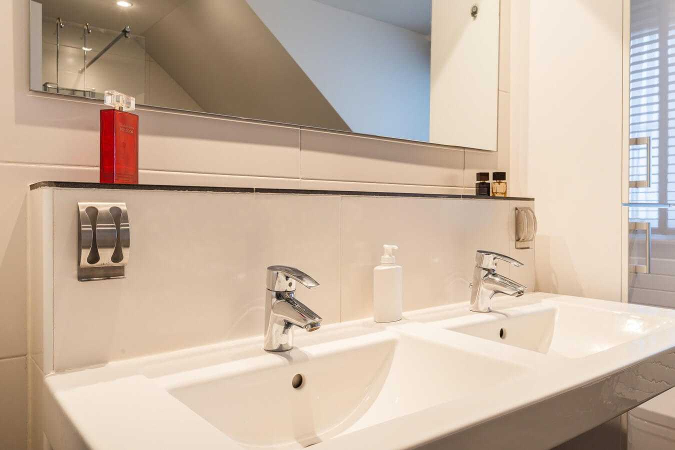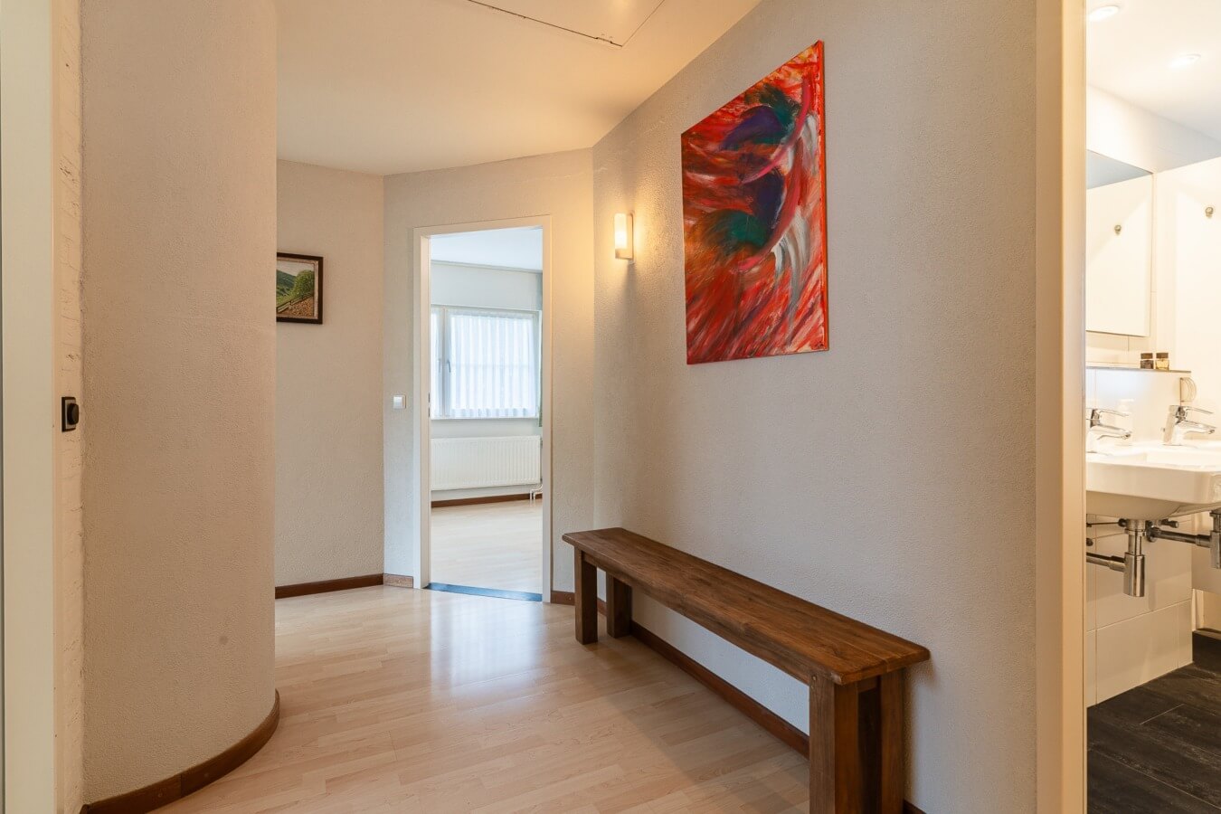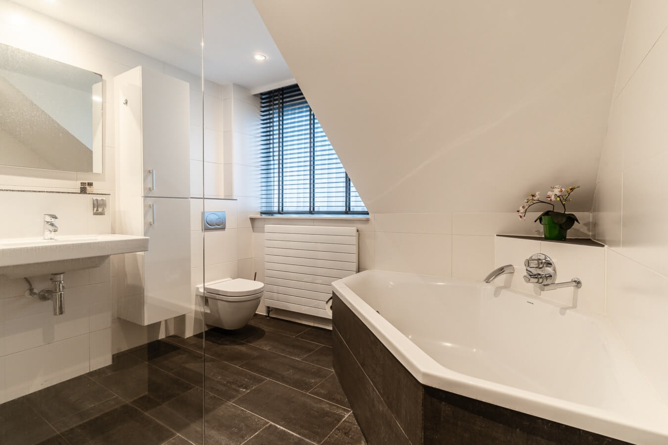 De overloop met laminaatvloer geeft toegang tot drie ruime slaapkamers, allen voorzien van laminaat en deels met vaste kasten, een van de slaapkamers aan de achterzijde beschikt bovendien over een wastafel. De badkamer is compleet uitgerust met ligbad, inloopdouche, dubbele wastafelmeubel en toilet.