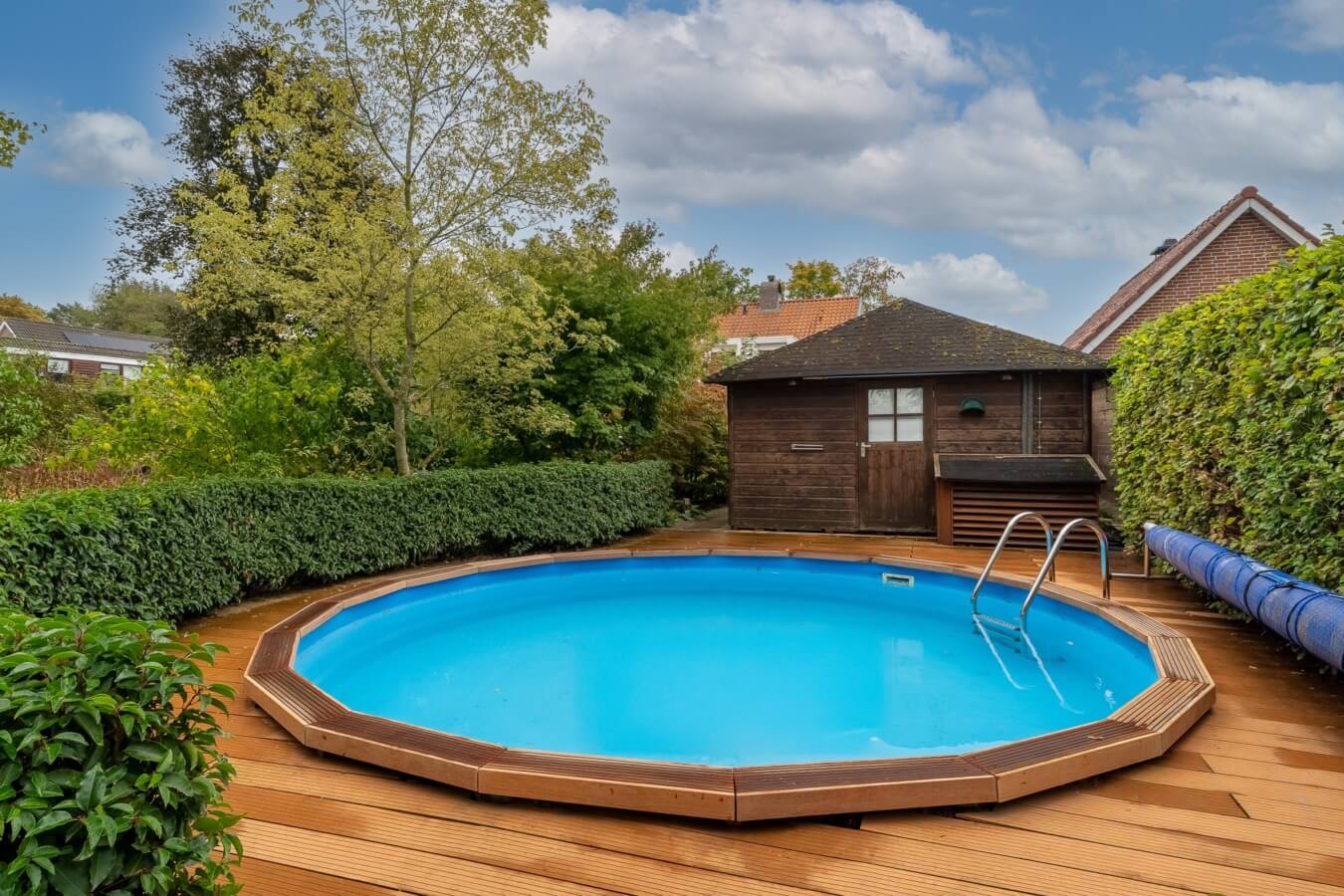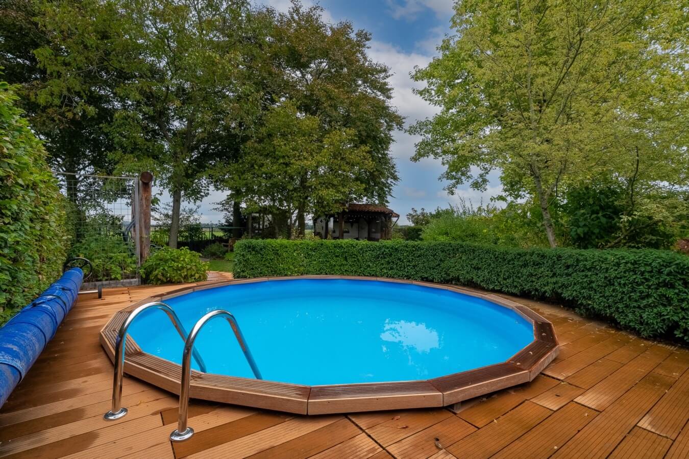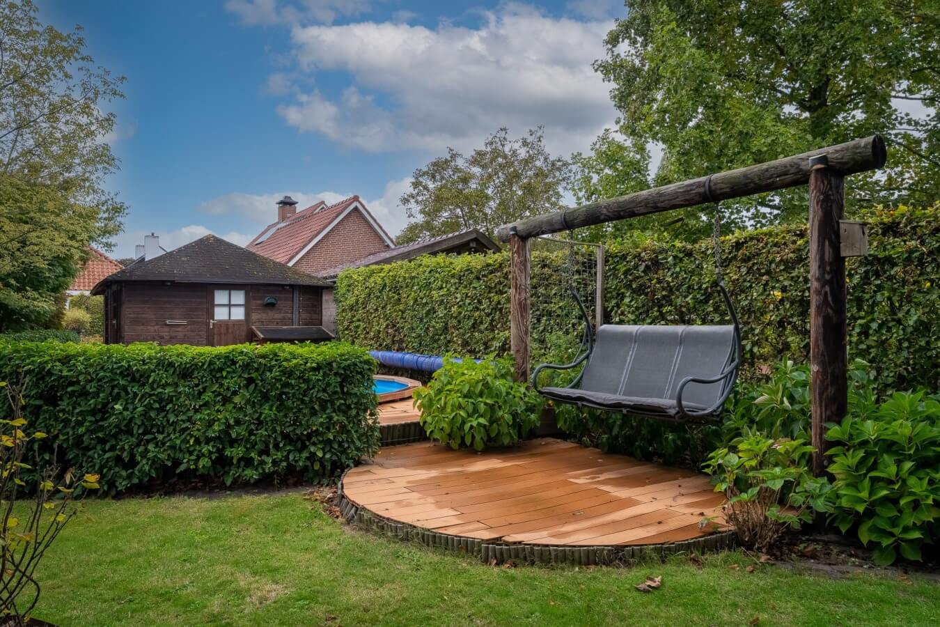In het midden van de tuin is de wellnessruimte met infra rood sauna (ter overname), relaxruimte en het ronde ingebouwde buitenzwembad met kunststof vlonders.