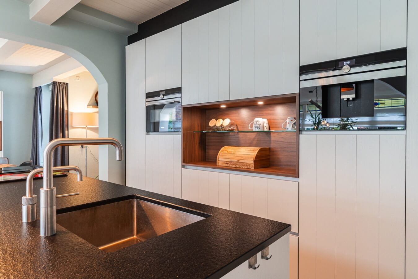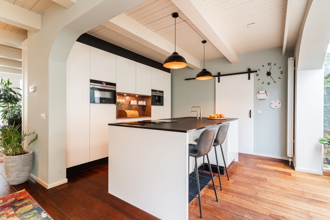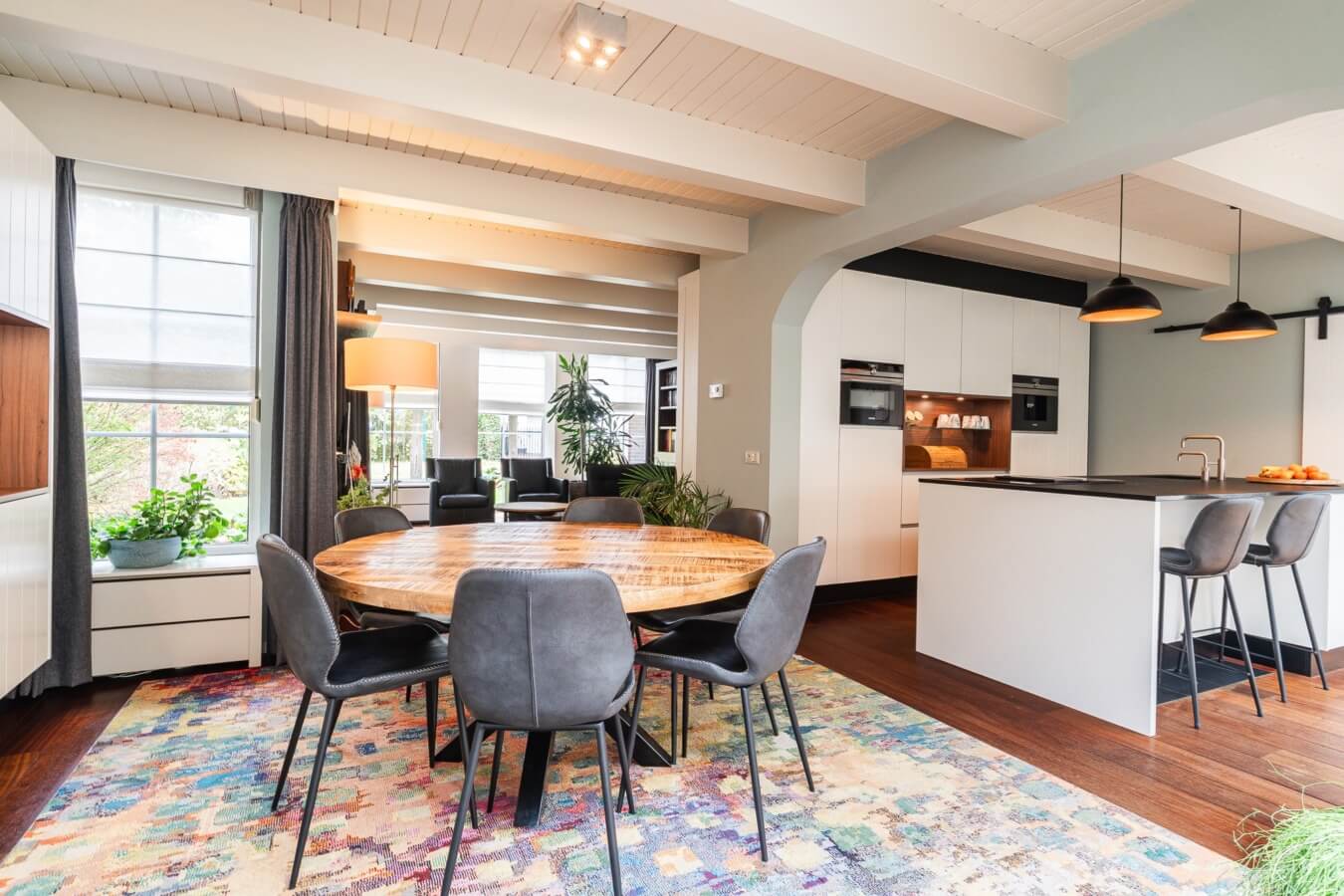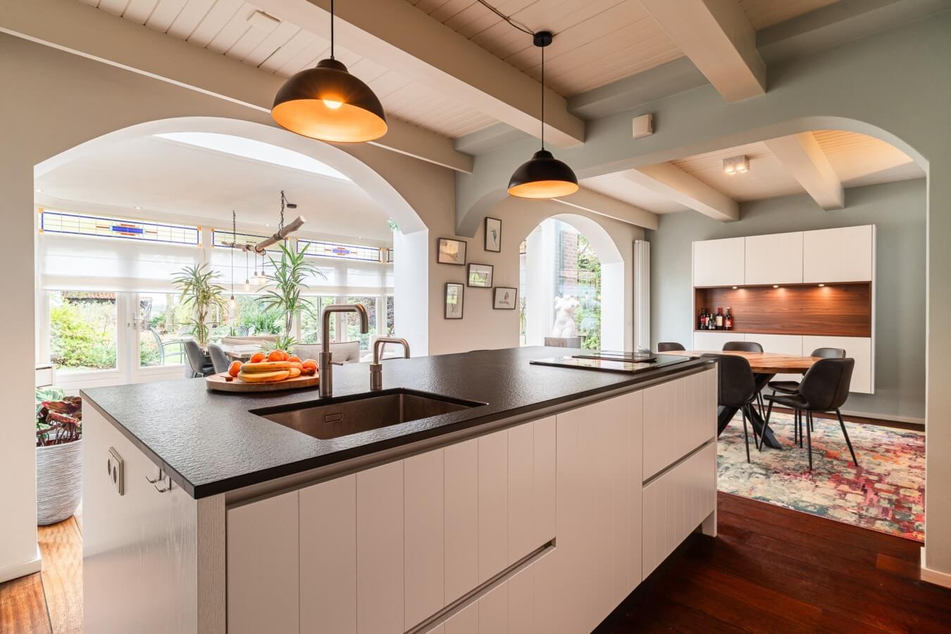 Centraal in de woonkamer ligt de open keuken, vernieuwd in 2021, met een losstaande opstelling en spoel/kookeiland. Vanuit hier heb je een prachtig uitzicht over de tuin. De keuken is voorzien van alle inbouwapparatuur en een stijlvol natuurstenen werkblad.