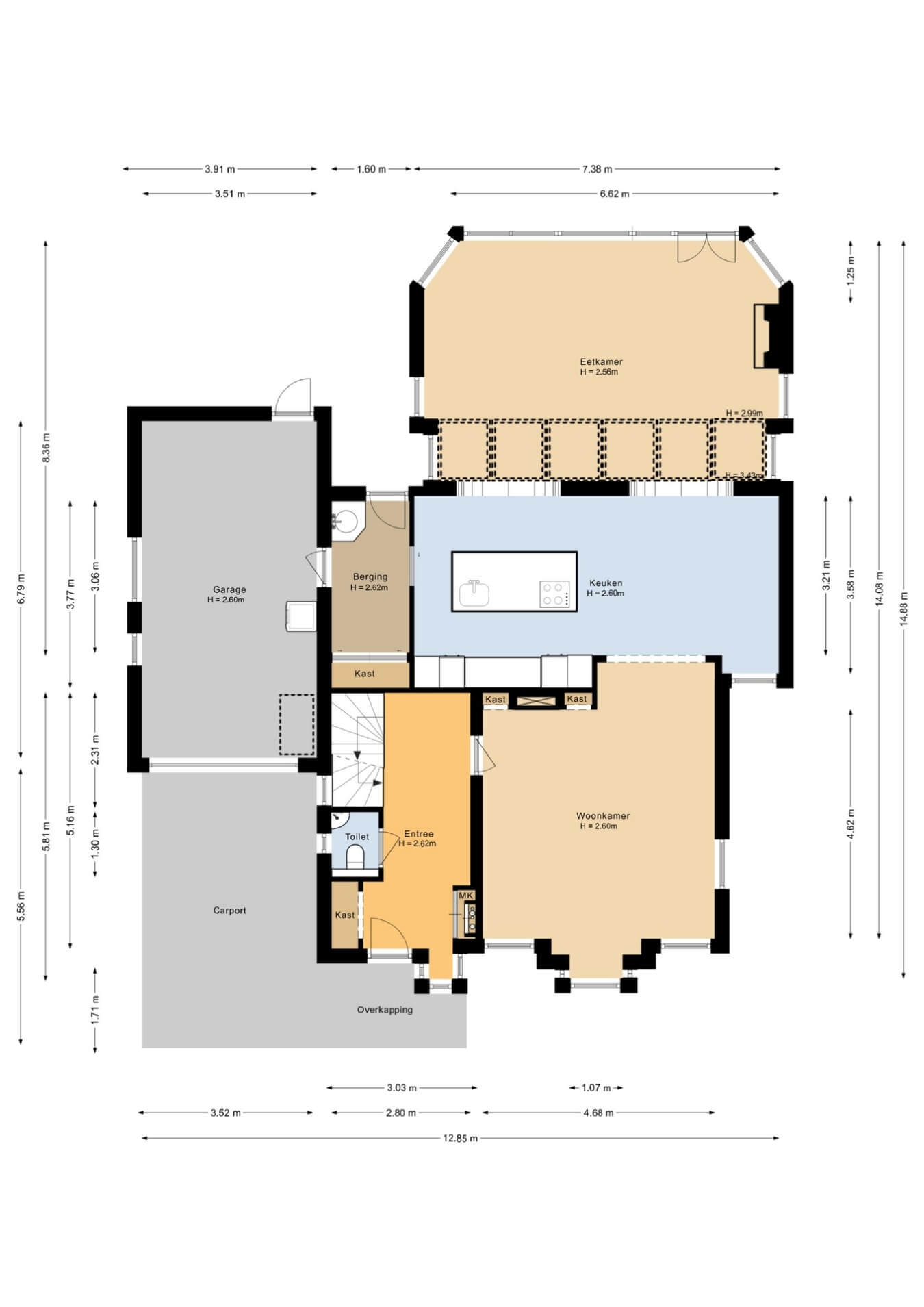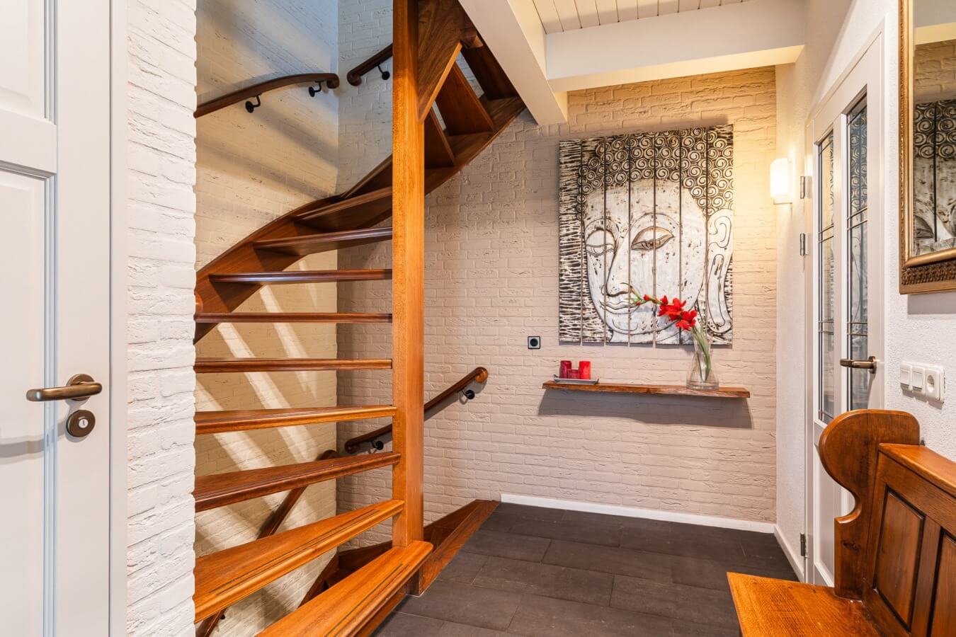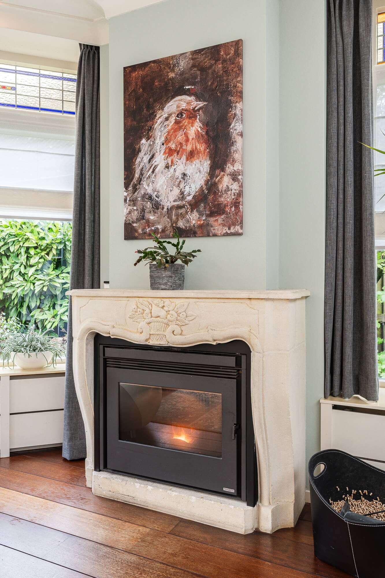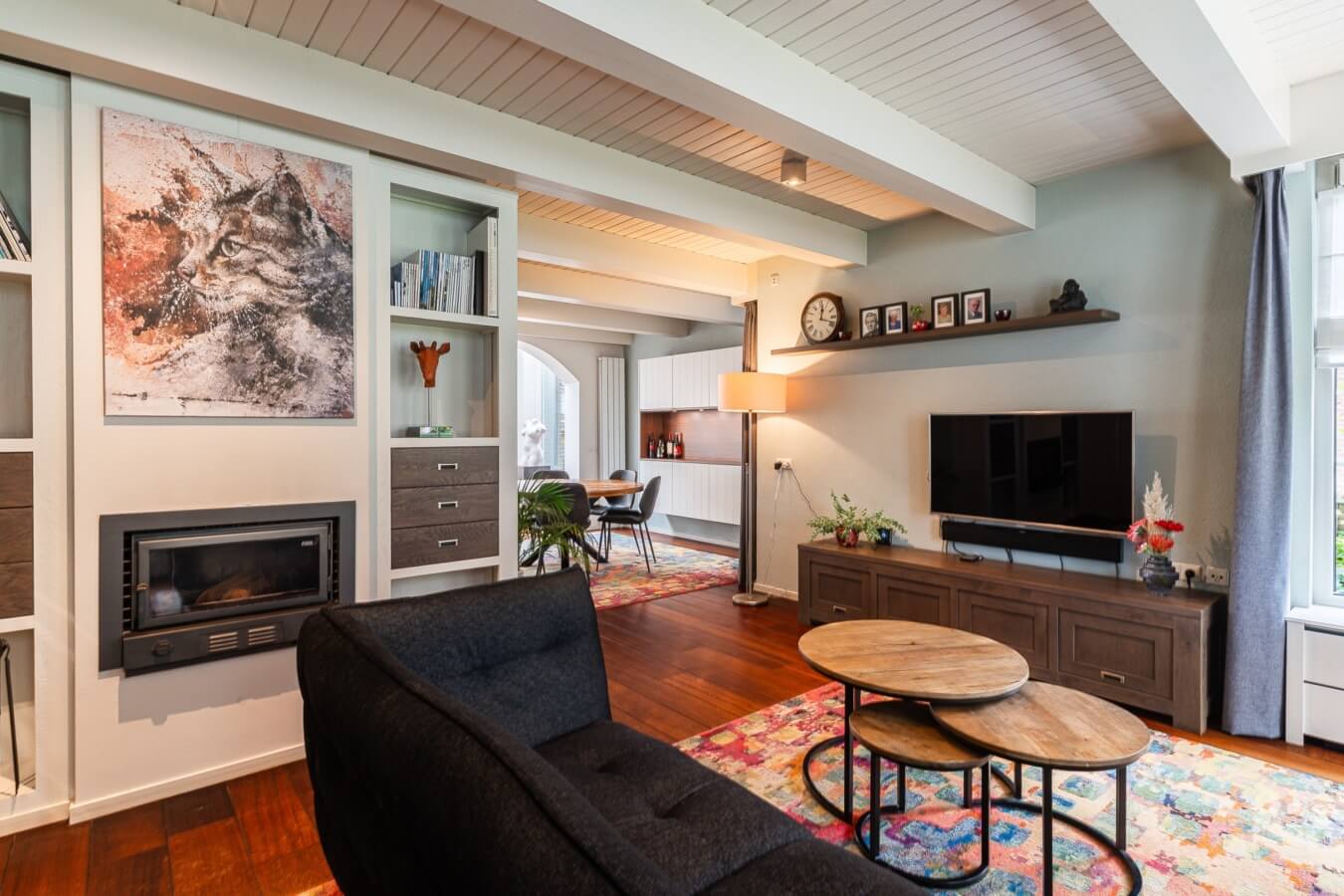 De entree is overdekt en leidt naar een stijlvolle hal met betegelde vloer, garderobenis en toilet met fonteintje. Via een glas-in-lood deur betreed je de woonkamer, die direct een gevoel van warmte en karakter oproept. Aan de voorzijde bevindt zich een erker en een open haard (merk Flame), terwijl het lichte balkenplafond en de gestucte wanden zorgen voor een charmante uitstraling.