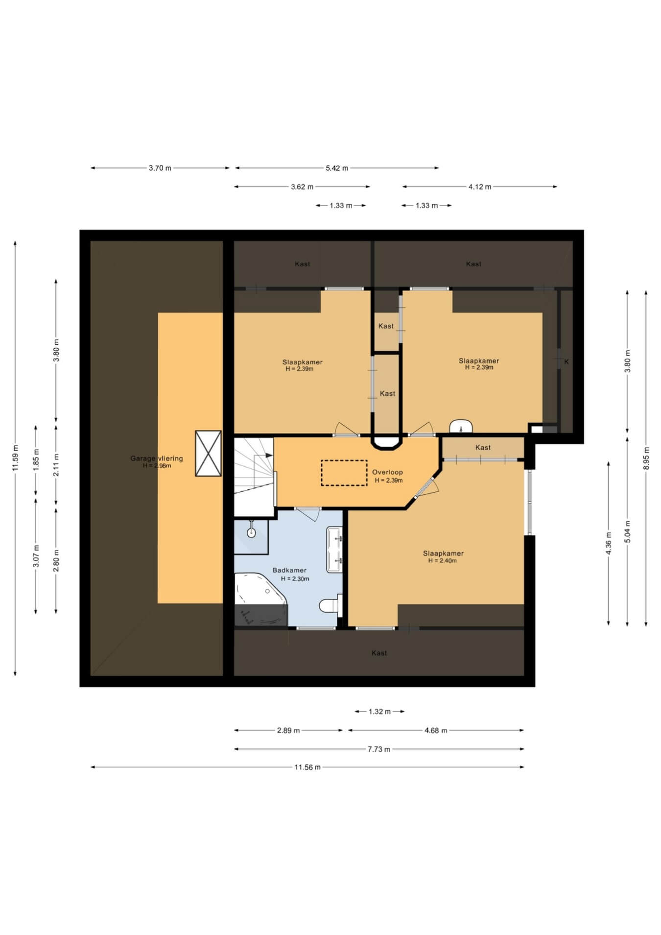 Aansluitend bevindt zich de bijkeuken met wasmachineaansluiting en vaste kast. De inpandige garage is voorzien van krachtstroom, verwarming en een vliering bereikbaar via een vaste trap.