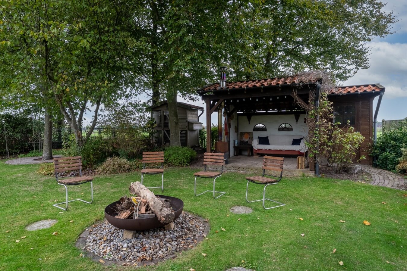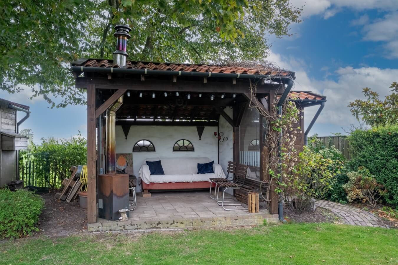 Aan de achterzijde van de tuin in een overkapping met een extra berging en nog een vuurplaats voor de heerlijke zomeravonden, zelfs de kippen achter in de ren hebben een fantastisch uitzicht over de landerijen.