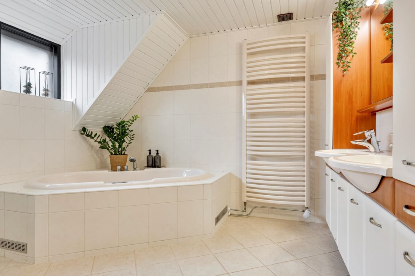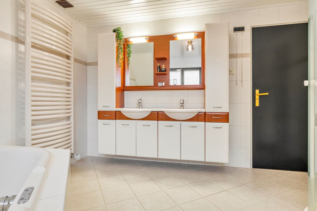 De ruime, volledig betegelde badkamer met dakkapel is luxe uitgevoerd en uitgerust met elektrische vloerverwarming, een hoek whirlpoolbad, douche, dubbele wastafel met meubel, designradiator en toilet.