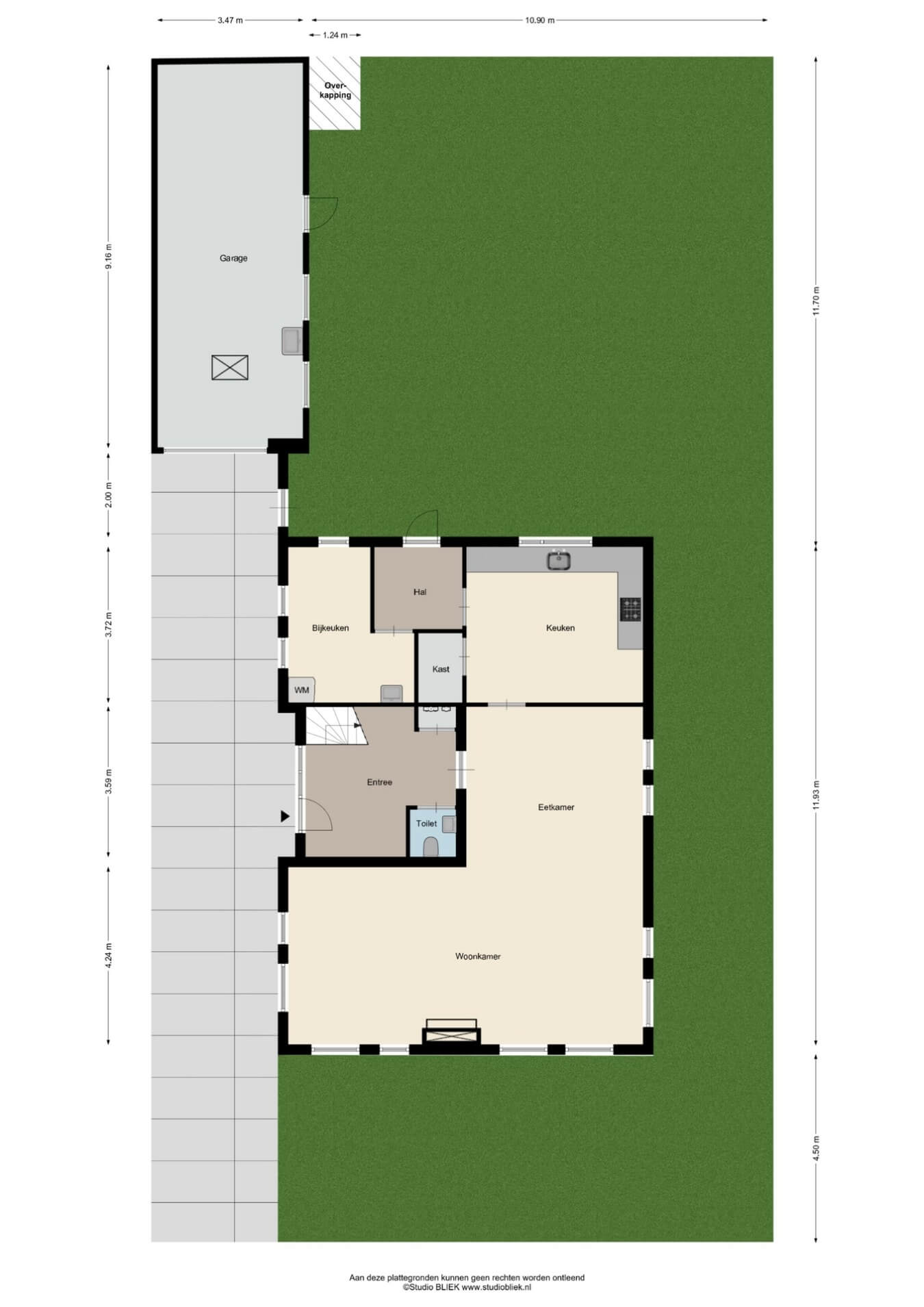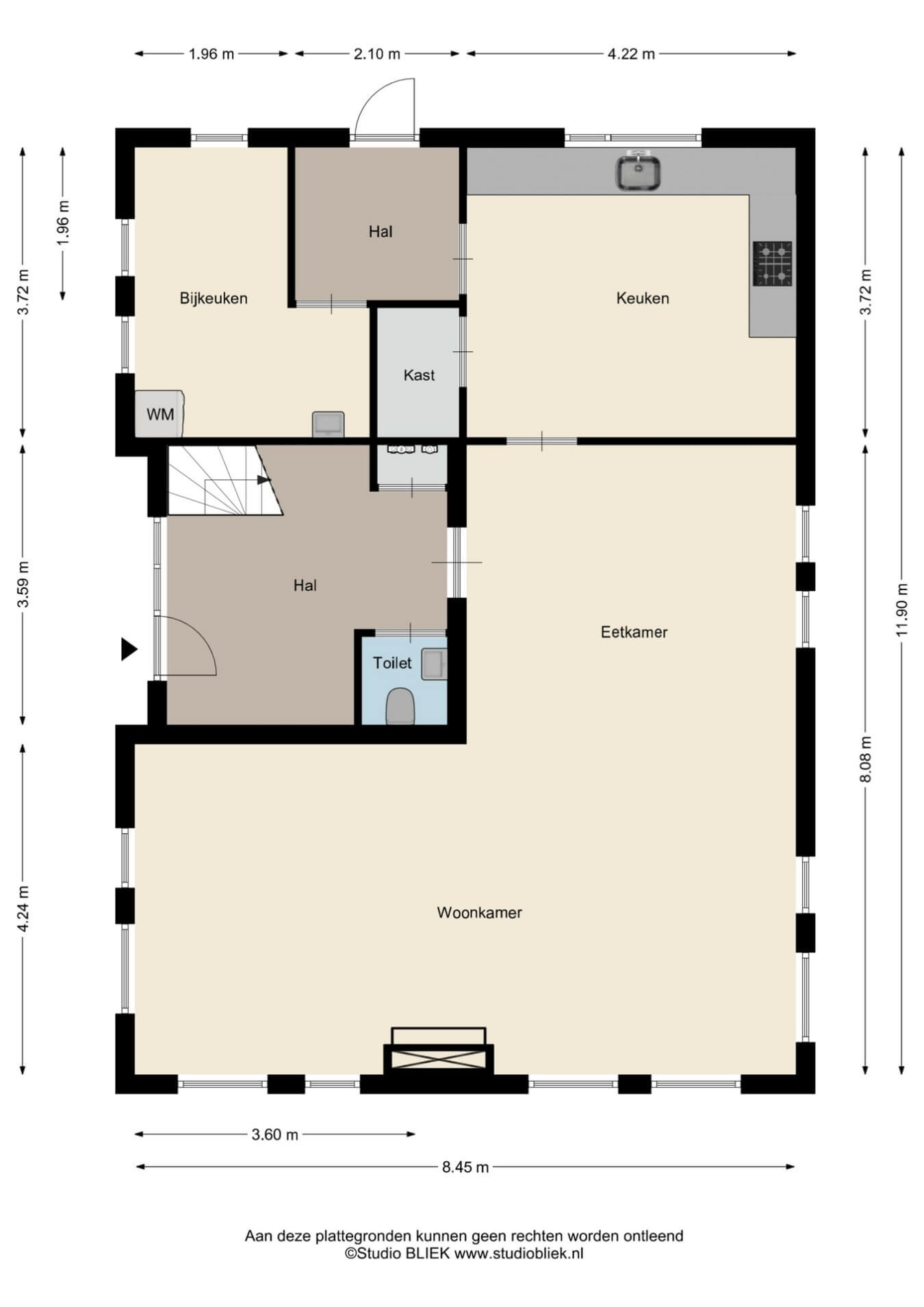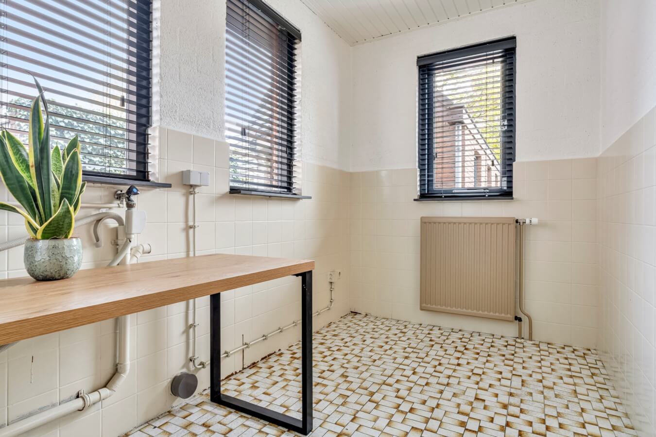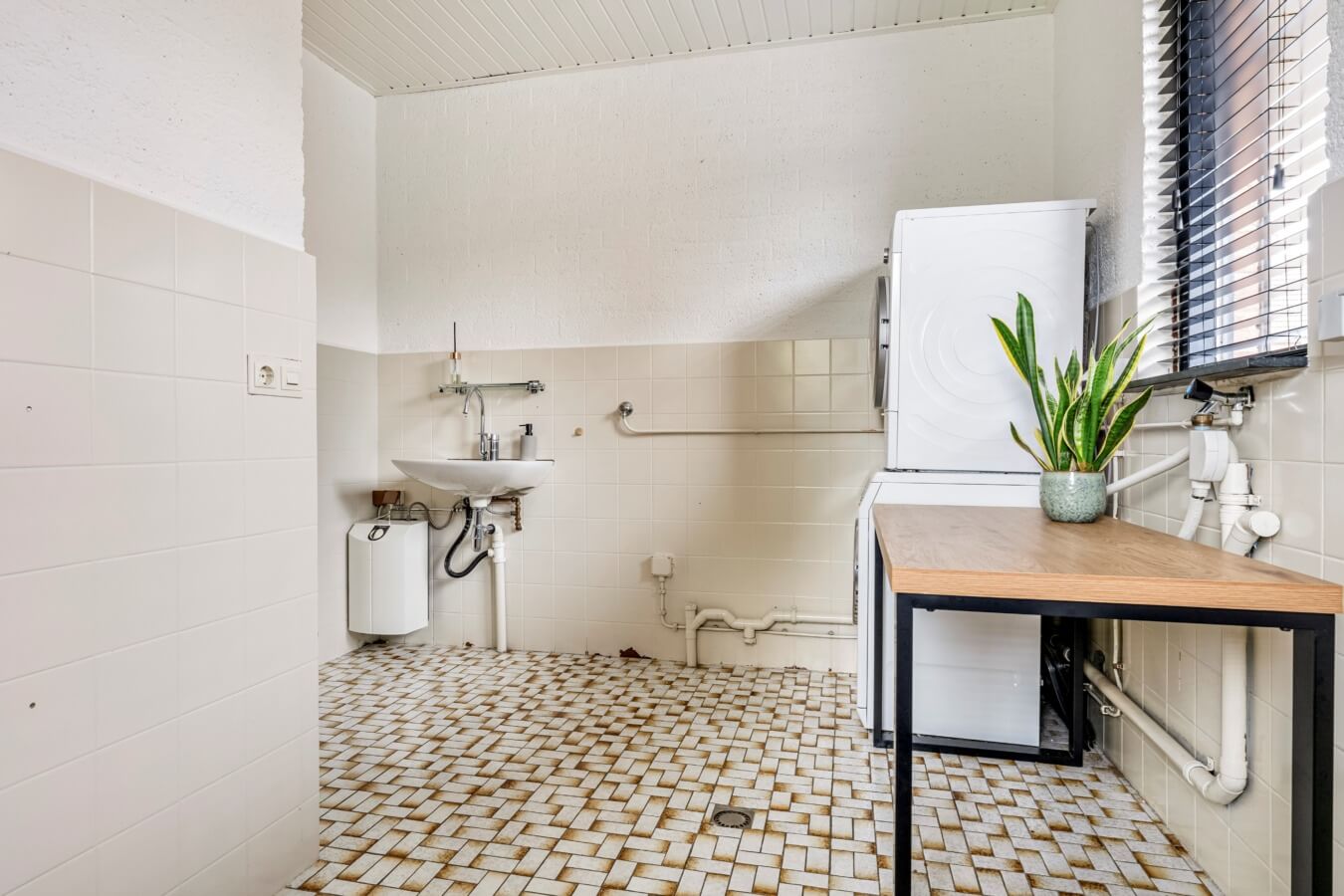 Achter de keuken bevindt zich een tweede hal met toegang naar buiten en doorgang naar de bijkeuken/wasruimte, voorzien van wastafel met boiler, spoelbak en aansluitingen voor wasapparatuur.