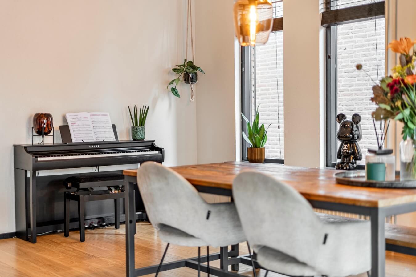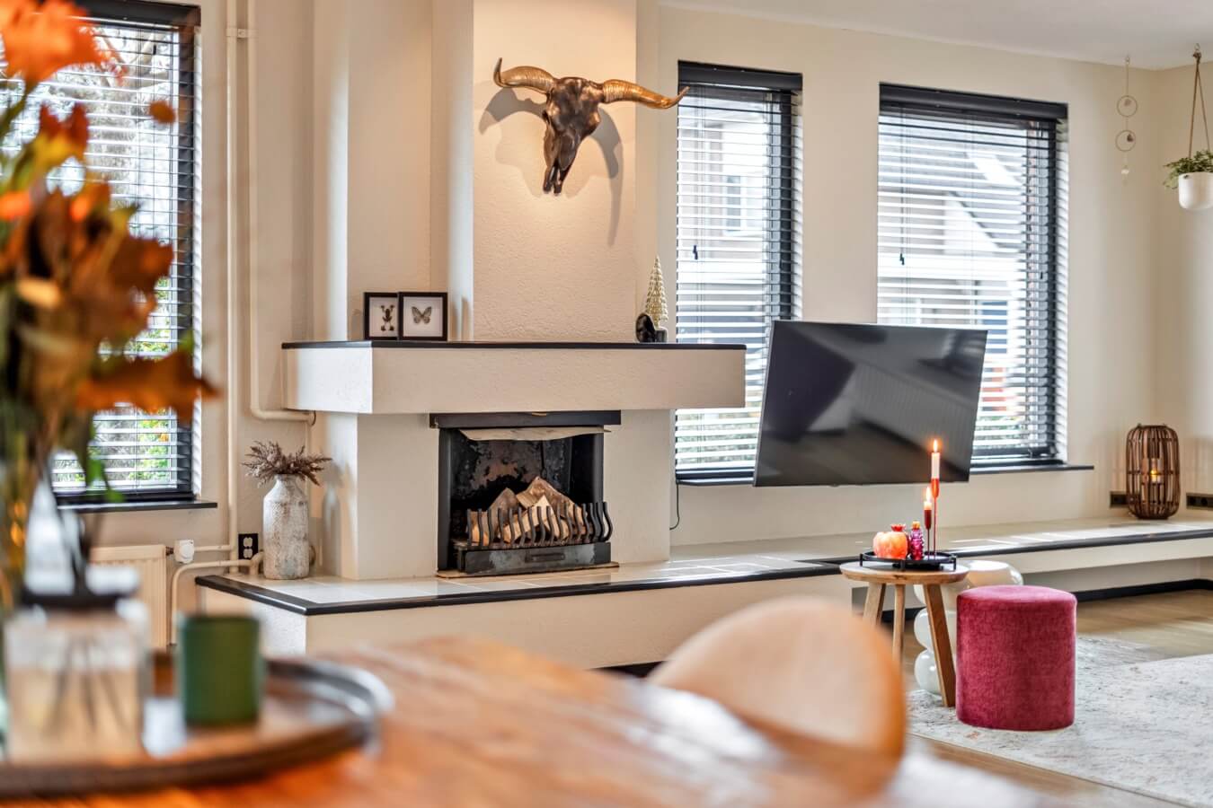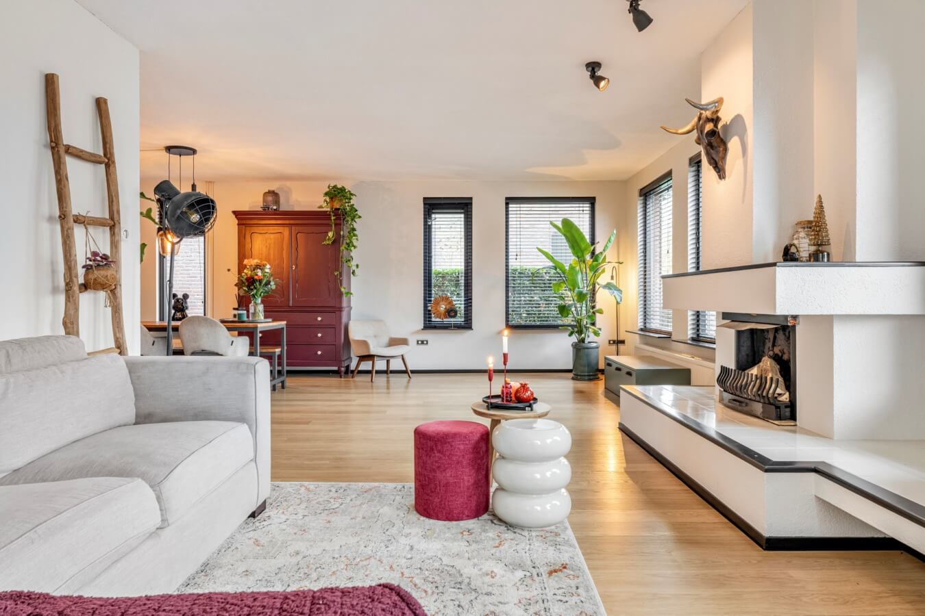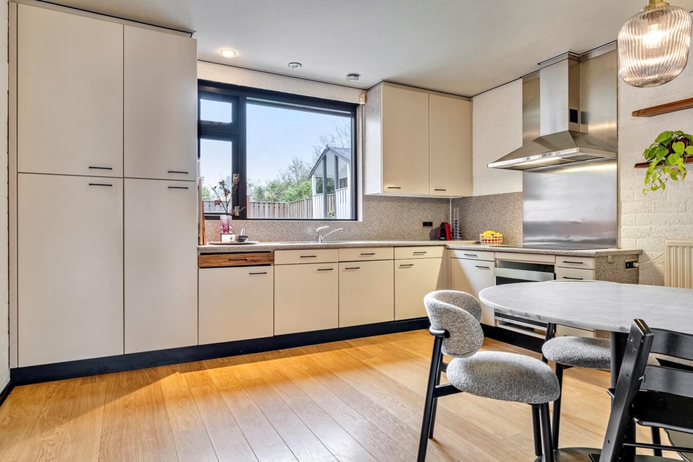De L-vormige woonkamer is een heerlijke, lichte ruimte met een open haard (weer functioneel te maken) en een laminaatvloer van hoogwaardige kwaliteit. Vanuit hier heb je toegang tot de woonkeuken, voorzien van een L-vormig keukenblok met apparatuur zoals een inductiekookplaat, combimagnetron, oven, inbouwkast met verlichting en de centrale schakelkast voor de elektrische rolluiken.