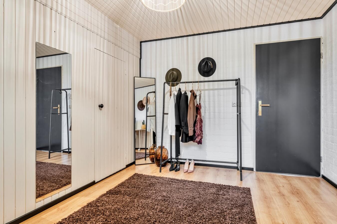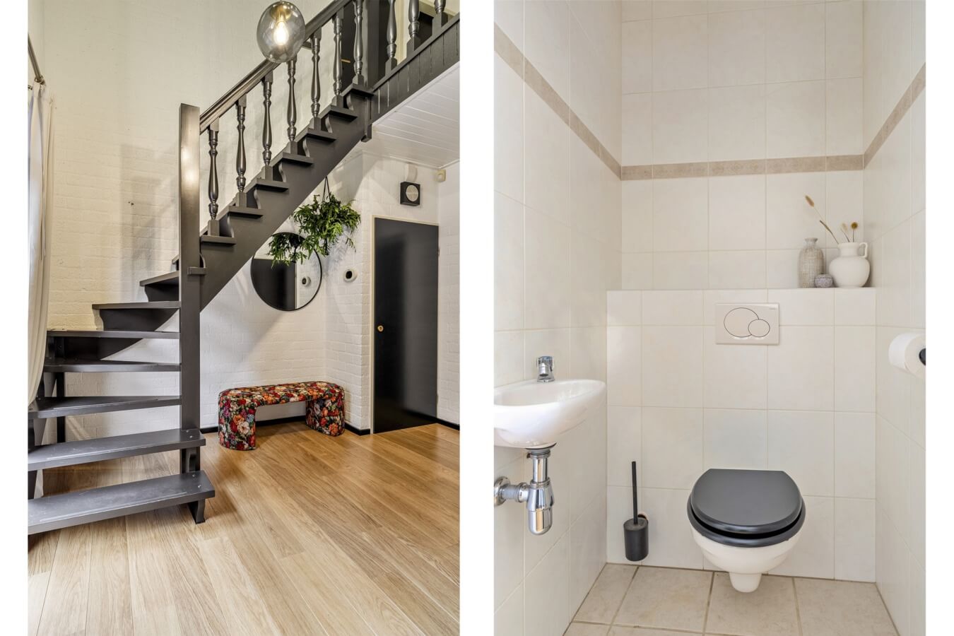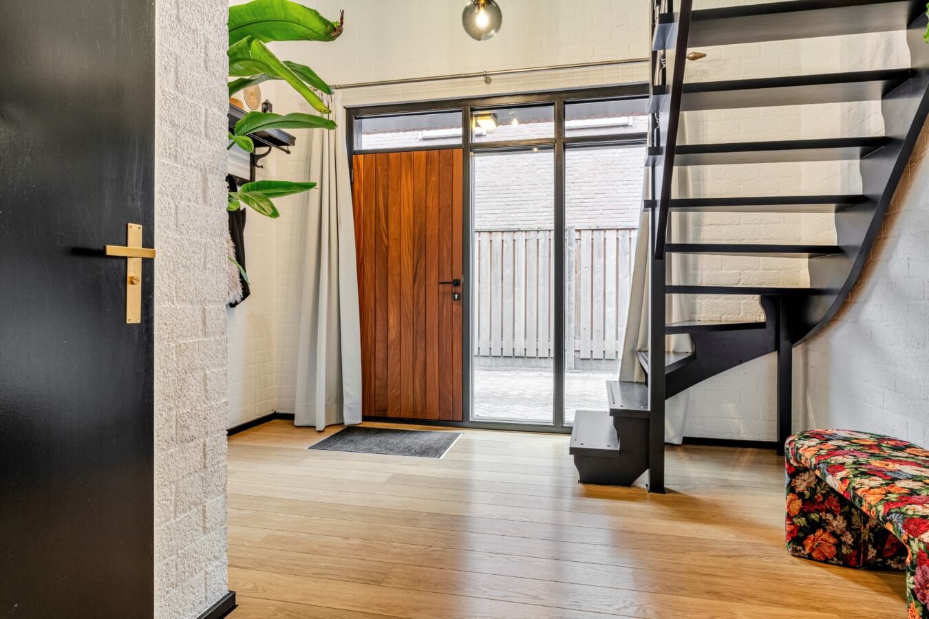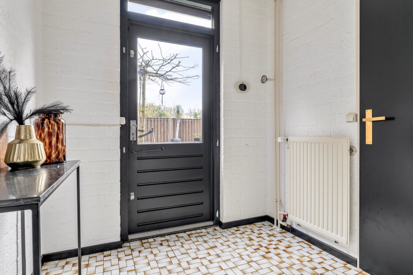 Via de lange oprit bereik je de entree, met nieuwe hardhouten voordeur, aan de linkerzijde van de woning. Binnenkomend in de ruime hal met vide valt direct de royale lichtinval op, samen met de laminaatvloer, garderobe, meterkast en het volledig betegelde toilet.