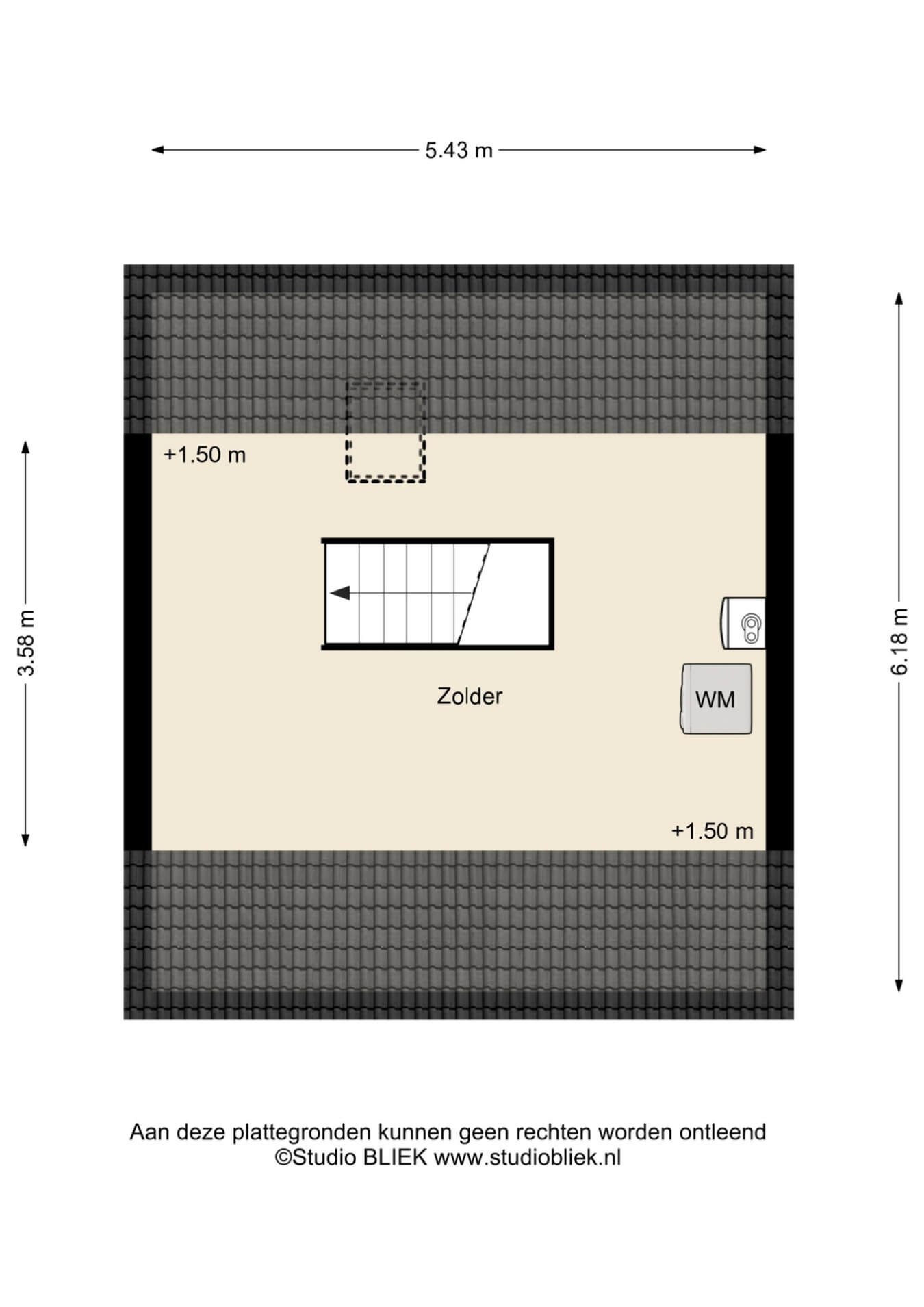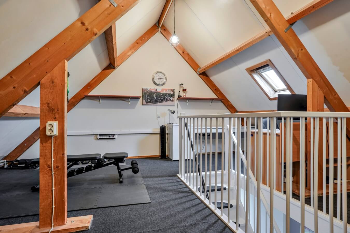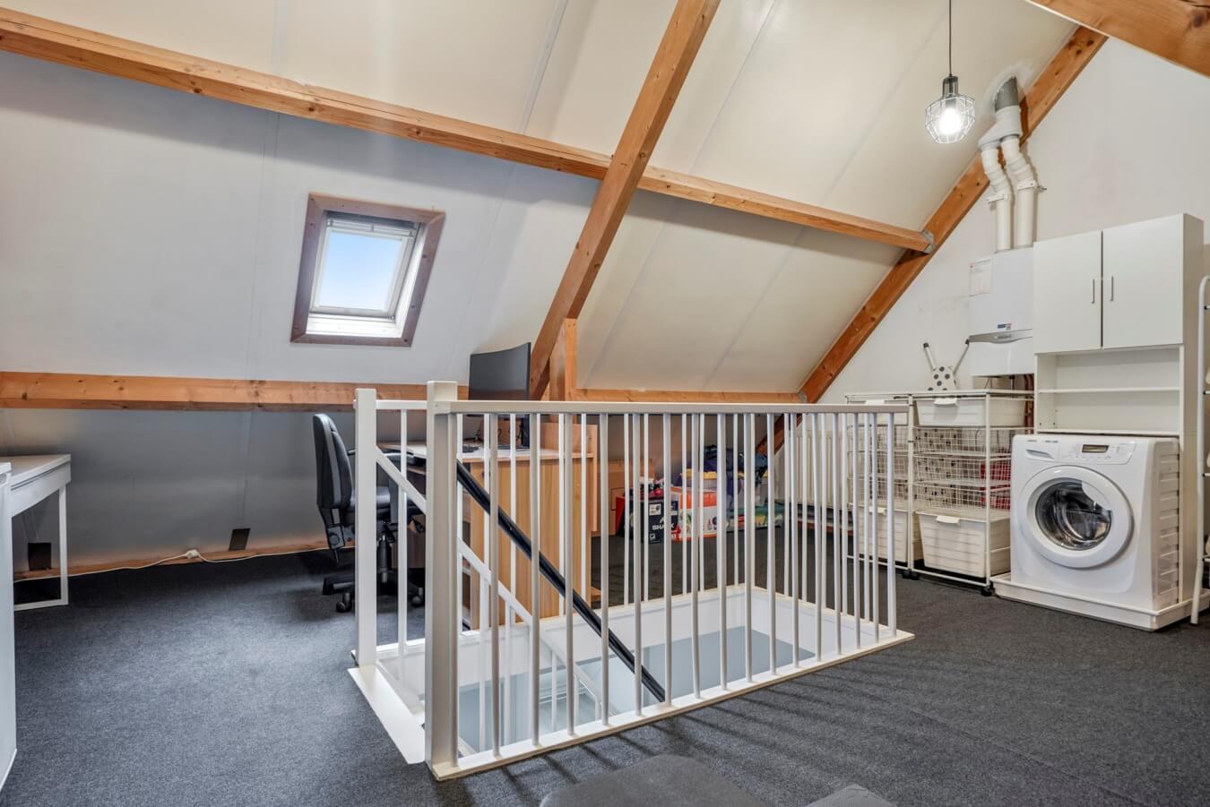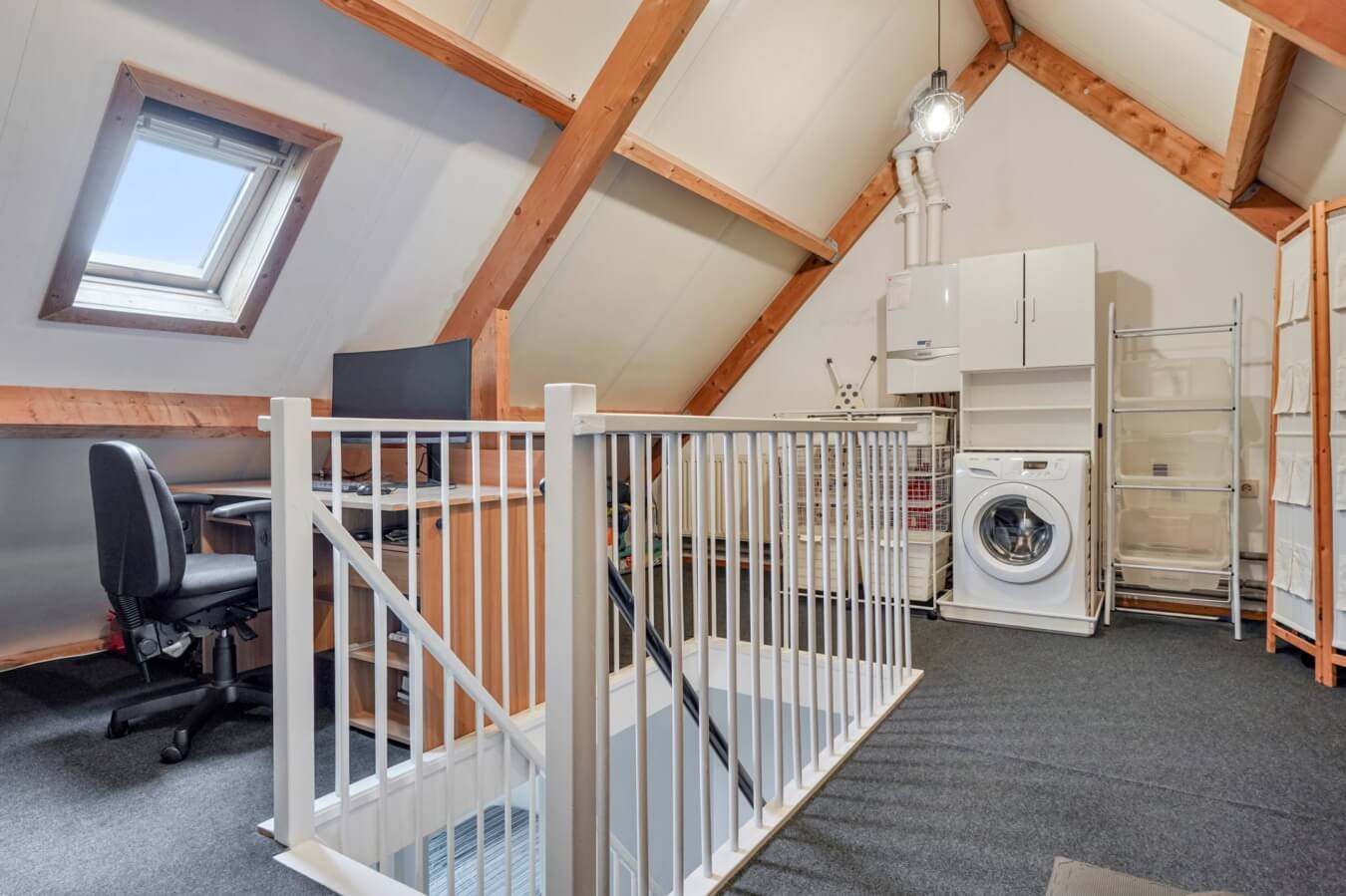 Met een vaste trap kom je op de tweede verdieping, waar je een grote open ruimte onder de sfeervolle houten balken van het schuine dak aantreft. De zolder is momenteel in gebruik als fitness- en wasruimte, met de aansluitingen voor wasapparatuur en de cv-ketel, maar dit kan ook een fijne vierde slaapkamer, werkzolder of hobbyruimte worden. Dankzij het dakraam valt hier aangenaam veel daglicht naar binnen.