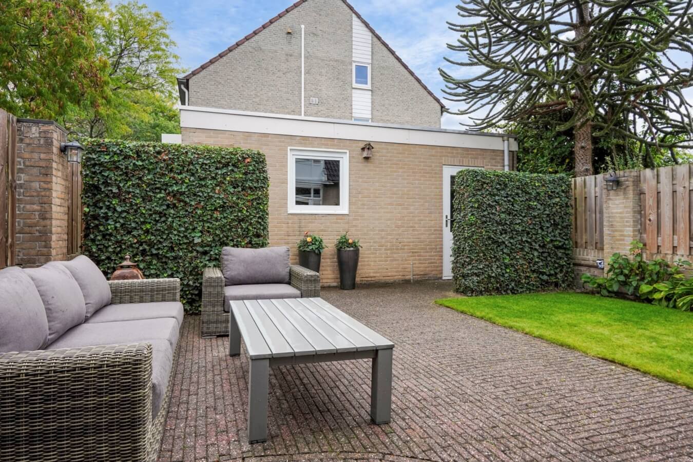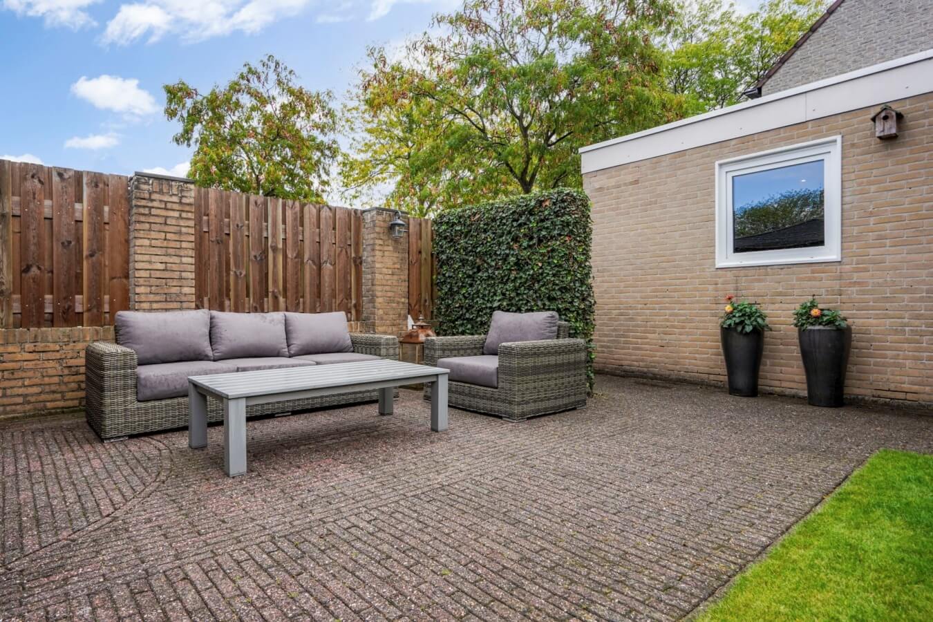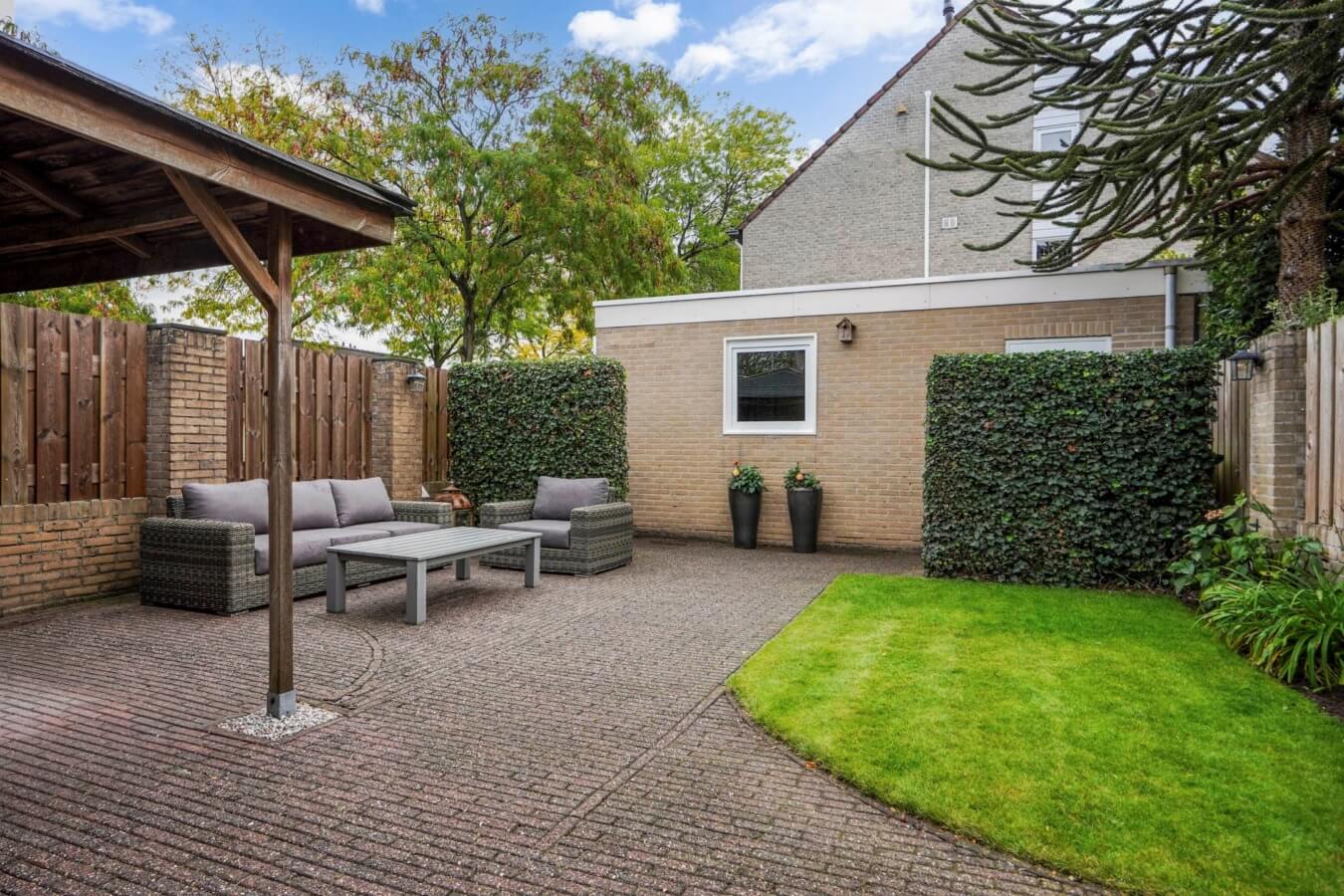 De tuin is absoluut een van de grote pluspunten van deze woning. De buitenruimte is heerlijk gelegen op het zuiden, met een ruim terras in de zon, een grasveld en een fijne overkapping waardoor je zelfs bij minder weer – het blijft tenslotte Nederland – lekker buiten kan zitten.