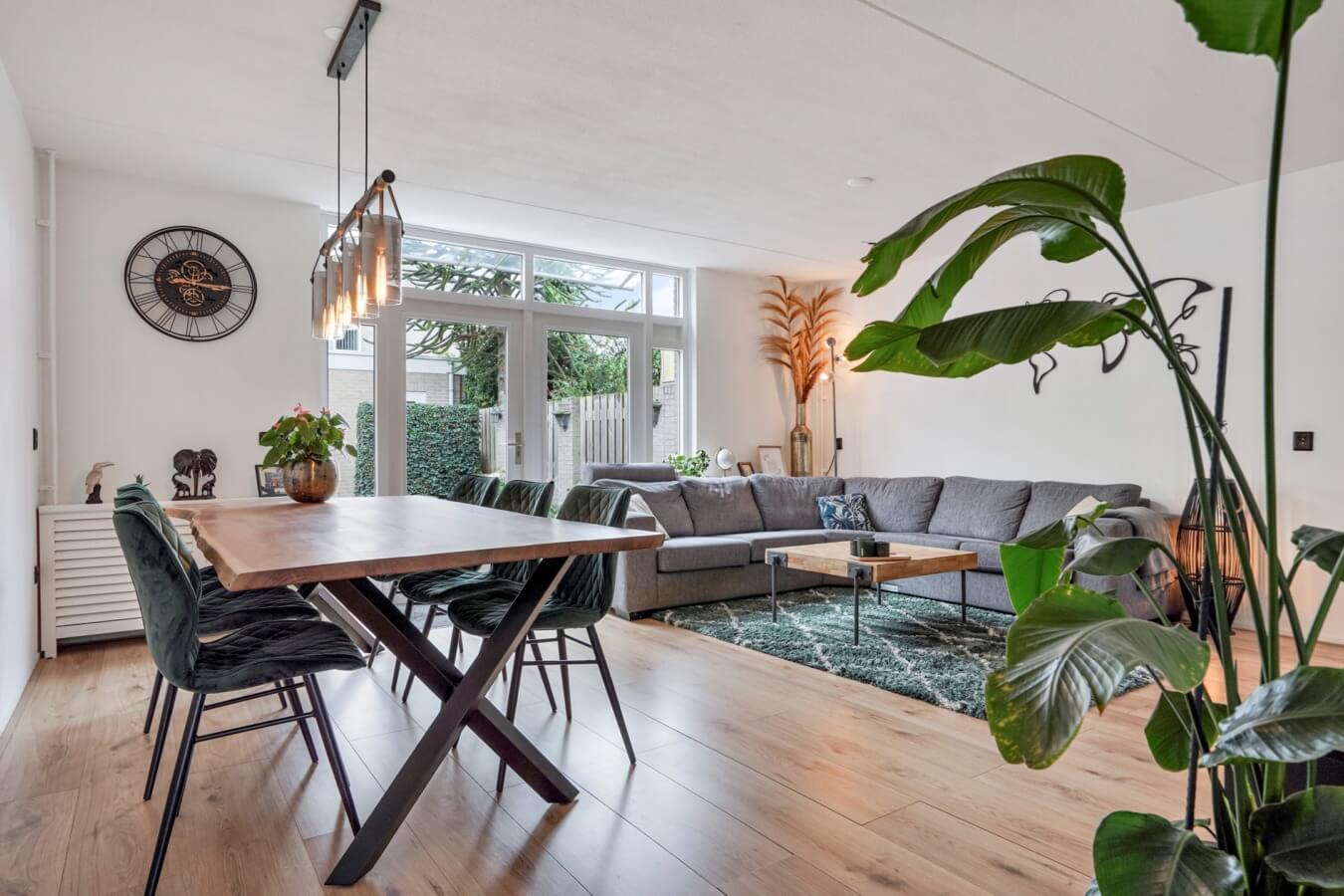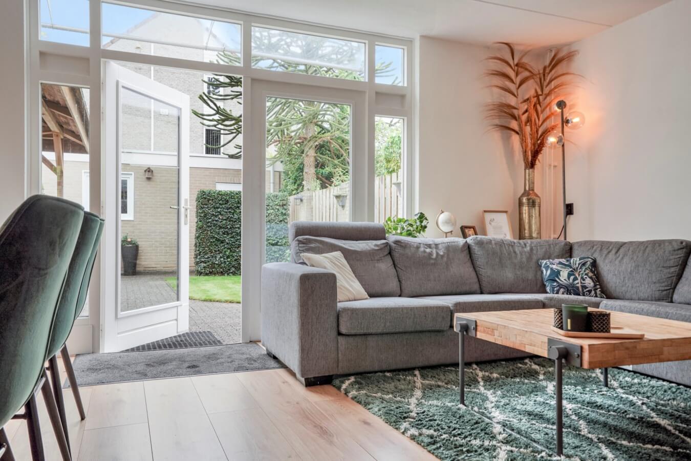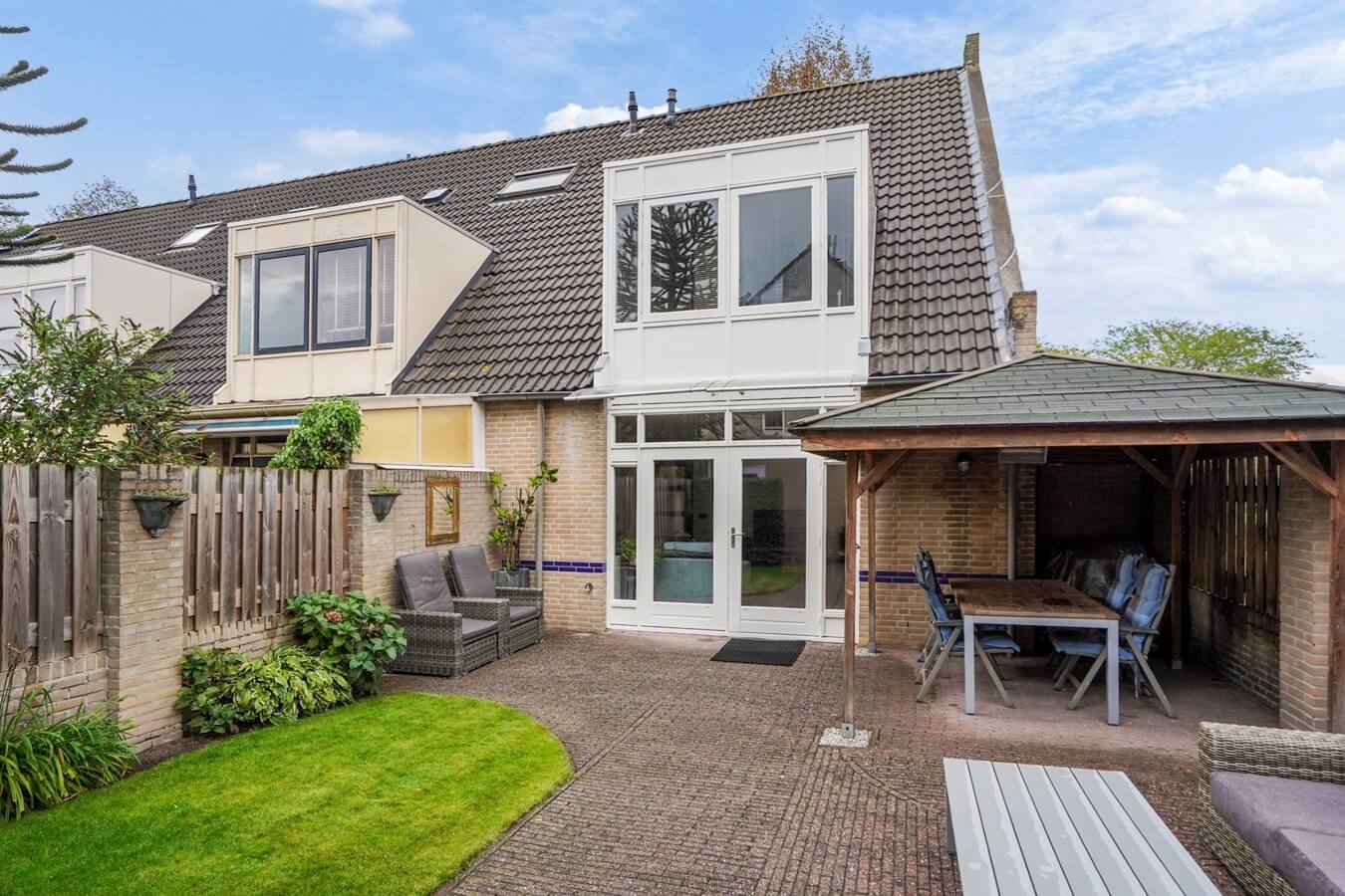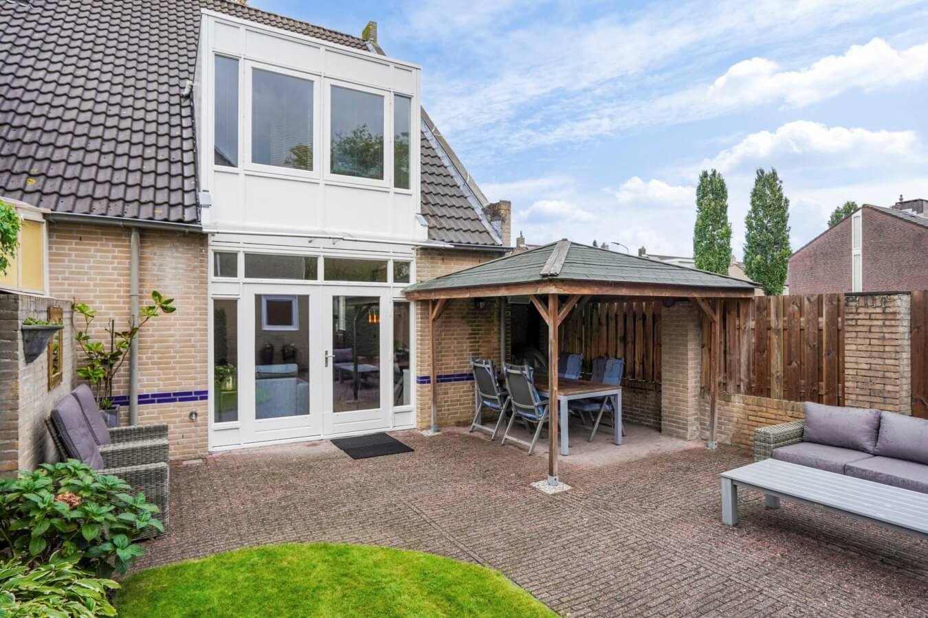 De tuin is absoluut een van de grote pluspunten van deze woning. De buitenruimte is heerlijk gelegen op het zuiden, met een ruim terras in de zon, een grasveld en een fijne overkapping waardoor je zelfs bij minder weer – het blijft tenslotte Nederland – lekker buiten kan zitten.