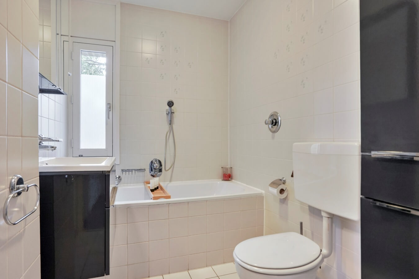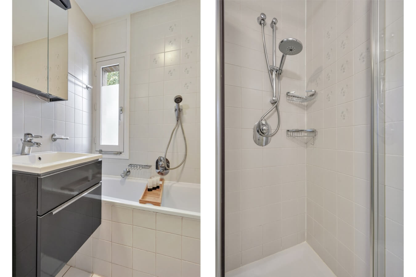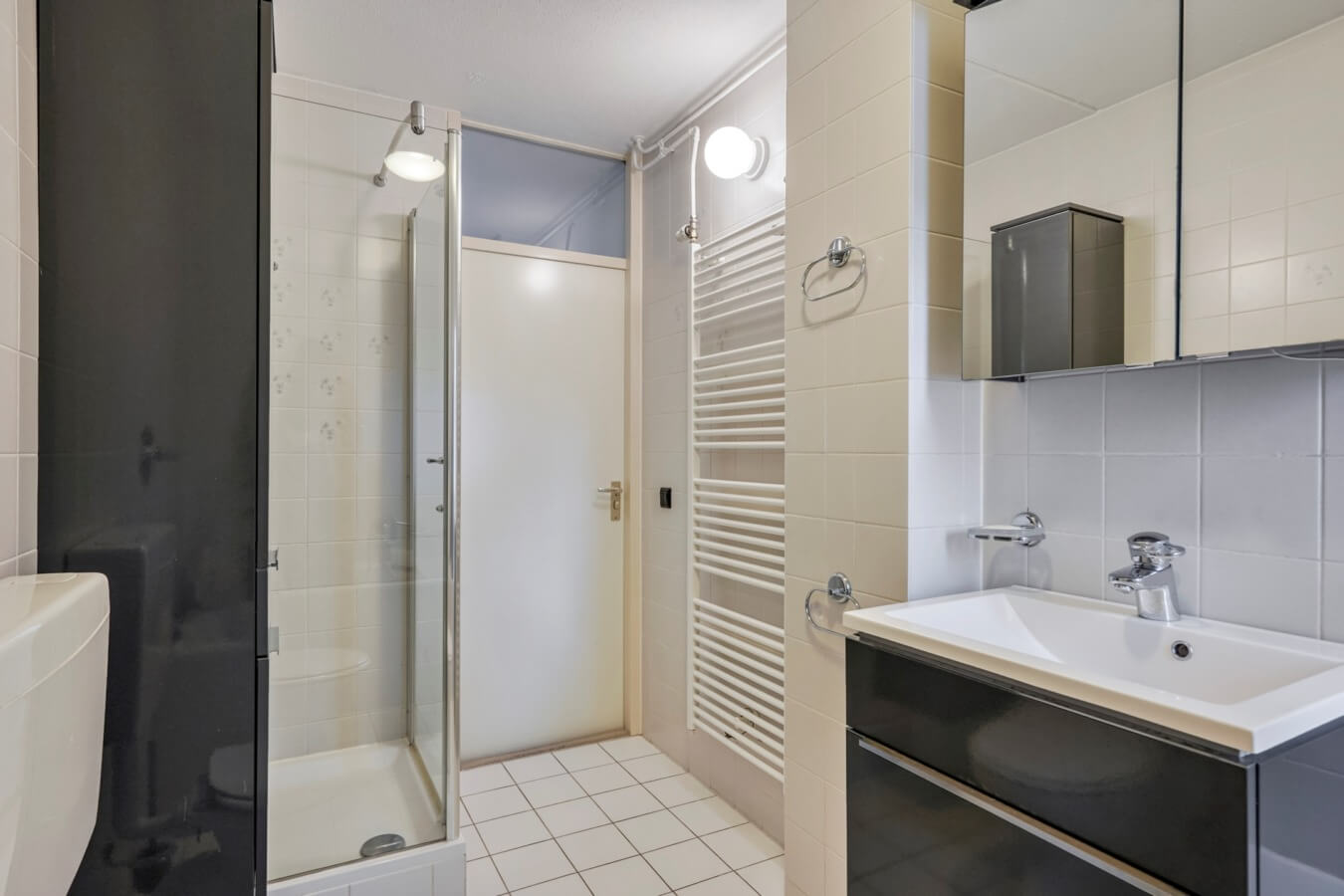 De nette badkamer ligt aan de rechter voorzijde van de verdieping en is voorzien van een ligbad, een douchecabine, een wastafelmeubel en een toilet. Ontspanning is hier gegarandeerd.