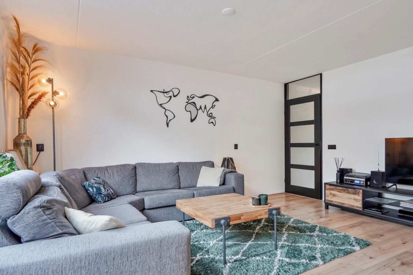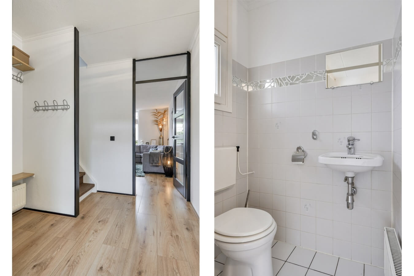 Via de netjes aangelegde voortuin stap je via een overdekte entree binnen in de ruime hal van de woning. Hier vind je het toilet met fonteintje, de trapopgang naar boven en toegang tot de woonkamer middels de stijlvolle zwarte deur.