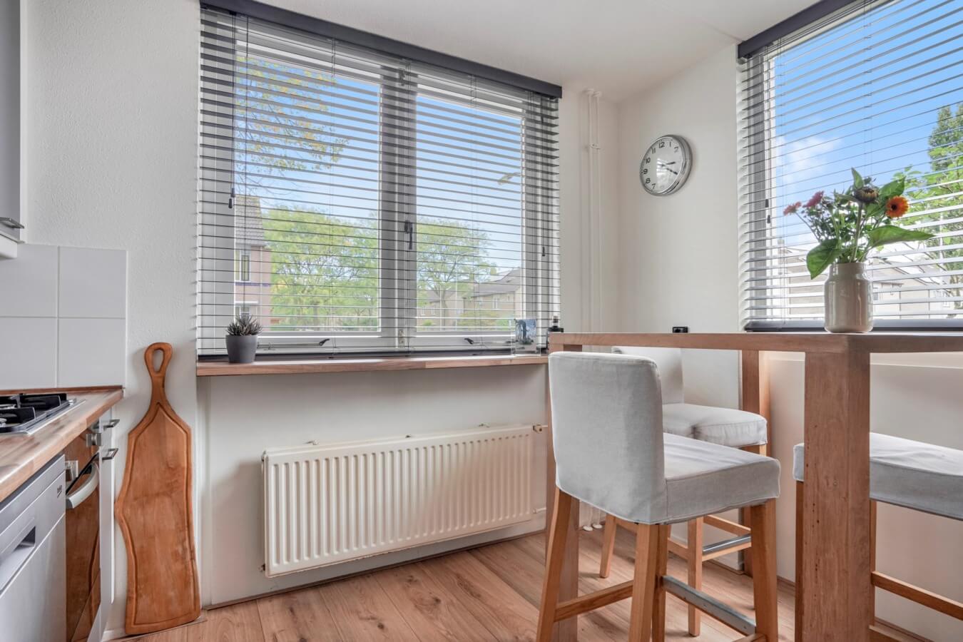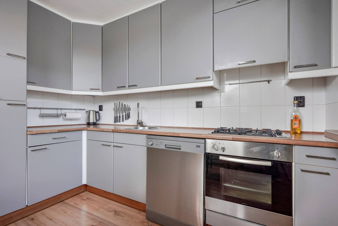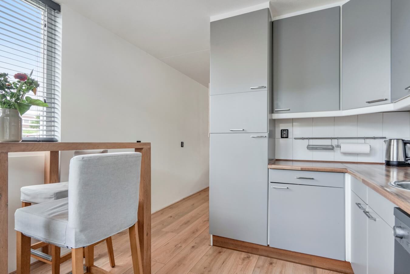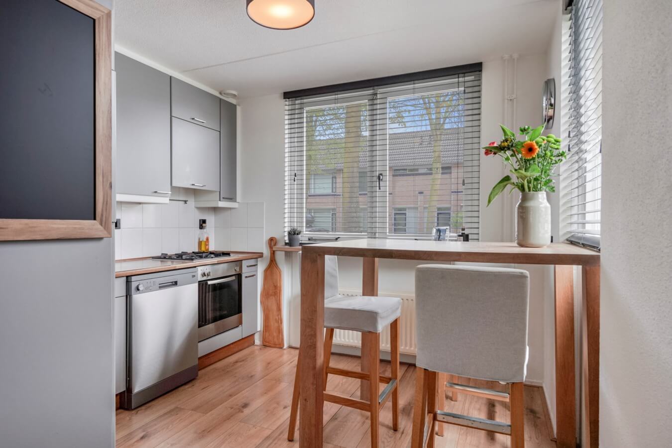 De halfopen, lichtgrijze keuken aan de voorzijde sluit prima aan bij de woonkamer. Dankzij de hoekopstelling heb je hier lekker veel werkblad en opbergruimte, en is alles verder aanwezig: een gaskookplaat, afzuigkap, koelkast, oven, vaatwasser en een spoelbak. Door de ruimtelijke opzet kan je hier, net als de huidige bewoner heeft gedaan, ook een leuke bartafel plaatsen, waardoor je tijdens het koken uitgebreid kan blijven kletsen met het gezelschap. Hoe leuk is dat?