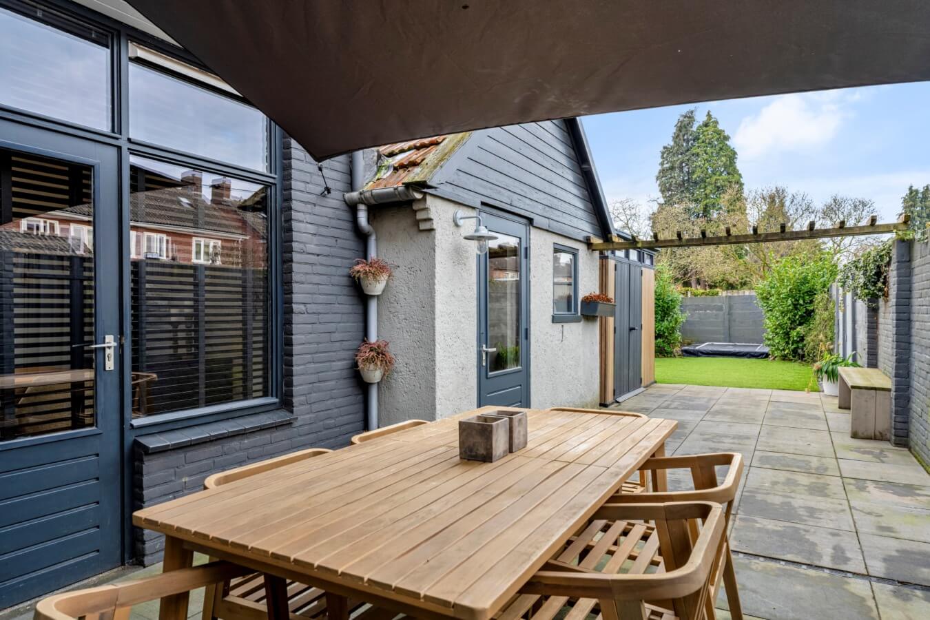 Precies: een groene tuin. Deze is heerlijk diep beschikt over een gaaf zonneterras, een groot grasveld en een handige berging voor fietsen en andere spullen.