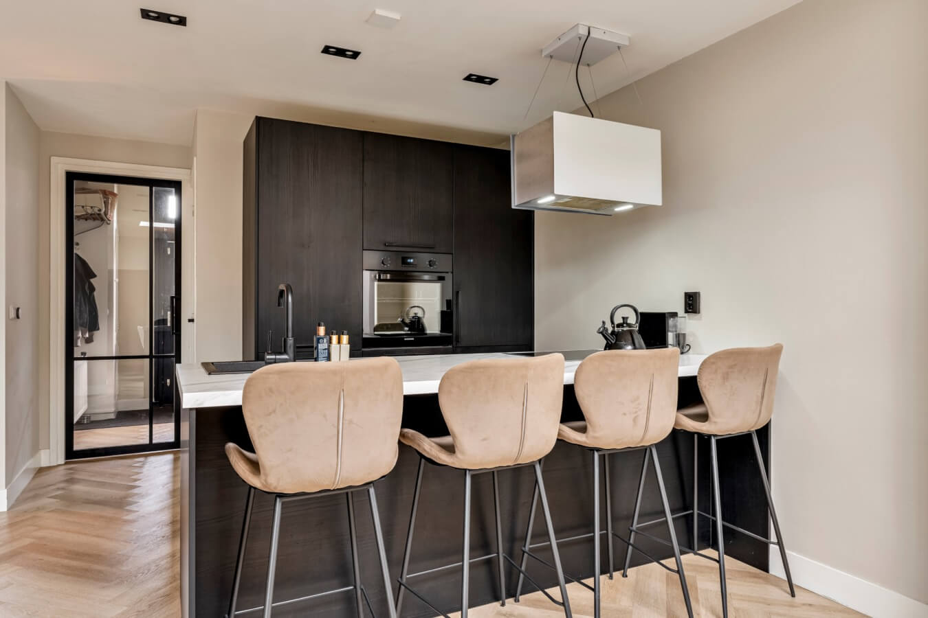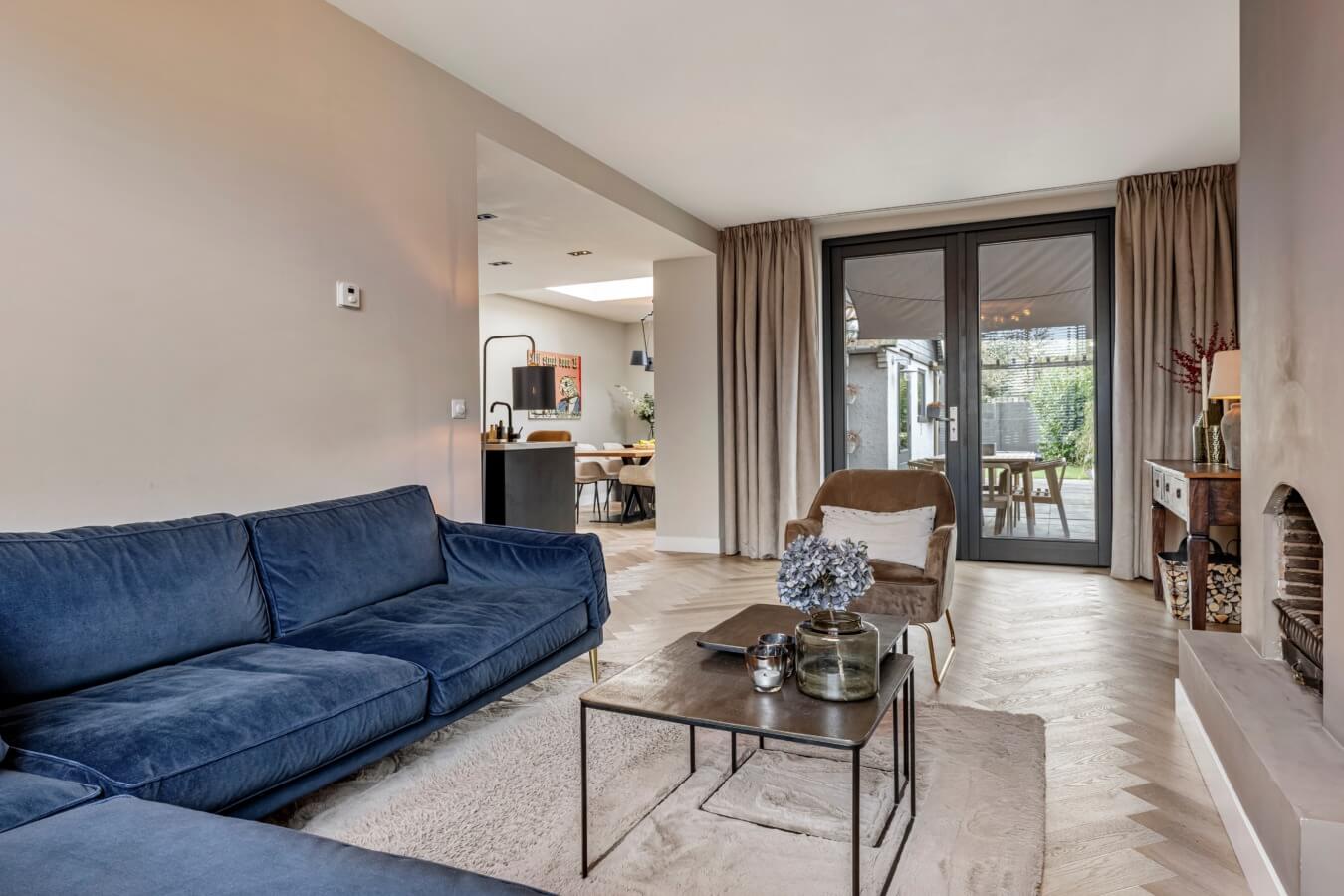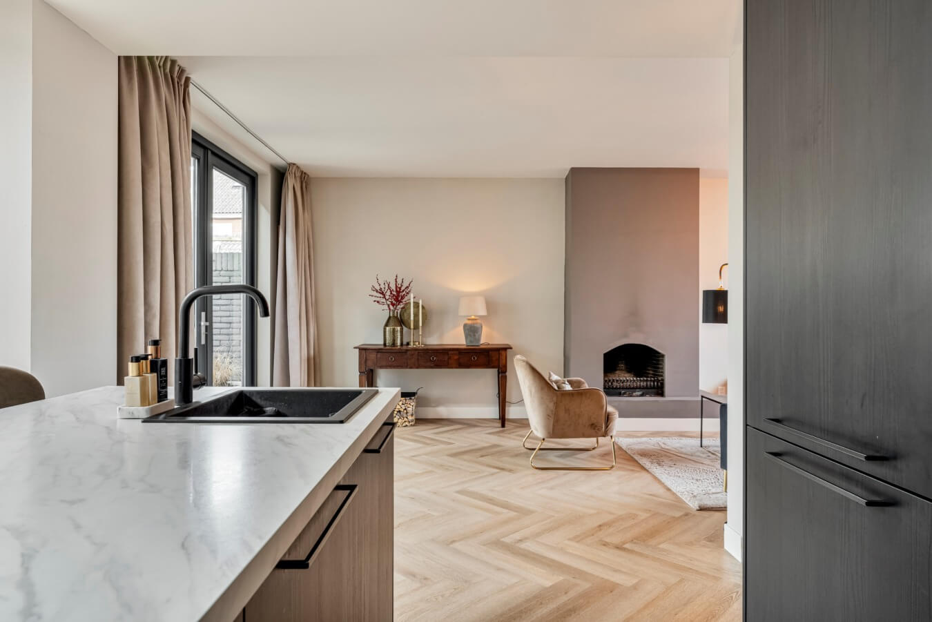 Jazeker: achter de fraaie zwarte deur ontvouwt zich een indrukwekkende leefruimte, waar stijl en comfort perfect samenkomen. De woonkamer straalt rust en ruimte uit en baadt in het licht dankzij de grote ramen en openslaande deuren naar de tuin. Met de visgraatvloer, de strakke wanden, open haard en de nette afwerkingen lijkt het net alsof deze ruimte uit een woonblad komt. Wauw!