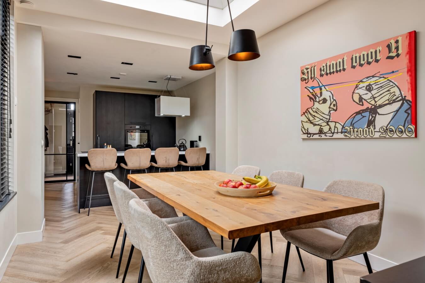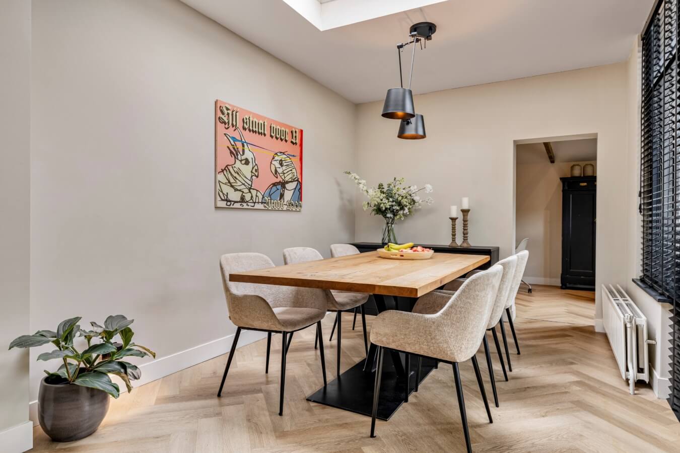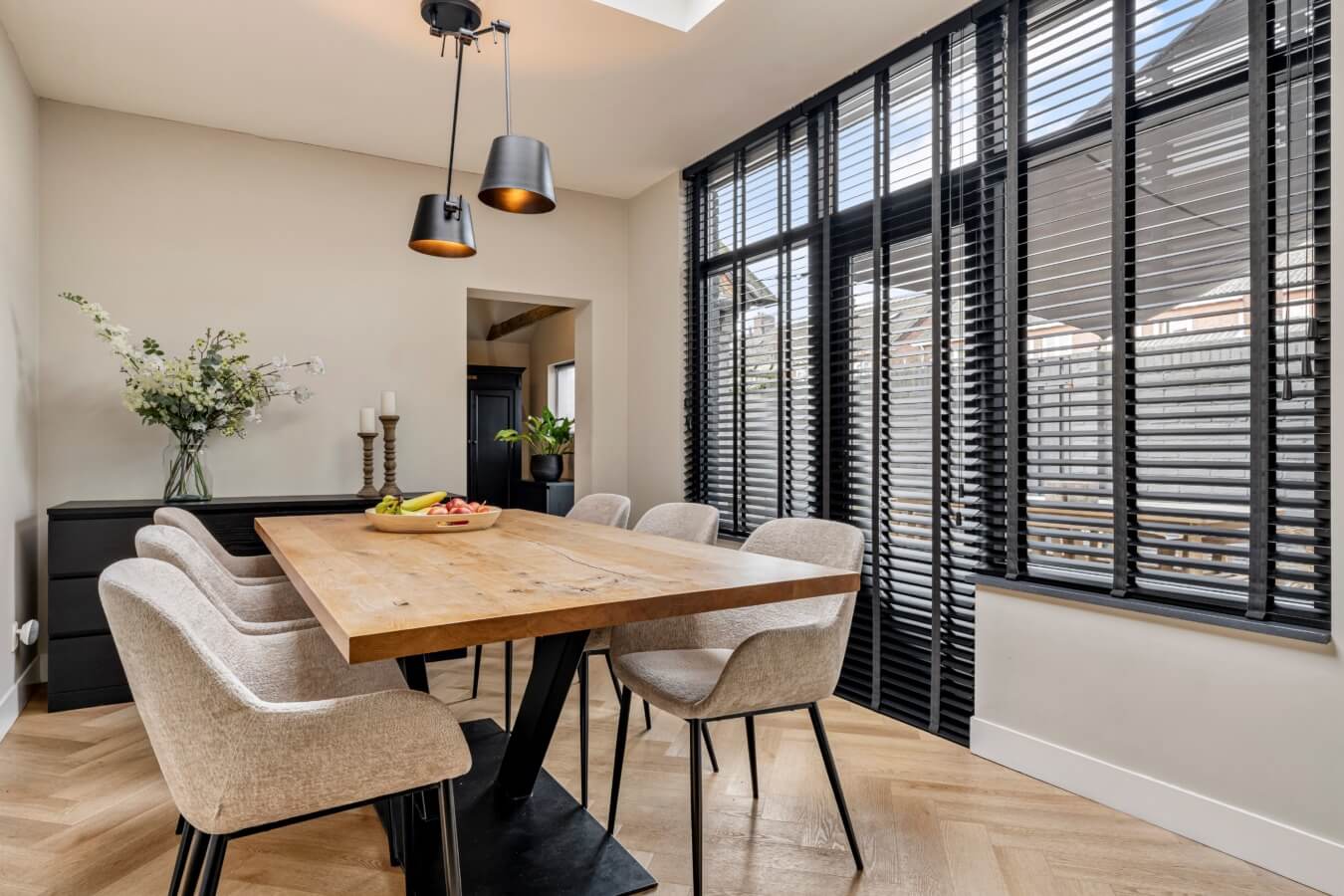 Jazeker: achter de fraaie zwarte deur ontvouwt zich een indrukwekkende leefruimte, waar stijl en comfort perfect samenkomen. De woonkamer straalt rust en ruimte uit en baadt in het licht dankzij de grote ramen en openslaande deuren naar de tuin. Met de visgraatvloer, de strakke wanden, open haard en de nette afwerkingen lijkt het net alsof deze ruimte uit een woonblad komt. Wauw!