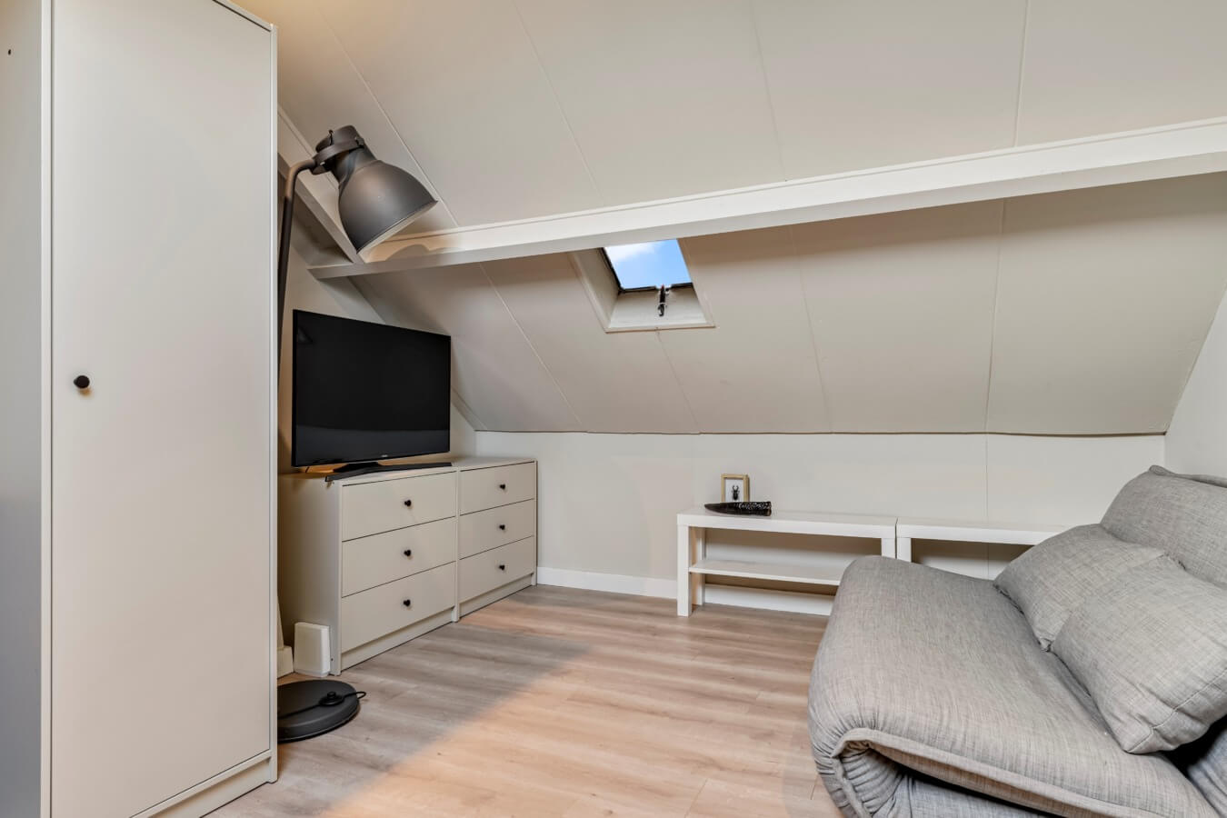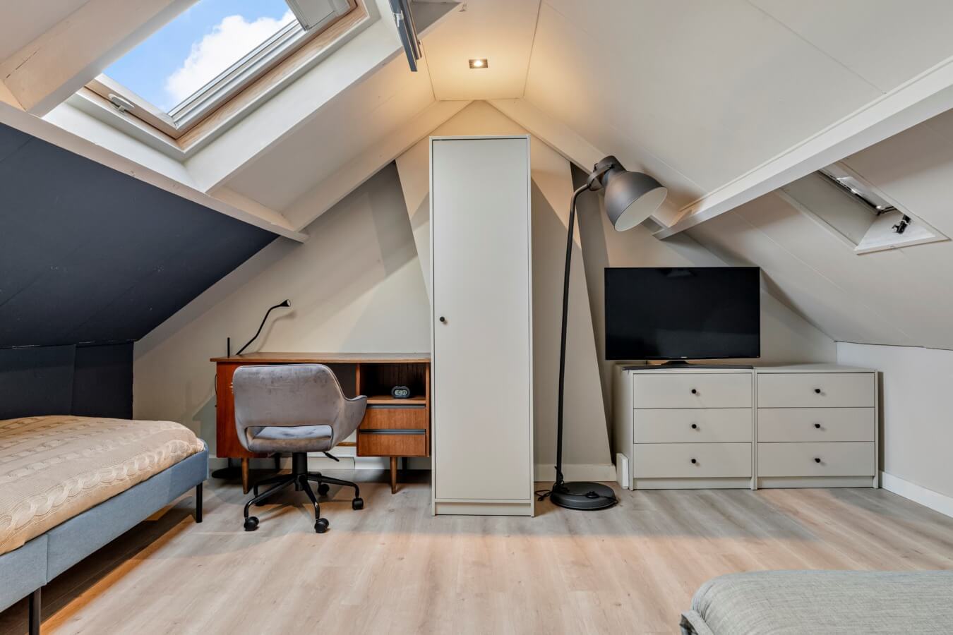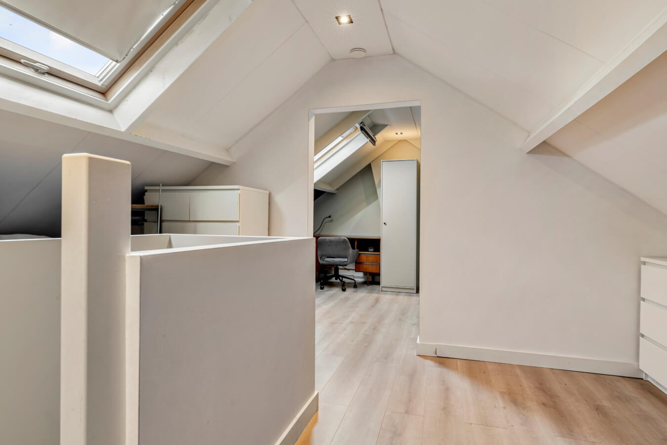 Middels een vaste trap kom je op de zolderverdieping terecht, waar het dakraam de ruimte vult met licht en waar extra bergruimte te vinden is. Ook vind je hier de Nefit cv-ketel.