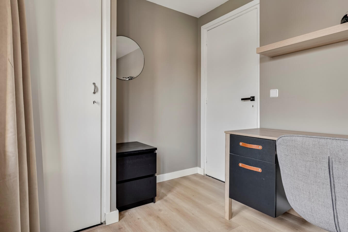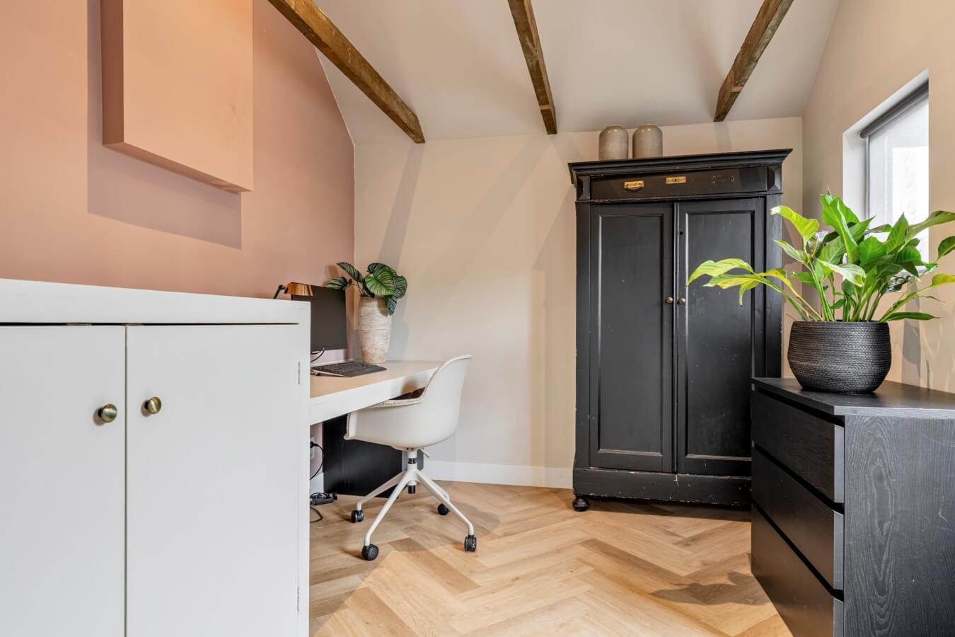 Aan de rechter voorzijde ligt de iets kleinere, fijne derde slaapkamer. Deze ruimte zou bijvoorbeeld uitermate geschikt zijn als tweede kinderkamer, logeerkamer of thuiswerkplek. Of droomde je altijd al van een inloopkast?