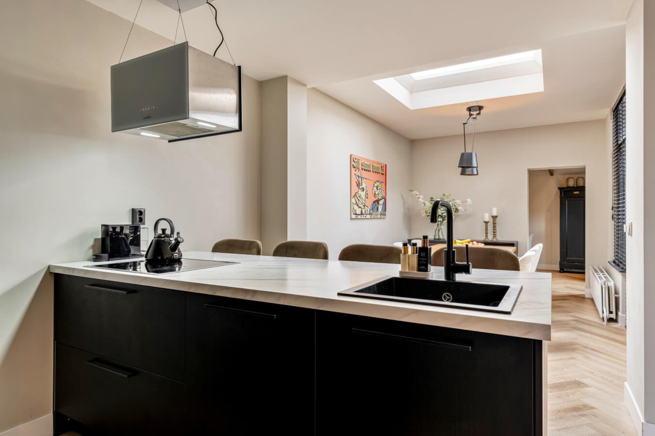 Door de hoeveelheid ruimte en de indeling heb je een gescheiden woon- en eetkamer aan weerszijden van de keuken. En die keuken? Dat is een absolute blikvanger zo midden in de kamer. Hier kook je als een fortuinlijke thuischef op jouw kookeiland, waar jouw favoriete mensen lekker met een wijntje aan de andere kant kunnen zitten tijdens het kokkerellen. Dat koken wordt hier mede mogelijk gemaakt door de inductie kookplaat, afzuigkap, vaatwasser, oven en koel-vriescombinatie.