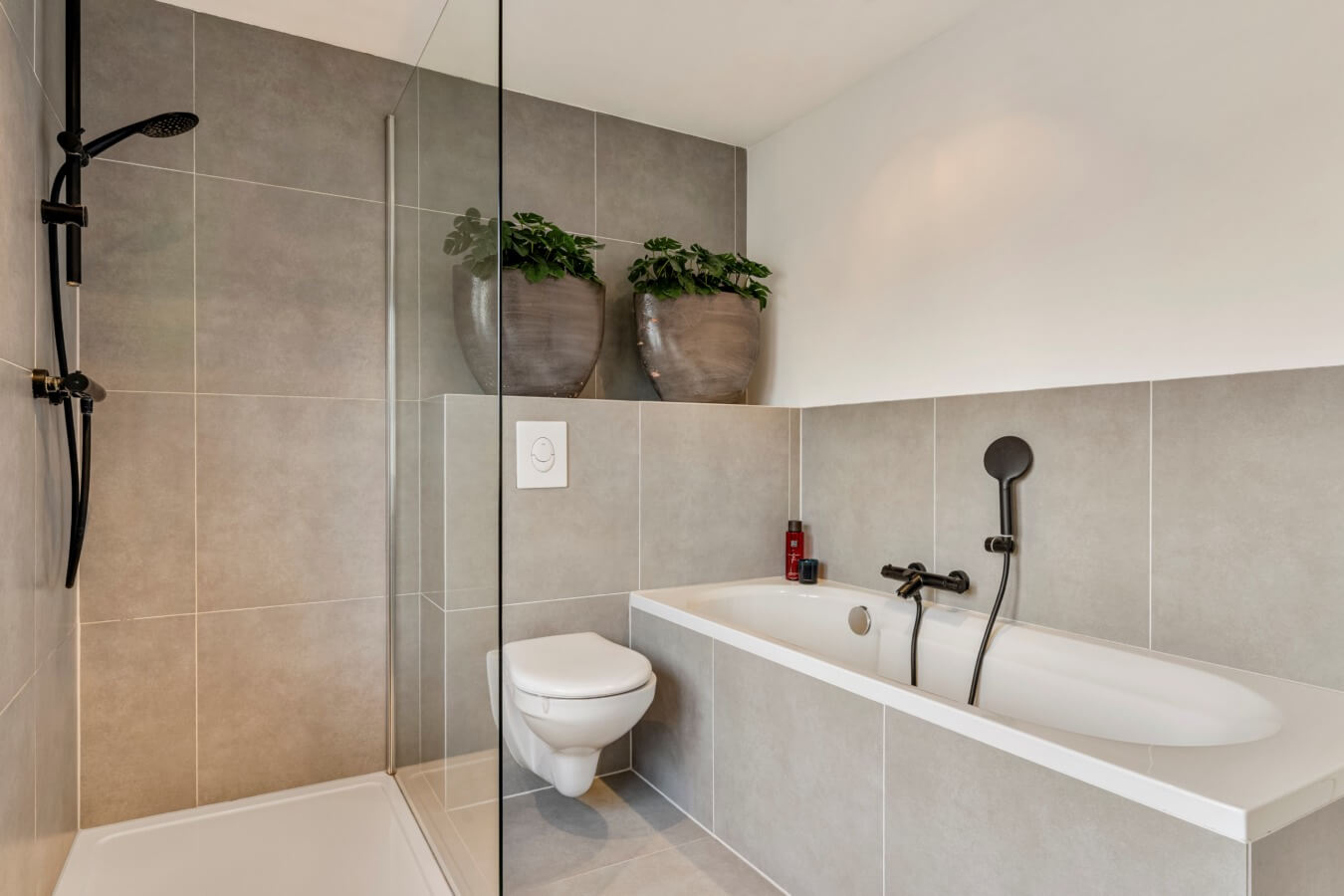 De mooie badkamer vormt het overige vertrek aan de voorzijde van de verdieping en zal je, met haar luxe en moderne betegeling en heerlijke voorzieningen, ook absoluut niet tegenvallen. De ruimte is uitgerust met een fijn ligbad, een mooie inloopdouche, een modern dubbele wastafelmeubel en een toilet. Ontspanning is hier gegarandeerd.