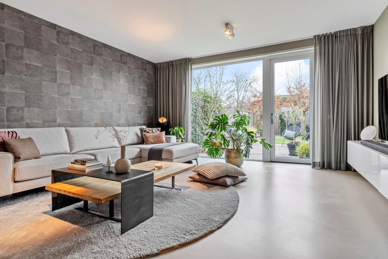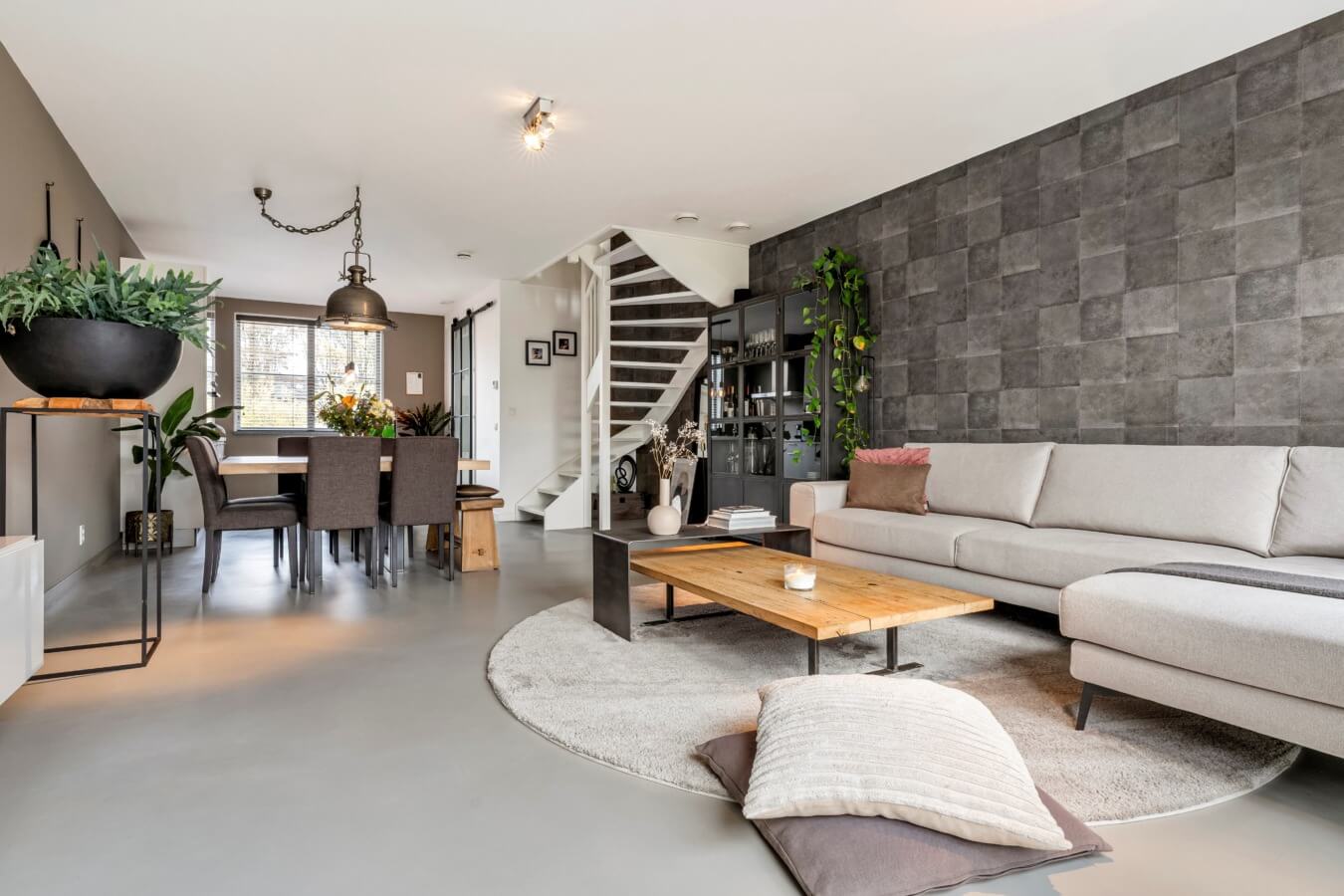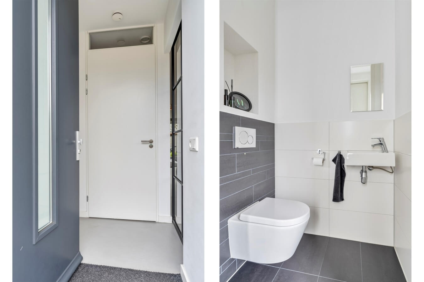 Je komt de woning binnen in de nette entree, waar je achtereenvolgens de meterkast en de moderne toiletruimte met hangend closet en fonteintje zal ontdekken. De hal zet meteen de toon met haar eigentijdse details, zoals de stoere zwarte taatsdeur en de gietvloer. Op naar de living!