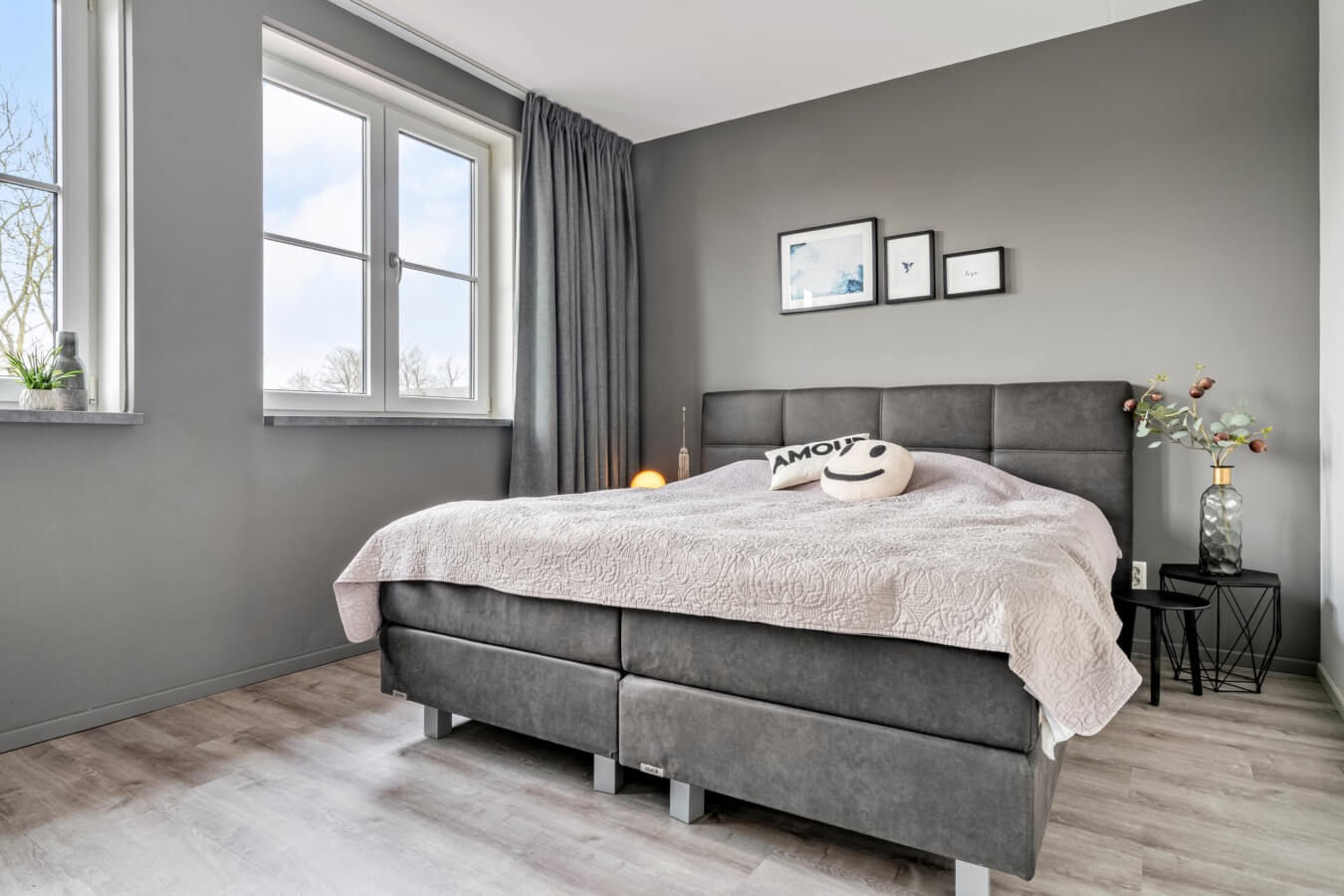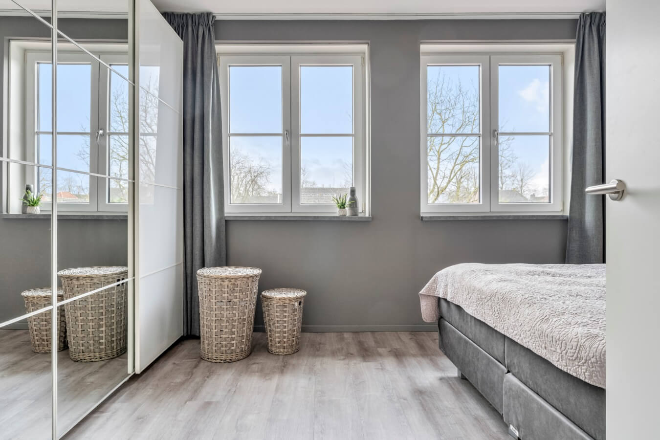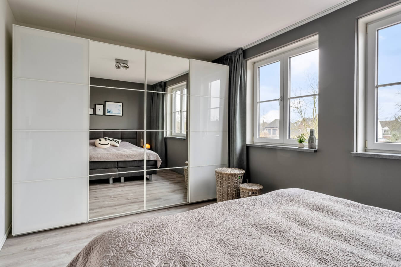 De grootste slaapkamer ligt over de volledige breedte van de woning aan de achterzijde en is voorzien van veel daglichttoetreding door de raampartijen, nette afwerkingen en meer dan genoeg ruimte voor alle gewenste meubels. De rustige kleurencombinatie, samen met de mooie vloer, maken dit een ideale hoofdslaapkamer. De twee kleinere kamers aan de voorzijde zijn tevens netjes afgewerkt en goed te gebruiken als kinderkamers. Dankzij de ruime slaapkamer op de tweede verdieping kun je (een van) deze extra ruimtes flexibel benutten. Wat dacht je van een thuiswerkplek, een fitnessruimte of zelfs een luxe inloopkast?