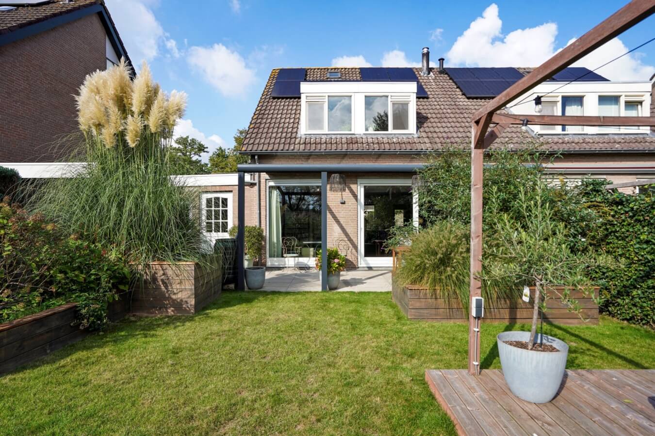Net wanneer je denkt dat je alles hebt gezien, stap je via de schuifpui in de living de buitenruimte in. Met zó’n heerlijke, ruime en privacybiedende tuin wil je elke dag wel lekker weer! Je beschikt hier niet alleen over een gaaf terras onder een mooie glazen overkapping, maar ook over een gezellig loungeterras op een veranda en een groot grasveld waar jij straks alle kanten mee op kan. Vanuit hier kijk je heerlijk weg over het water. Dit is de definitie van genieten!
