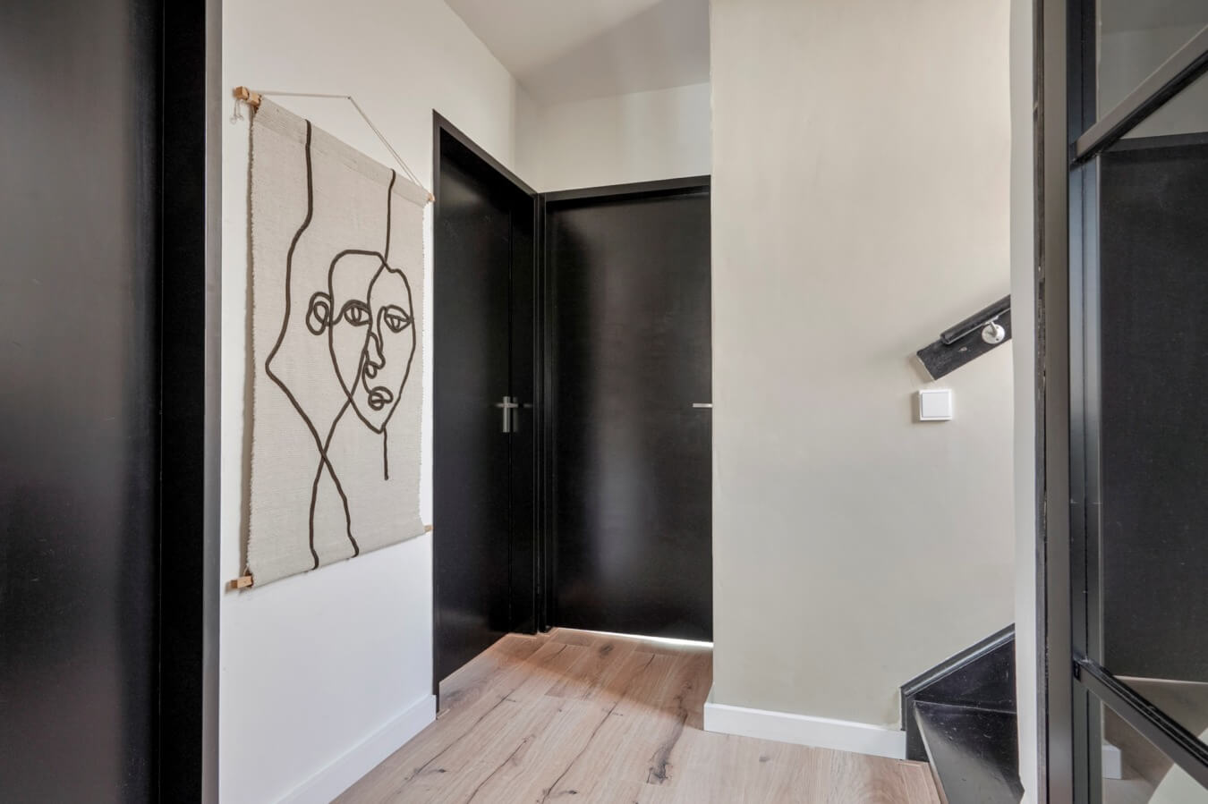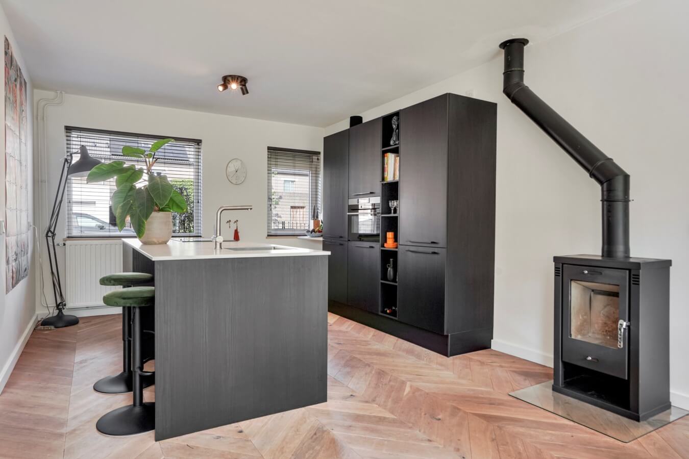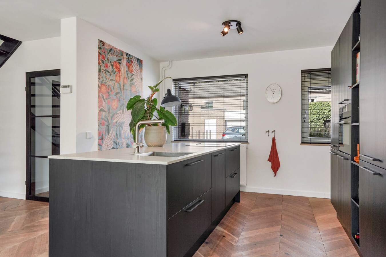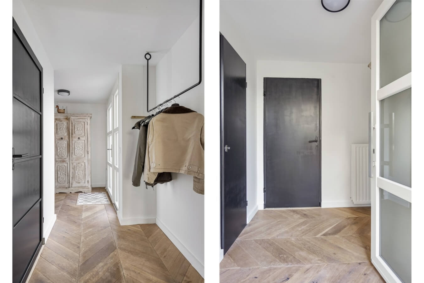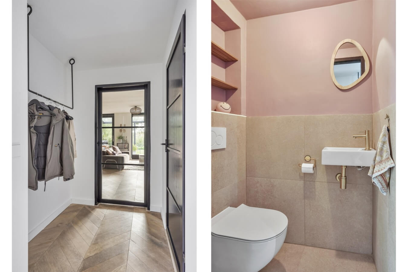 Wanneer je de voordeur opent kom je terecht in de ruime hal, waar je de meterkast en de strakke toiletruimte met hangend closet en fonteintje kan vinden. Als de moderne afwerkingen in de hal de toon zetten voor de rest van de woning, dan staat je nog een hoop te wachten. Zullen we de zwarte deur openen en de mooie Hongaarse punt houten vloer volgen, om te kijken of dat klopt?