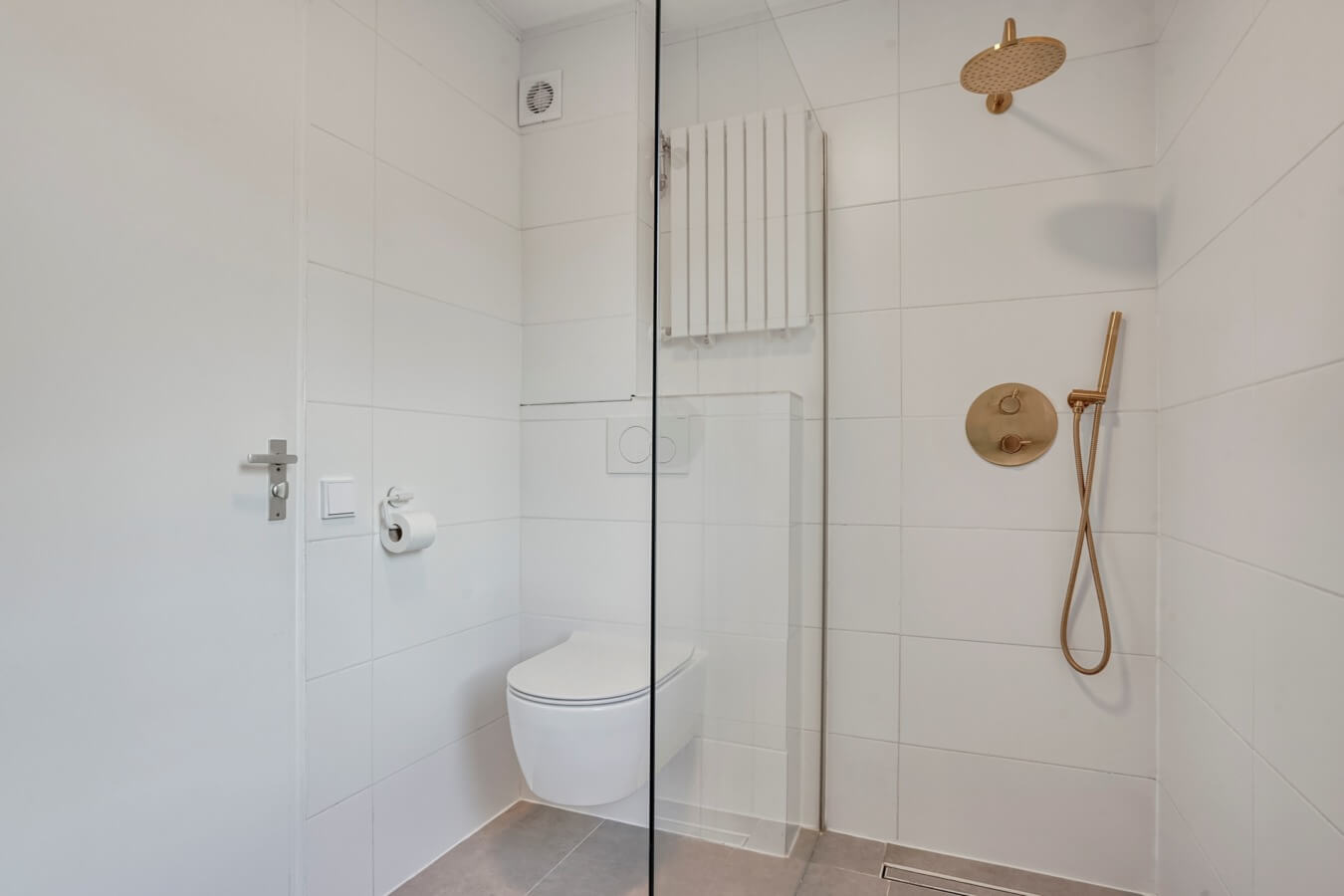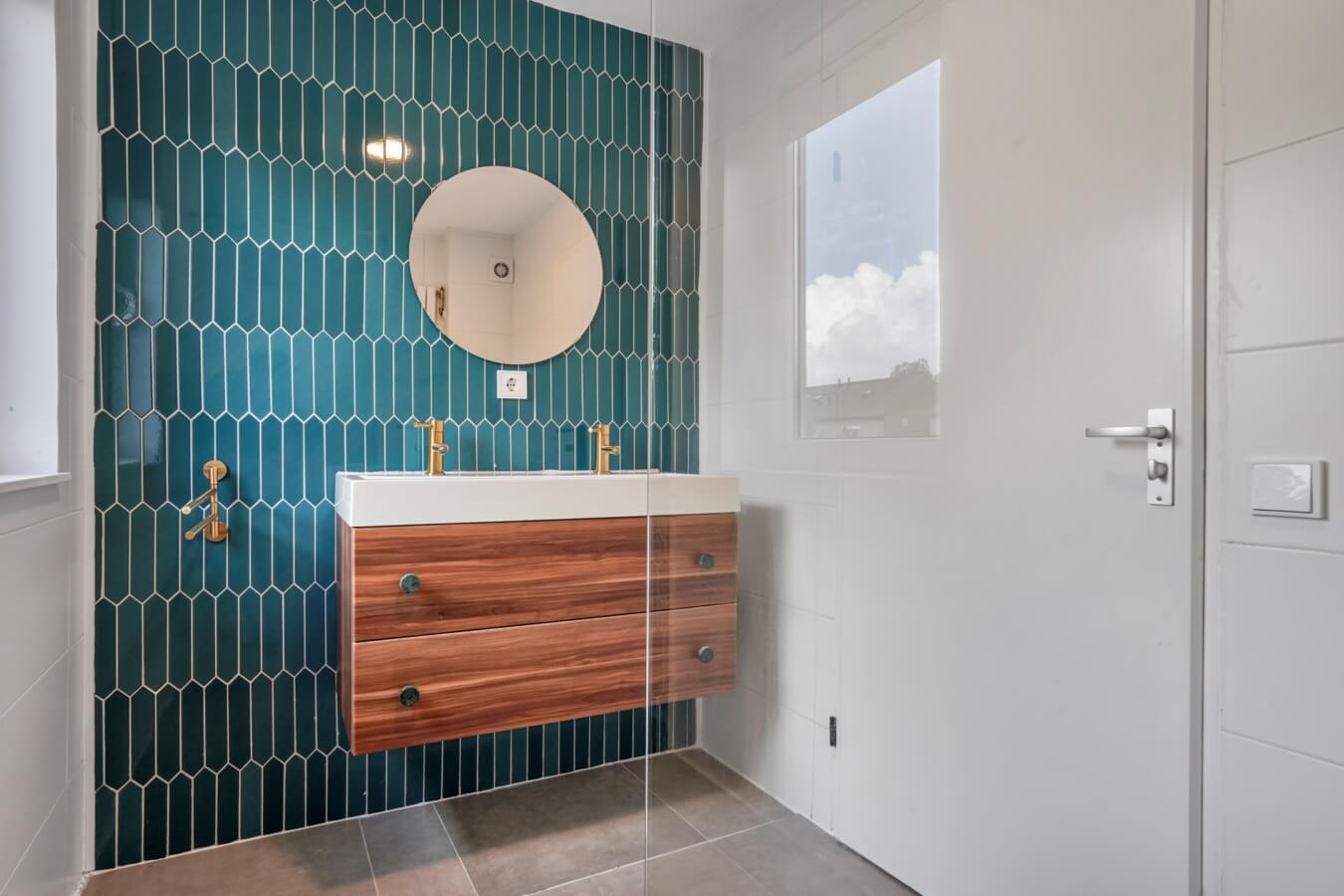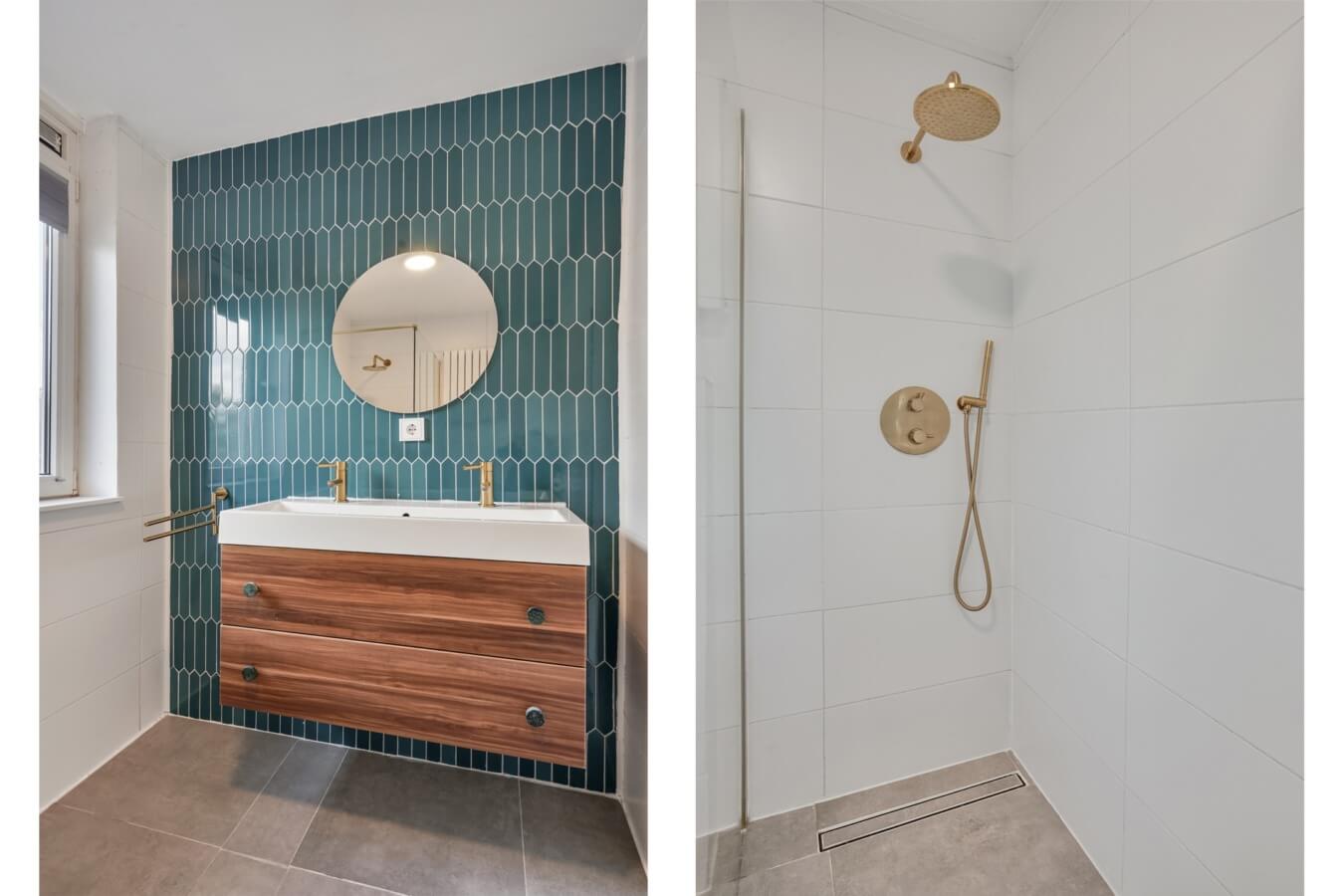 Aan de voorzijde ontdek je de tevens de badkamer. Correctie: de prachtige badkamer, die zo uit een woonblad lijkt te komen. Tot aan het plafond gestyled in een stijlvolle, moderne afwerking en voorzien van een ruime inloopregendouche, een stijlvol dubbele wastafelmeubel en gouden details alom: het is te zien dat de ruimte gloednieuw is.