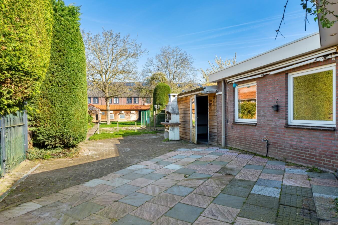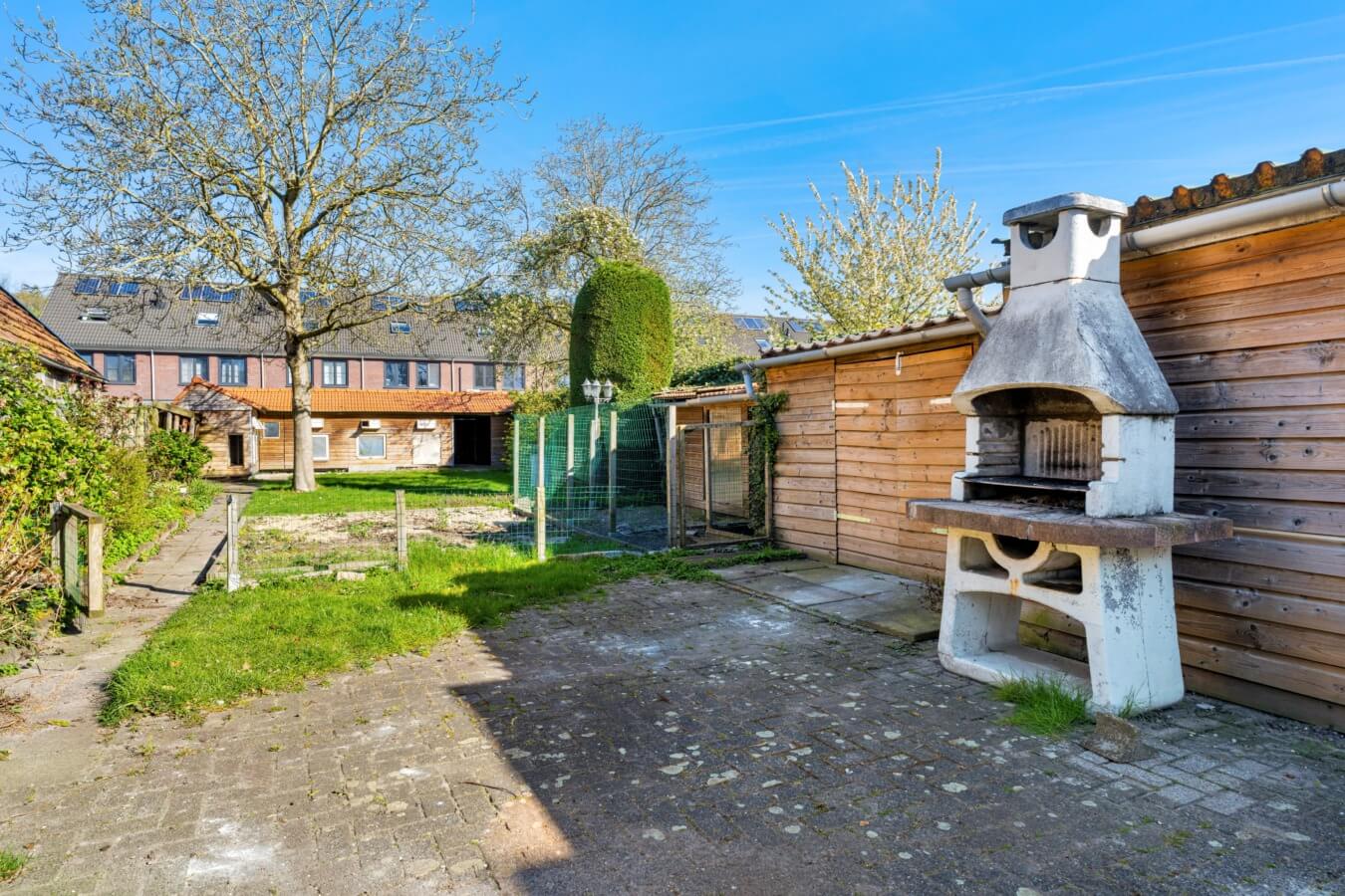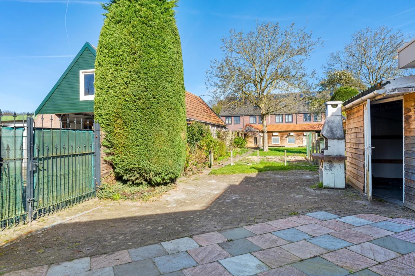 Een fijne buitenruimte met diverse bergingen, meerdere terrassen, beplanting, gazon en een duivenhok die, net als de woning zelf, alle mogelijkheden bieden om er iets moois van te maken; van een strakke stadstuin tot een groene, sfeervolle plek om tot rust te komen.