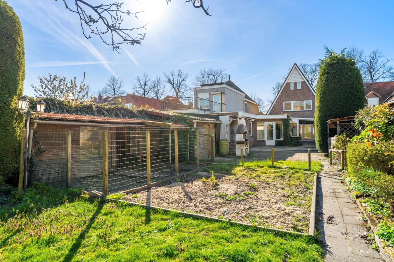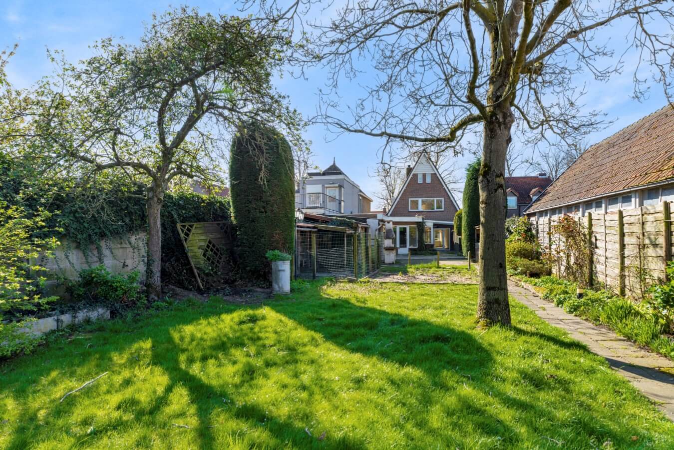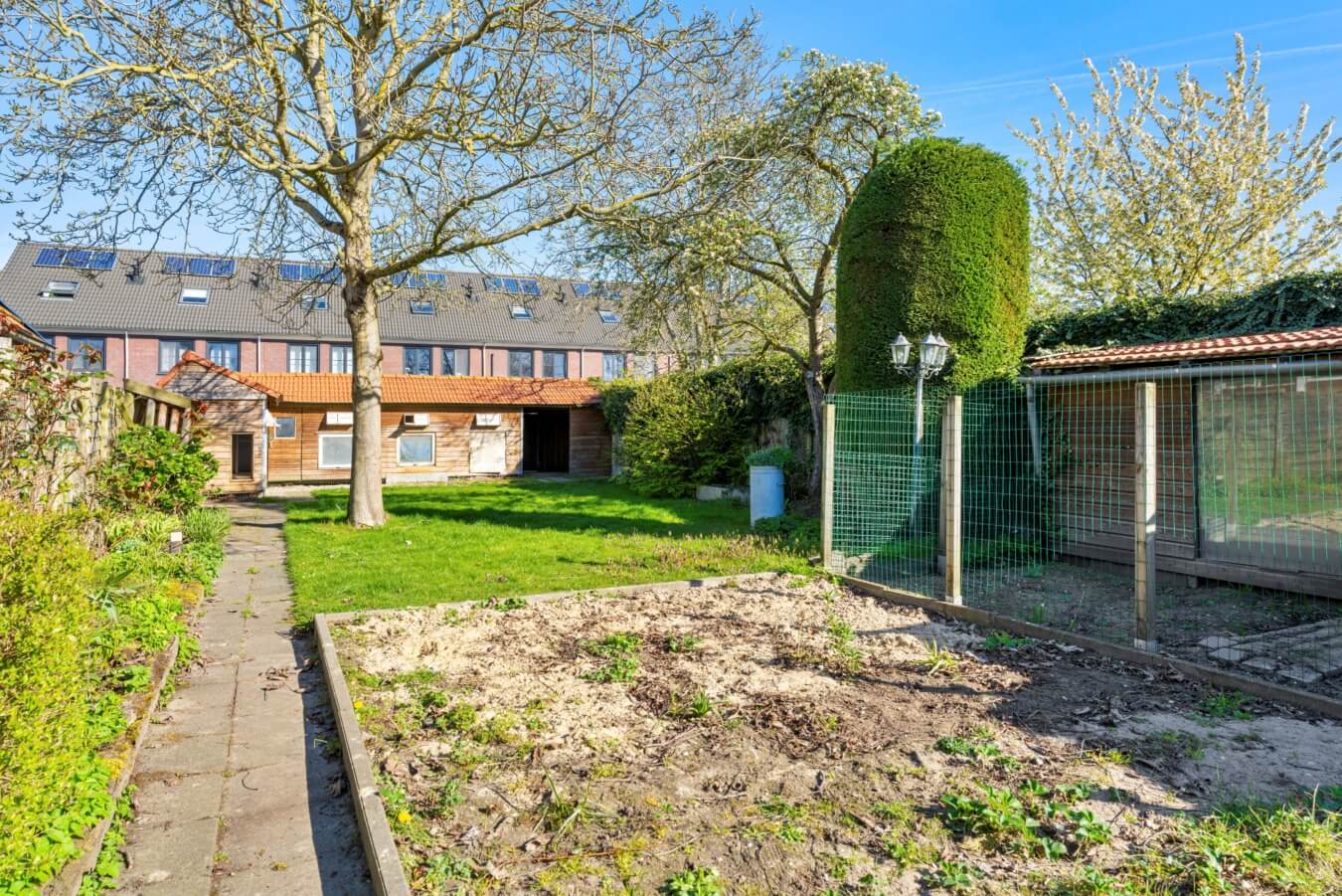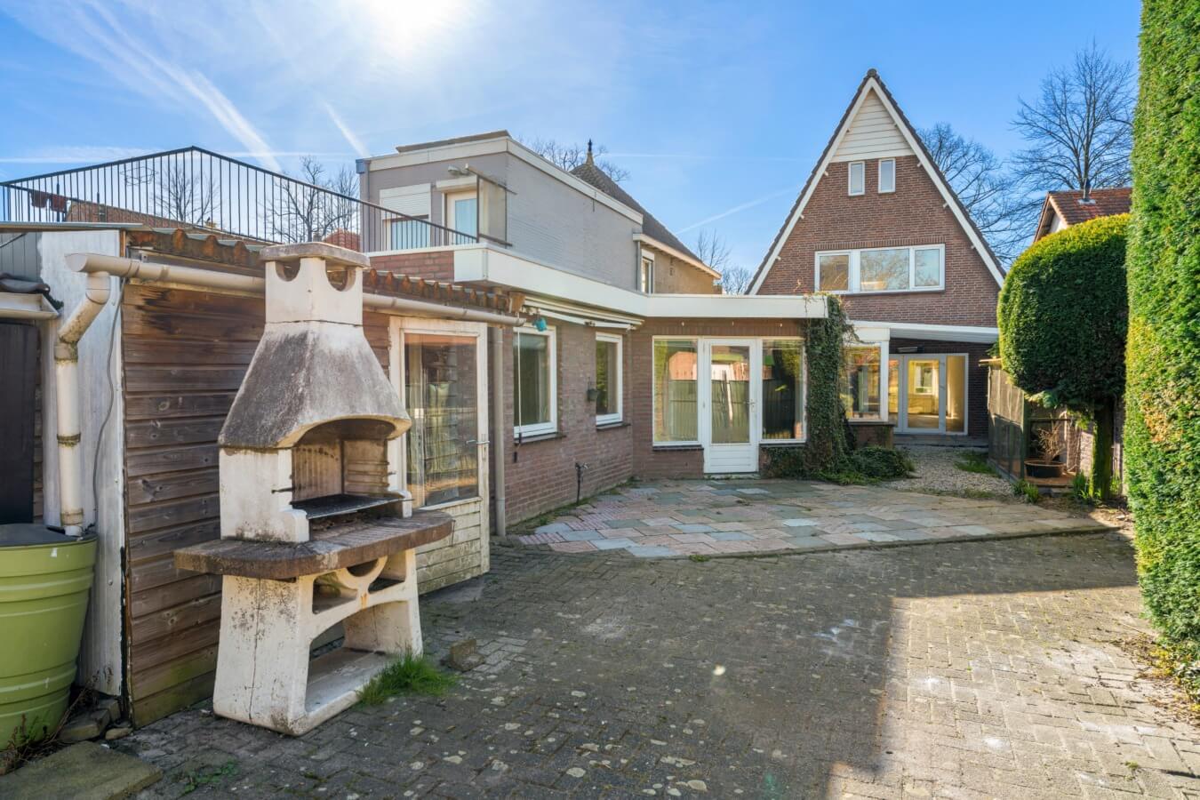 Een fijne buitenruimte met diverse bergingen, meerdere terrassen, beplanting, gazon en een duivenhok die, net als de woning zelf, alle mogelijkheden bieden om er iets moois van te maken; van een strakke stadstuin tot een groene, sfeervolle plek om tot rust te komen.