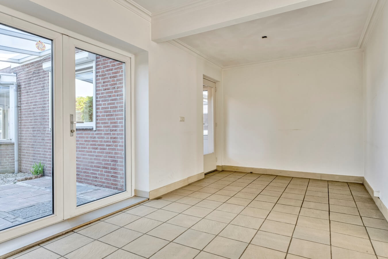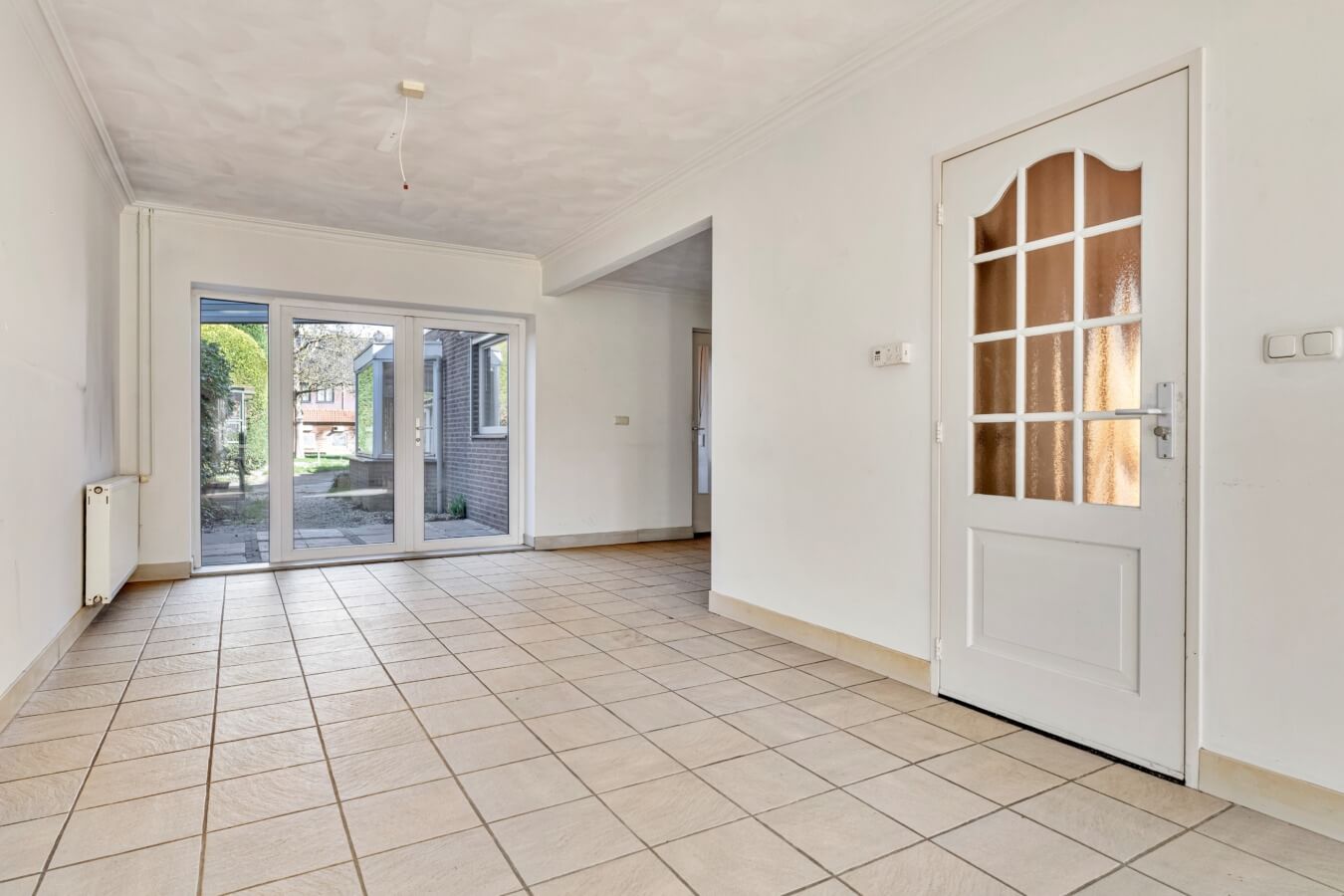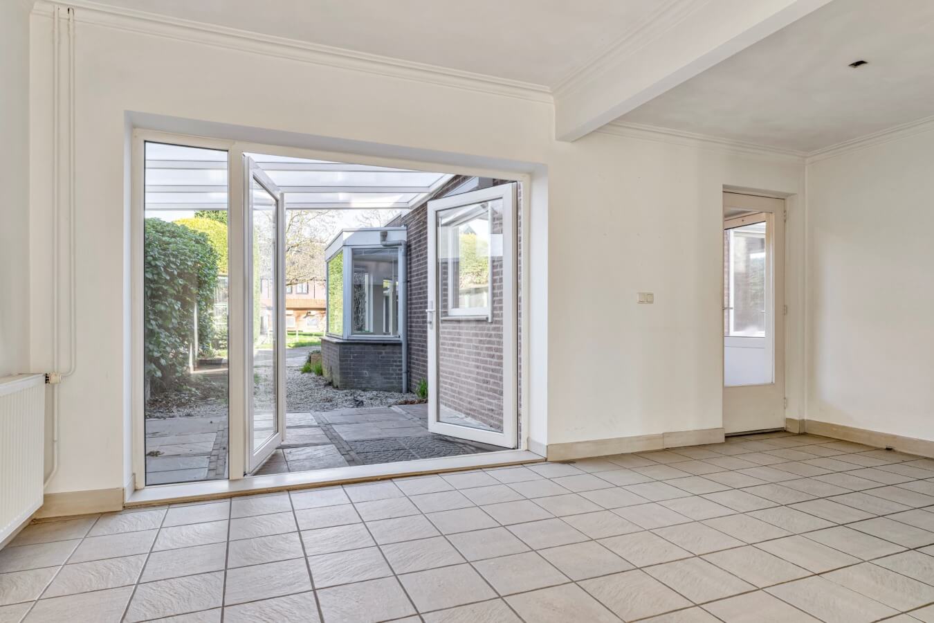 De woonkamer biedt volop ruimte om een comfortabele zithoek én een gezellige eethoek te creëren. Grote raampartijen en openslaande tuindeuren zorgen voor een prettige lichtinval en een fijne verbinding met de tuin.