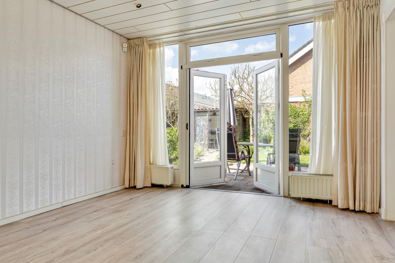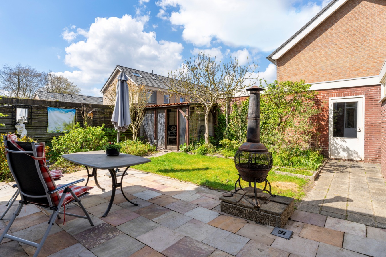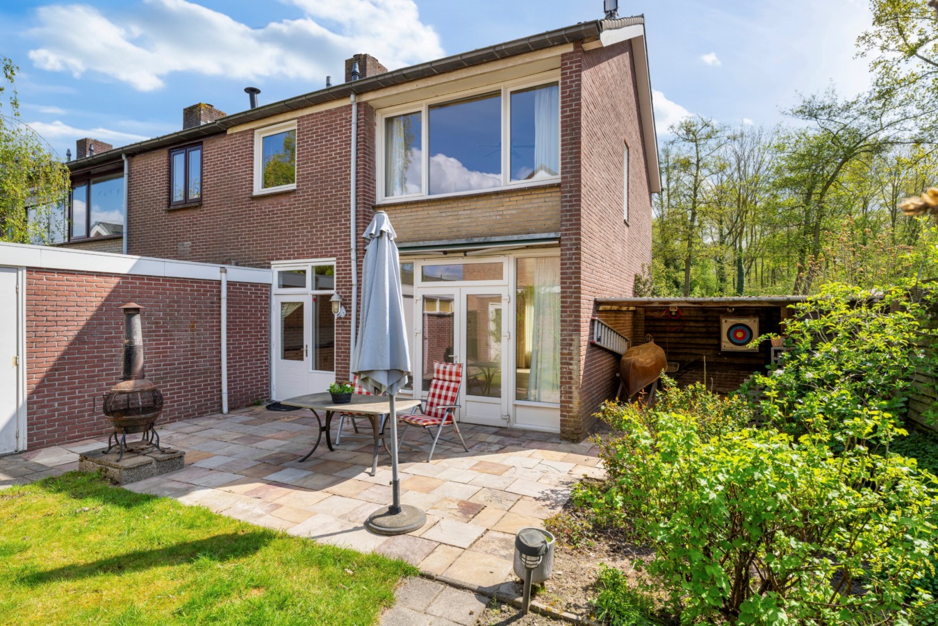 De riante achtertuin is een heerlijke plek voor zonaanbidders. Dankzij de ligging op het zuidoosten geniet je hier de hele dag van de zon. Geen zin in de felle zon of regent het een keertje? Onder de overkapping kun je het hele jaar door buiten zitten.
