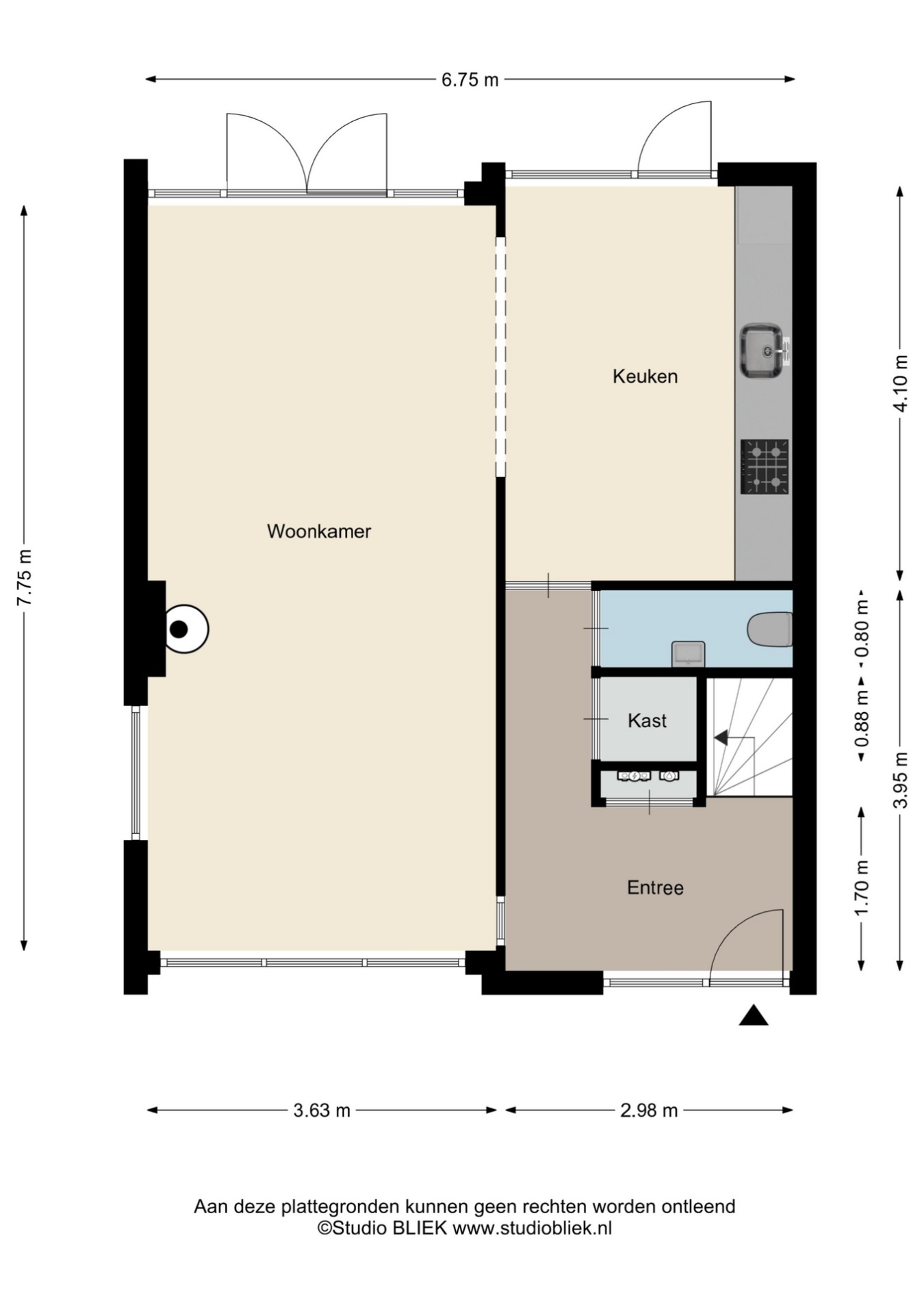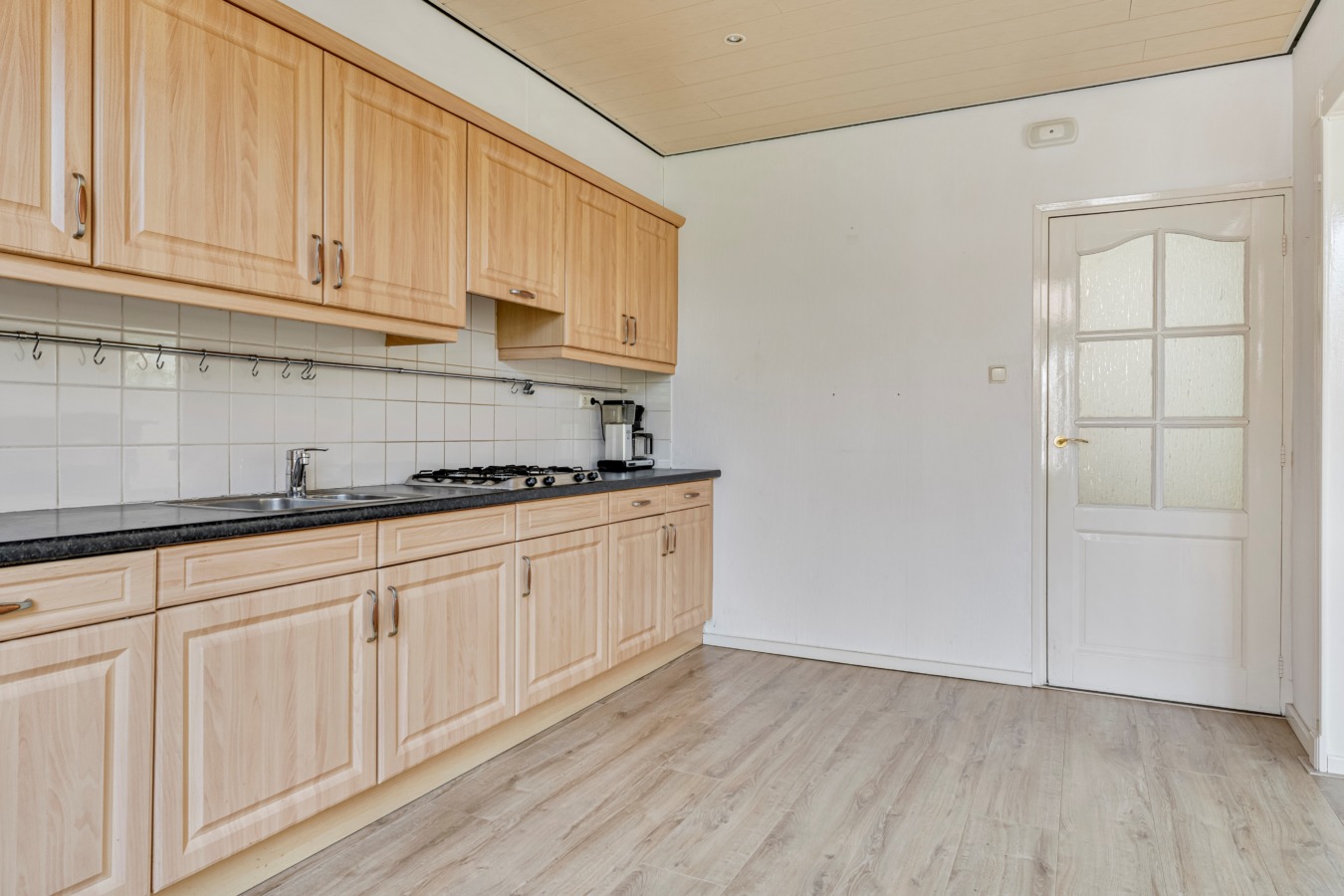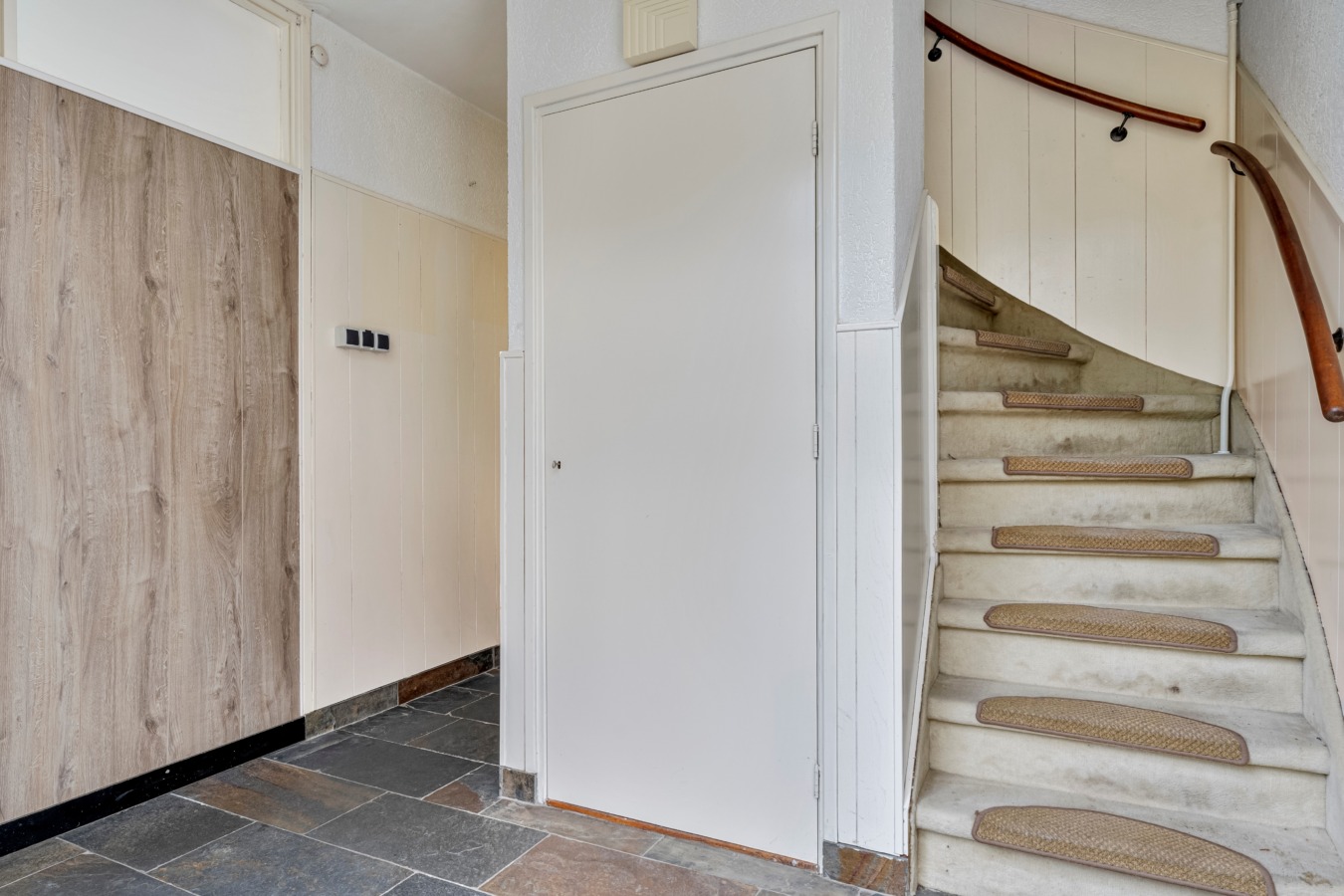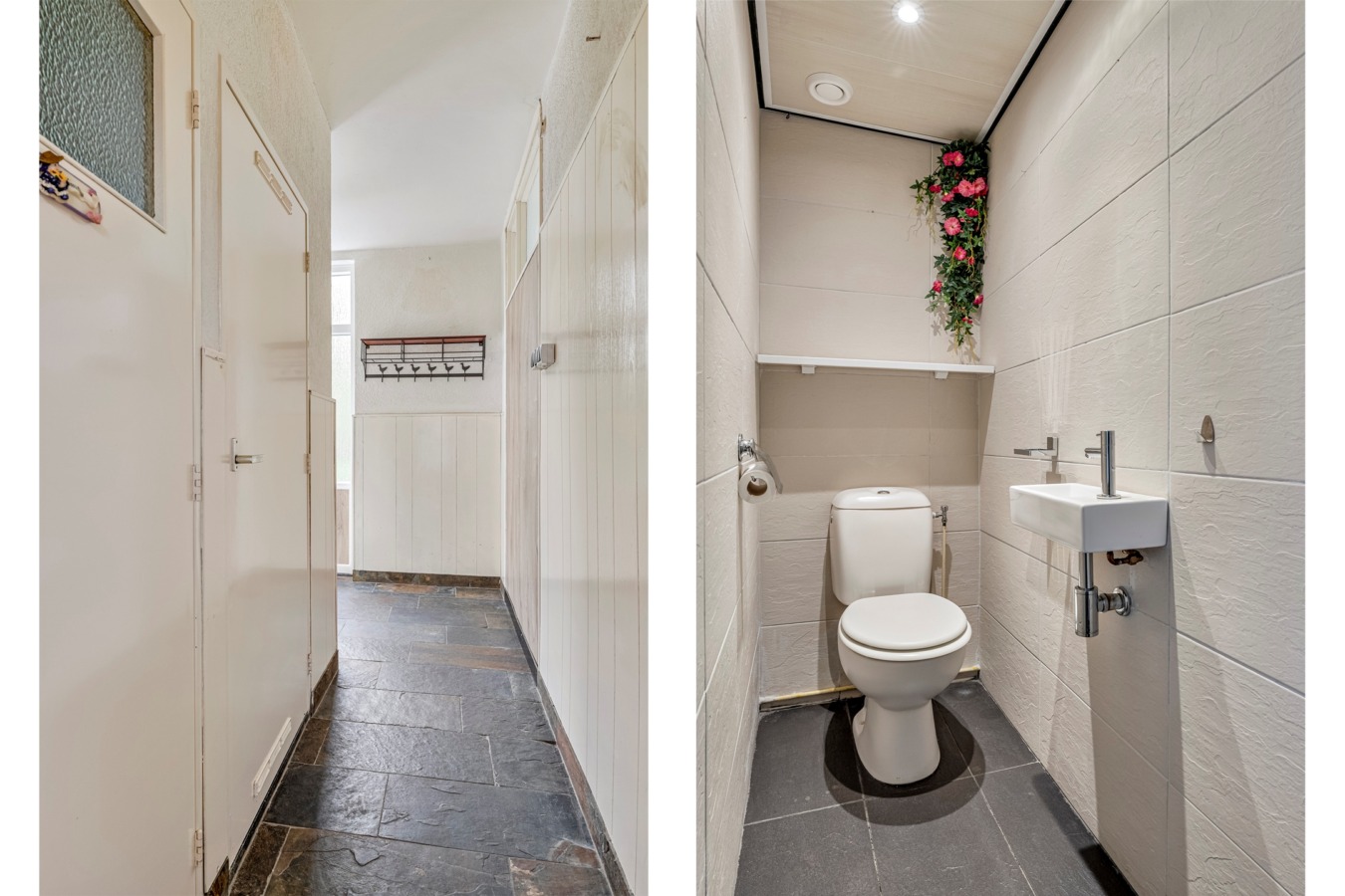 Je komt de woning binnen via de lichte hal met trapopgang, meterkast, voorraadkast en de toiletruimte met fonteintje. Vanuit hier heb je toegang tot de keuken en de woonkamer.
