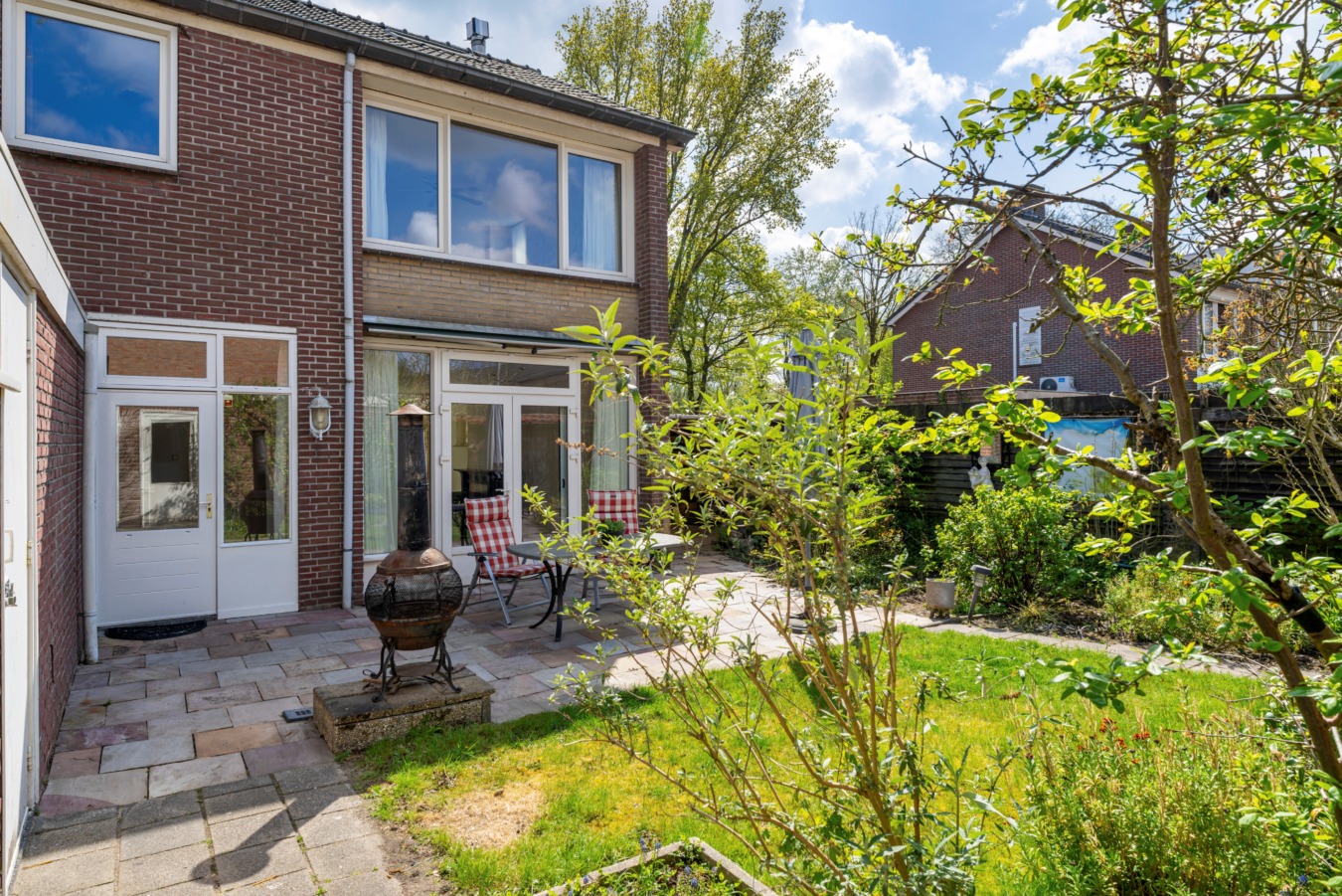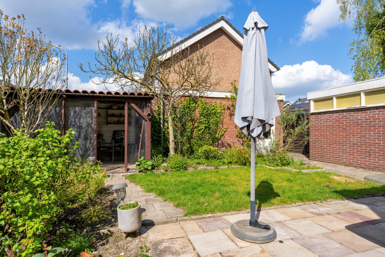 Daarnaast beschikt de tuin over een vrijstaande berging, een tweede overkapping voor opslag en — als kers op de taart — een ruime, vrijstaande garage die via de eigen oprit bereikbaar is.