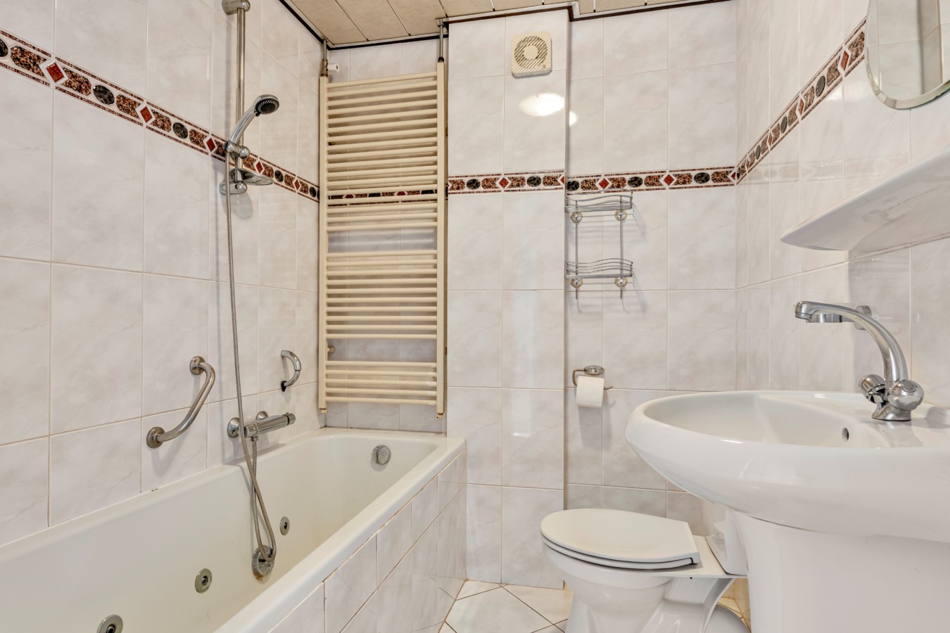 • Badkamer: De badkamer is uitgerust met een ligbad, toilet en wastafel. Ook hier kun je met een moderniseringsslag een luxe badkamer creëren.