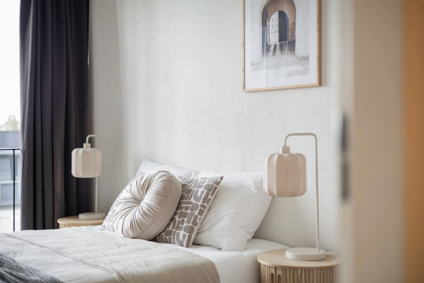 Wanneer je de deur van het appartement opent, stap je binnen in de nette entree. De hal biedt achtereenvolgens toegang tot de toiletruimte met hangend closet en fonteintje, bergkast met wasaansluiting, de woonkamer, badkamer en de slaapkamer. Laten we beginnen bij het laatstgenoemde.