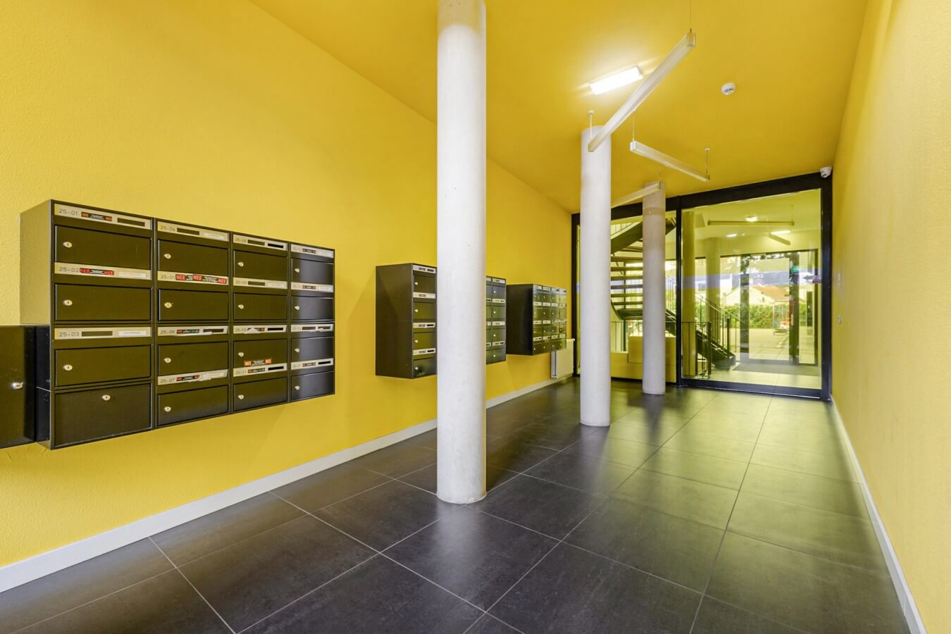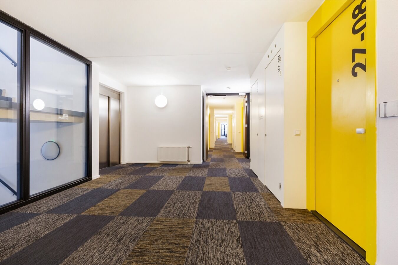 Op de begane grond kom je via het Besterdplein, of via het parkeerterrein aan de achterzijde, binnen in de centrale entree. Hier vind je de trappen, de brievenbussen, het bellentableau en de lift. Op naar boven!