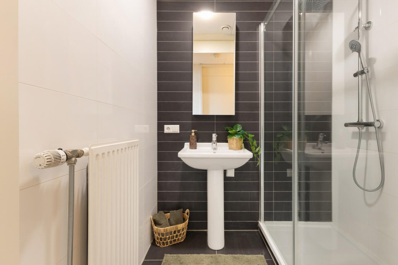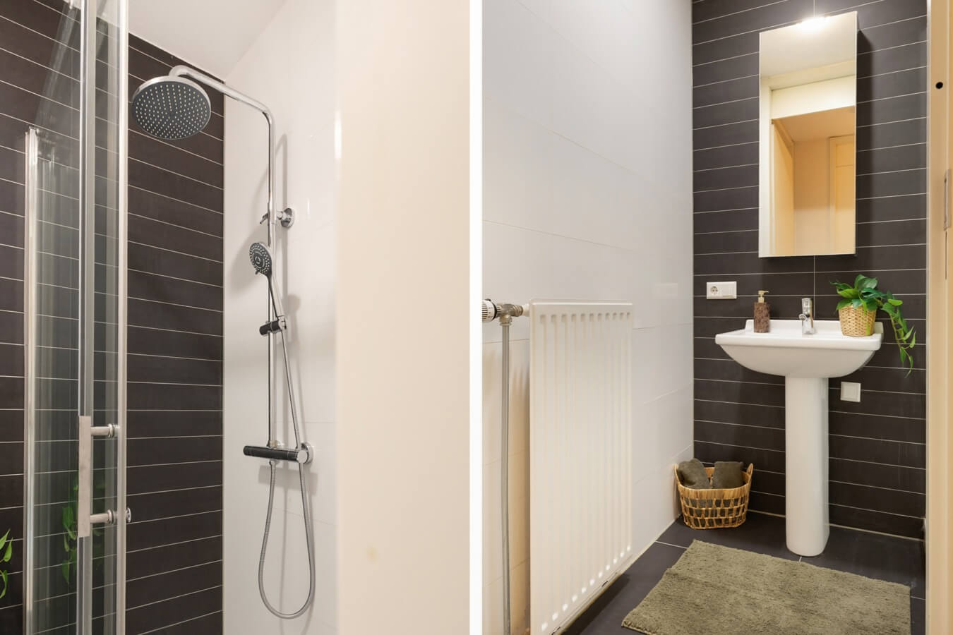 De badkamer is voorzien van een moderne inloop regen- en handdouche en een wastafel.