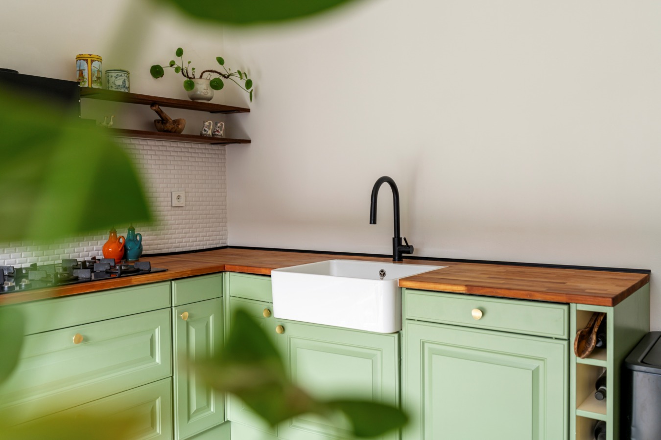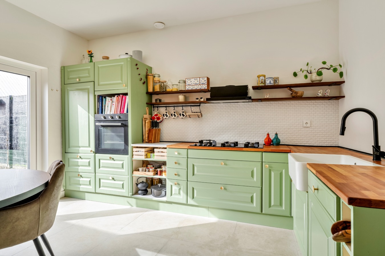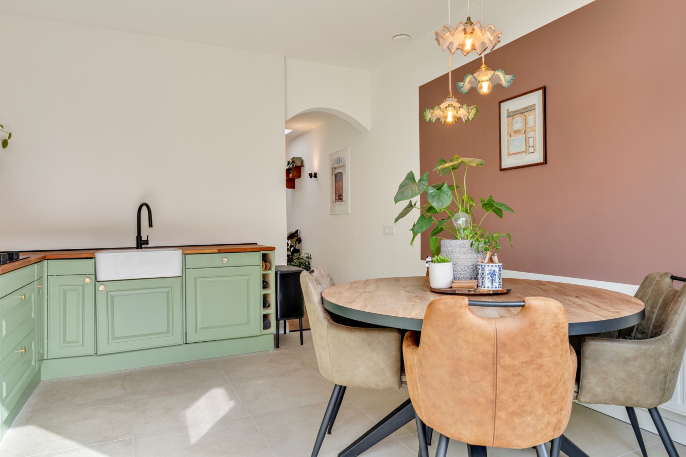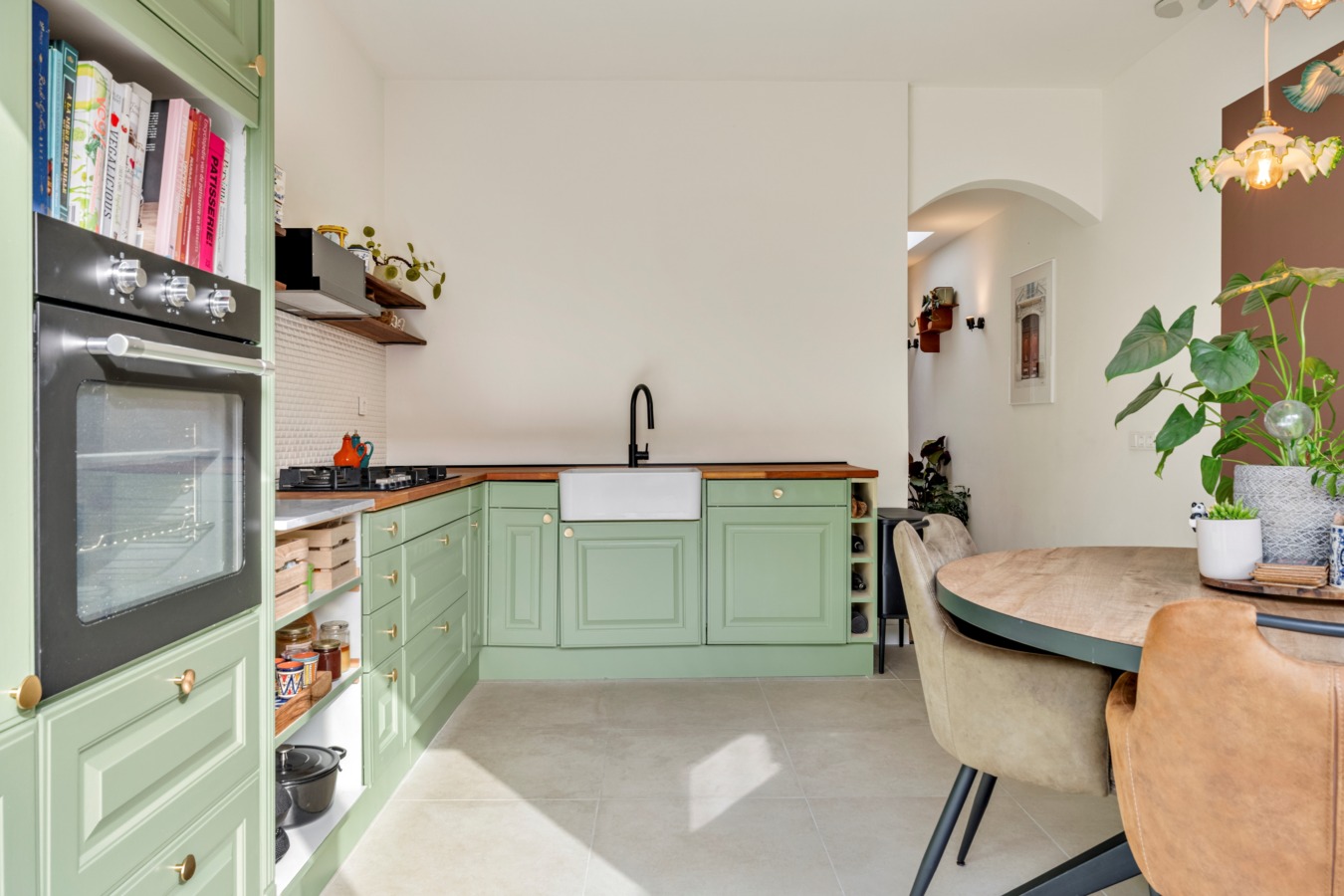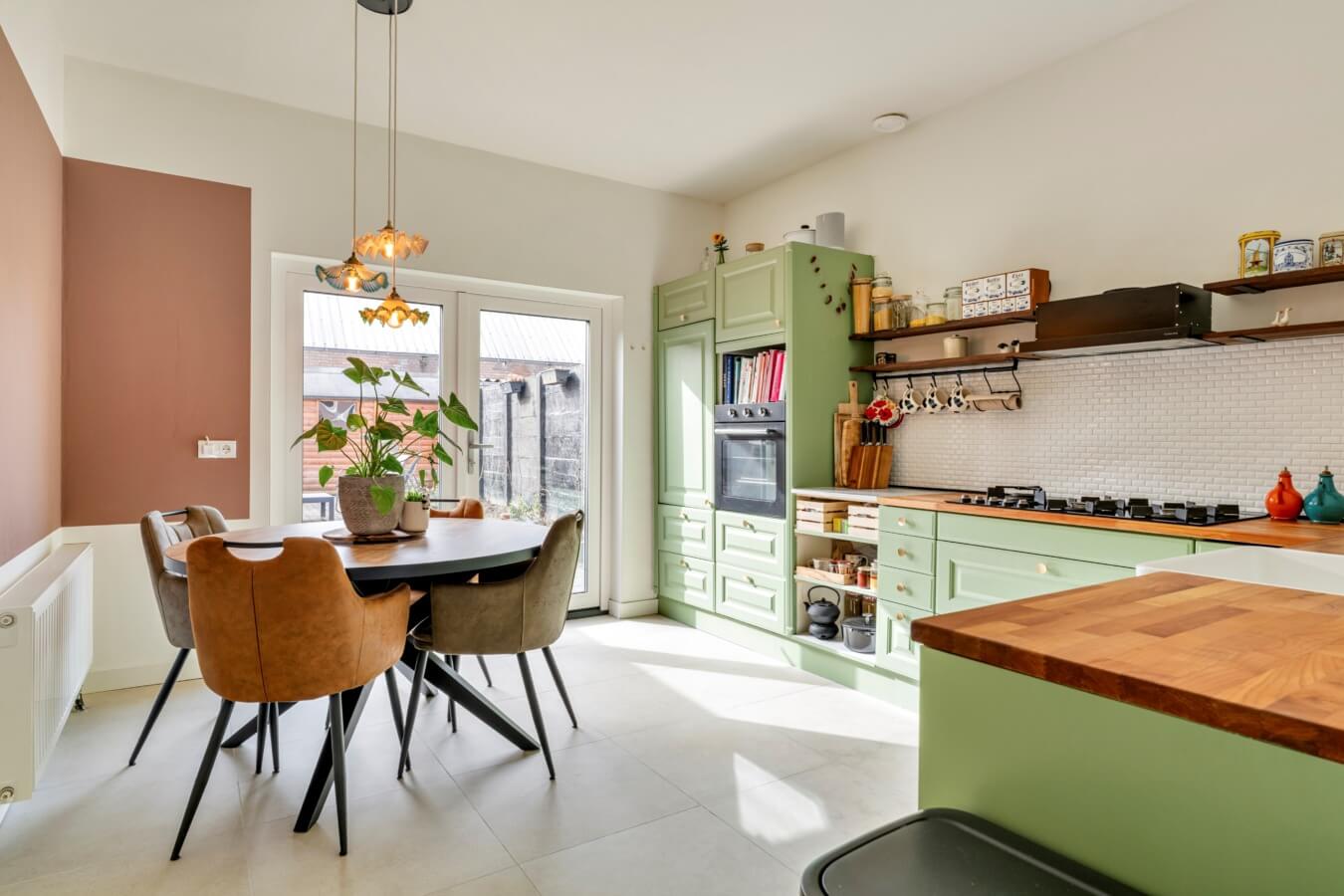 De tuingerichte eetkeuken van ruim 14 m² vormt een fijne plek om te koken en samen te eten. De openslaande deuren verbinden binnen en buiten met elkaar. De keuken heeft een hoekopstelling met diverse (inbouw)apparatuur, waaronder een 5-pitsgaskookplaat, afzuigkap, oven (juni 2025), vaatwasser (2021) en een koelkast.