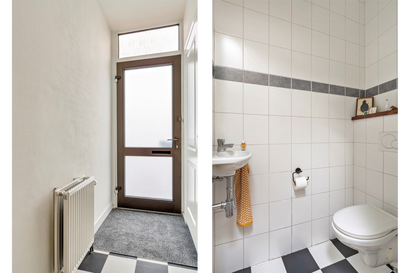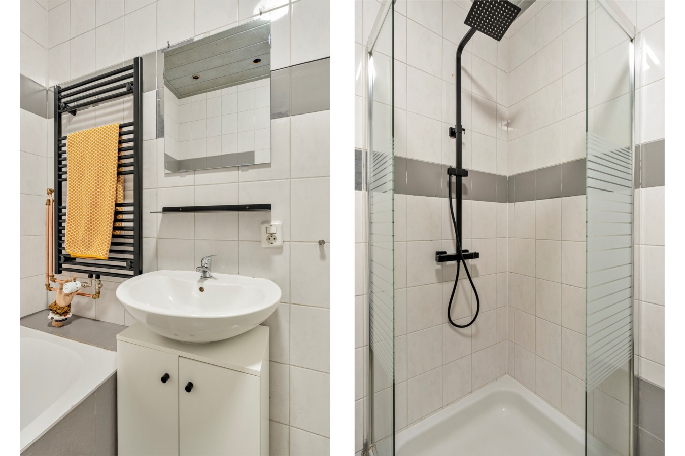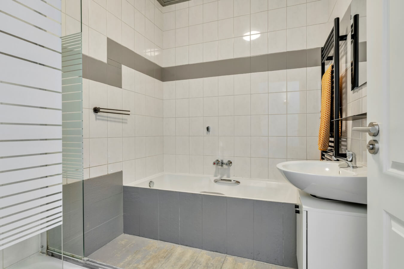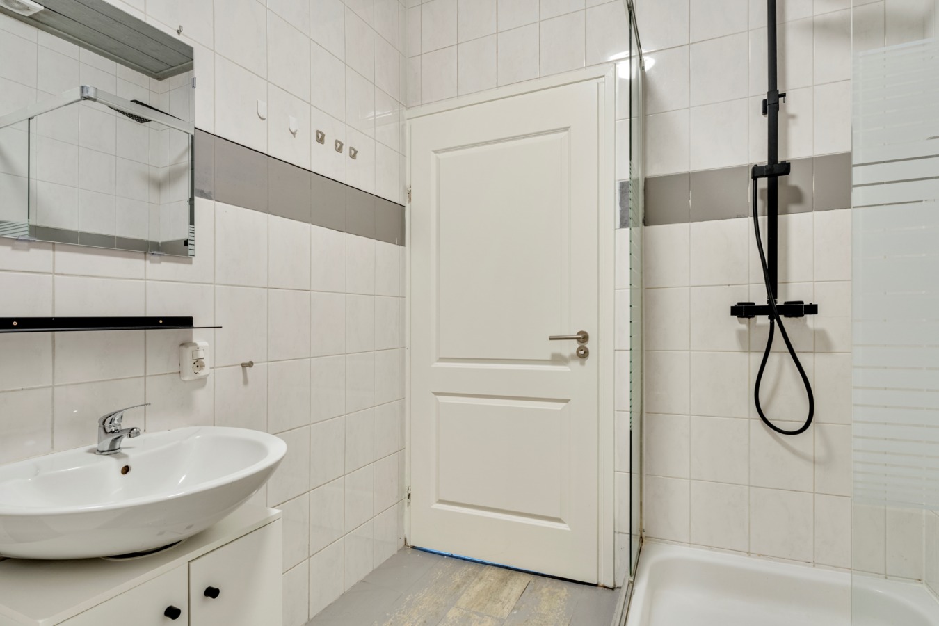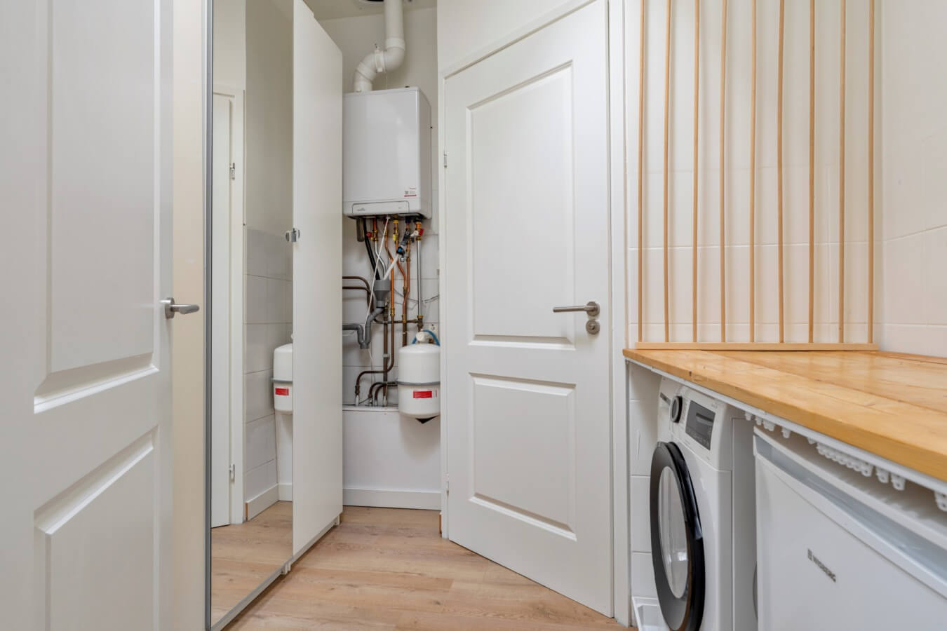 In de doorloop bereik je de badkamer en de bijkeuken. In de bijkeuken bevinden zich de cv-ketel (huur), de aansluitingen voor wasapparatuur en een toiletruimte met wandcloset en fonteintje. De badkamer is voorzien van zowel een ligbad als een douche – ideaal voor liefhebbers van een ontspannen bad of een snelle douche.