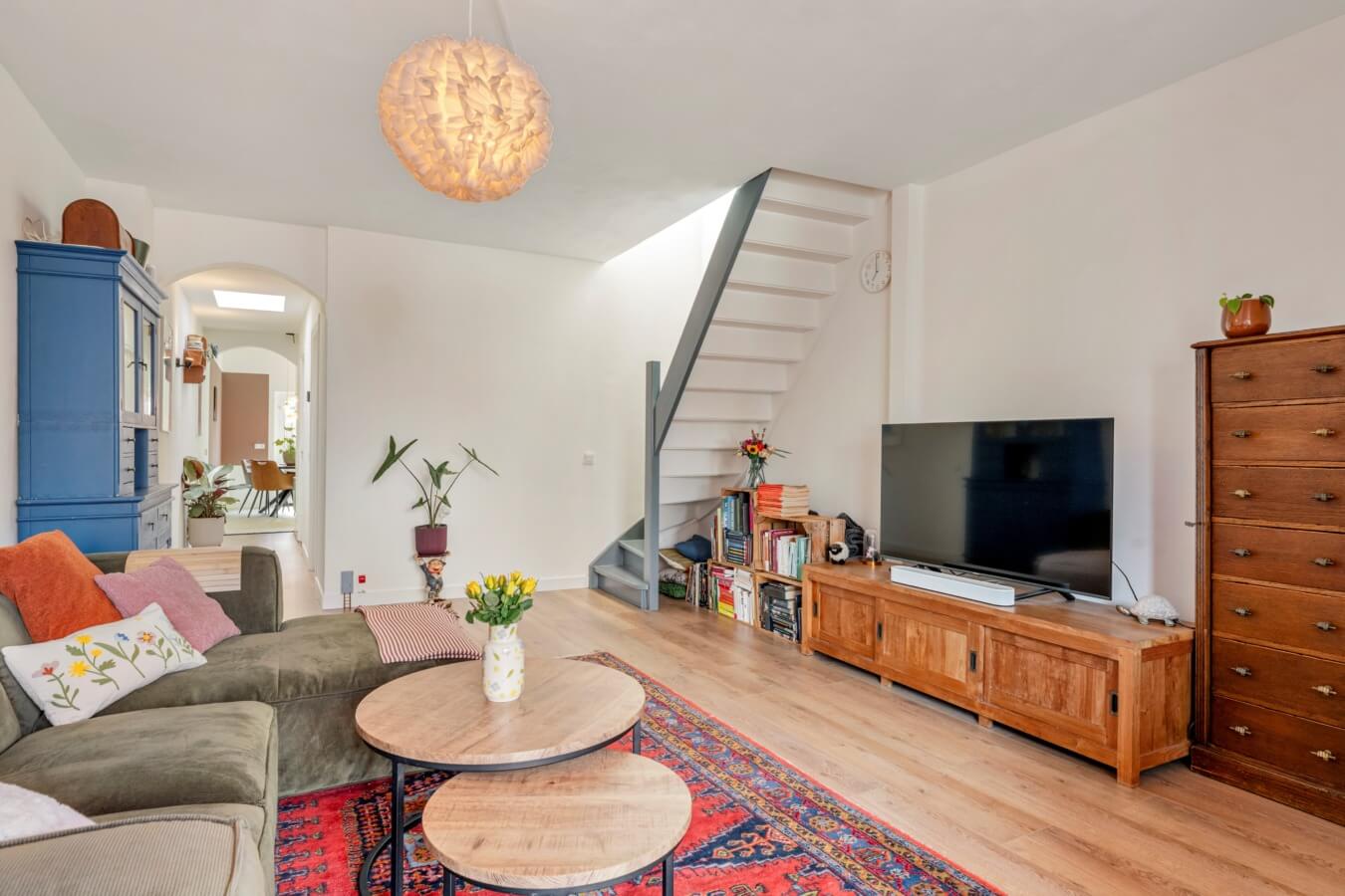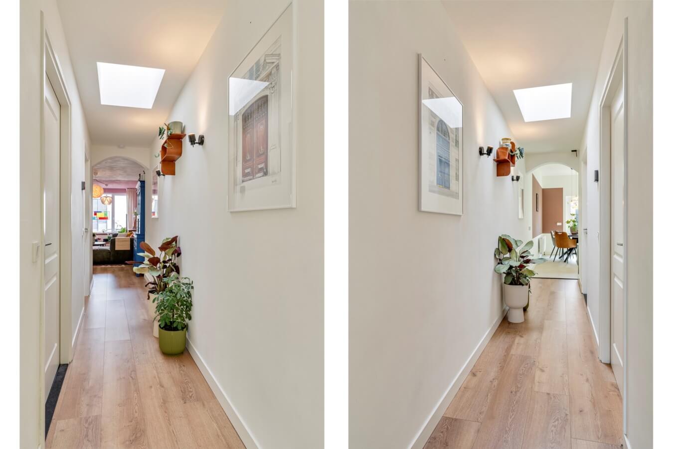 Aan de voorzijde bevindt zich de woonkamer met prettig zicht op de straat en een oppervlakte van circa 30 m². Via de open trap in de woonkamer bereik je de verdieping. De lange tussenportaal met een lichtkoepel maakt een mooie scheiding tussen het zitgedeelte en de woonkeuken.