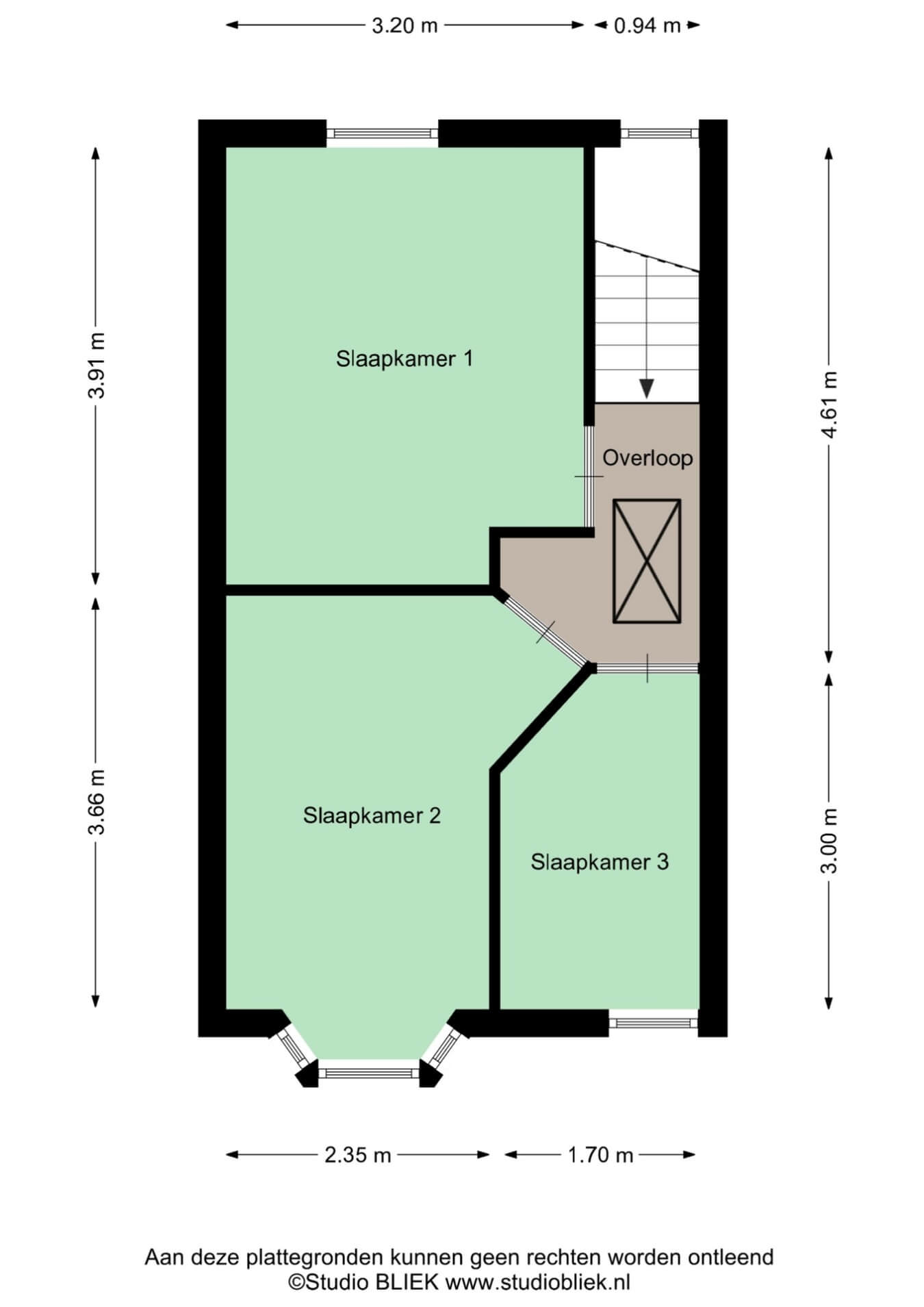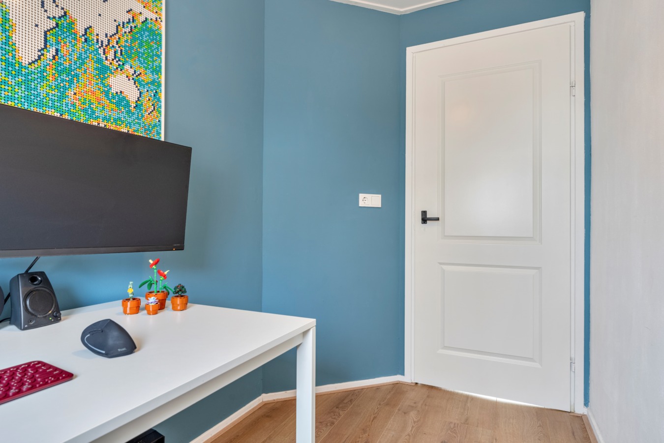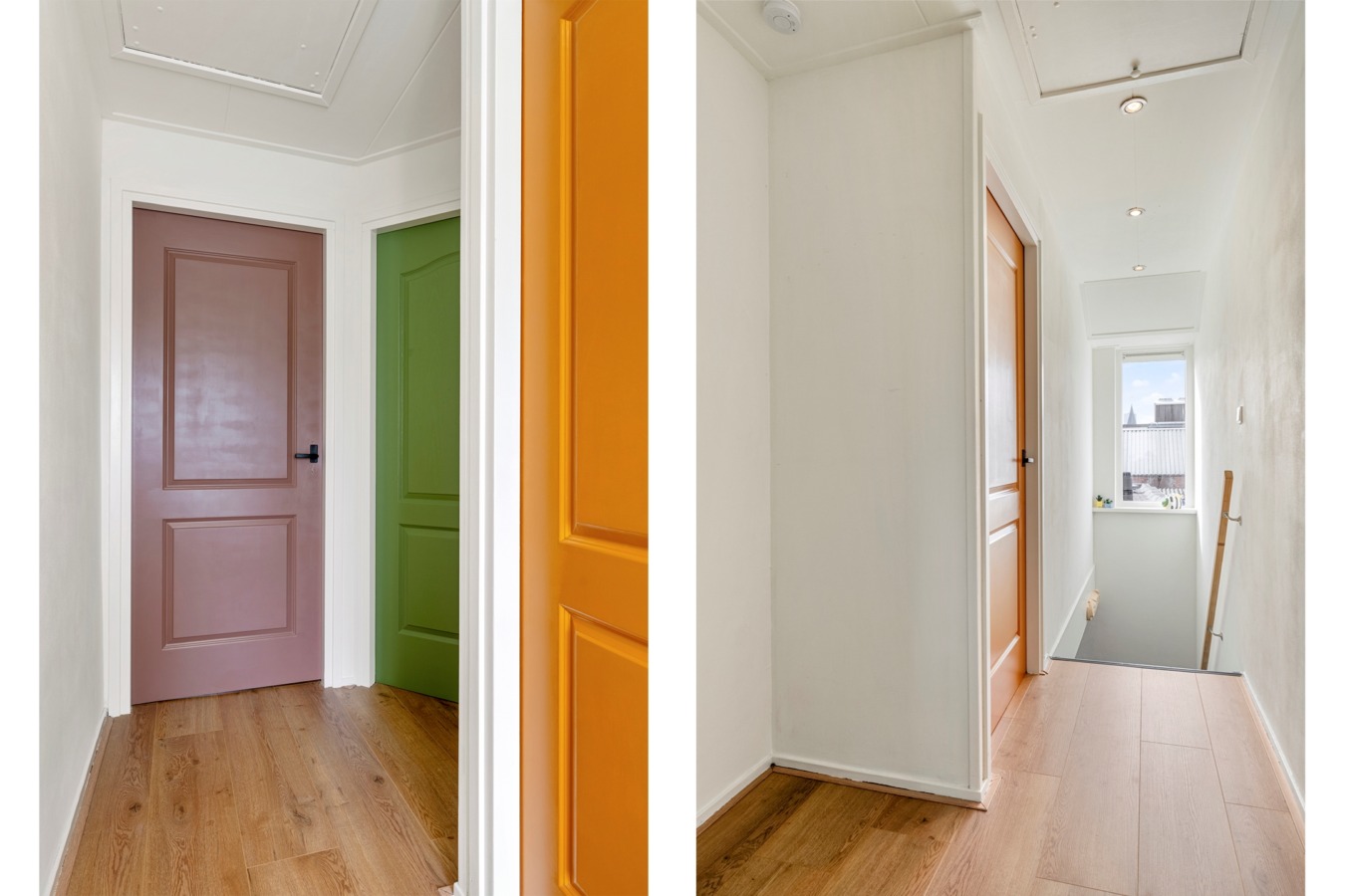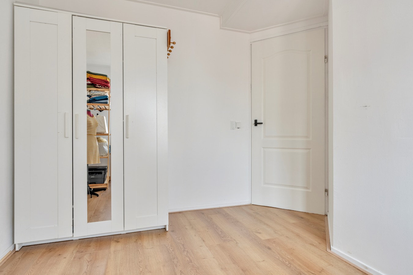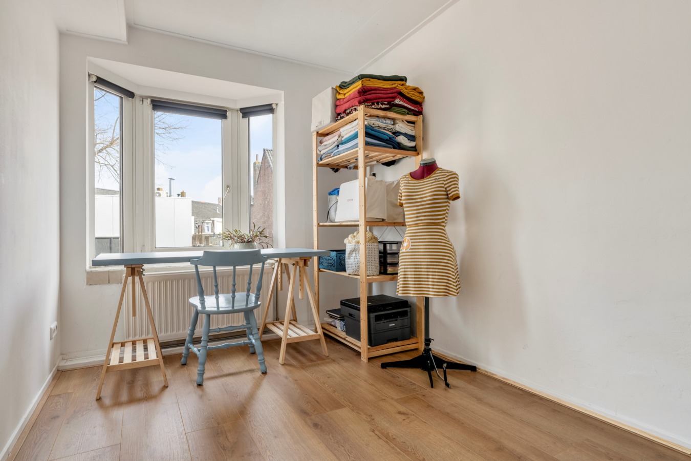 De overloop geeft toegang tot drie slaapkamers, met alle vertrekken een laminaatvloer. Aan de achterzijde ligt een ruime slaapkamer van circa 12,5 m². Aan de voorzijde bevinden zich twee kamers van circa 10 m² en 6 m². De grotere kamer aan de voorzijde beschikt over een erker met een prettig uitzicht over de straat. De slaapkamers aan de voorzijde hebben kunststof kozijnen met dubbel glas.