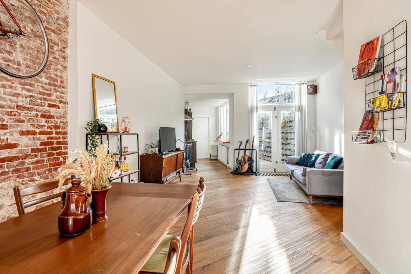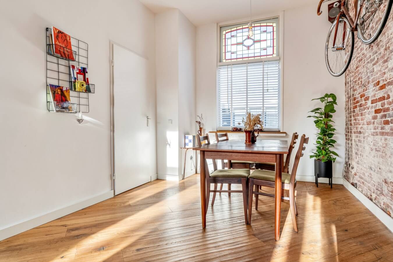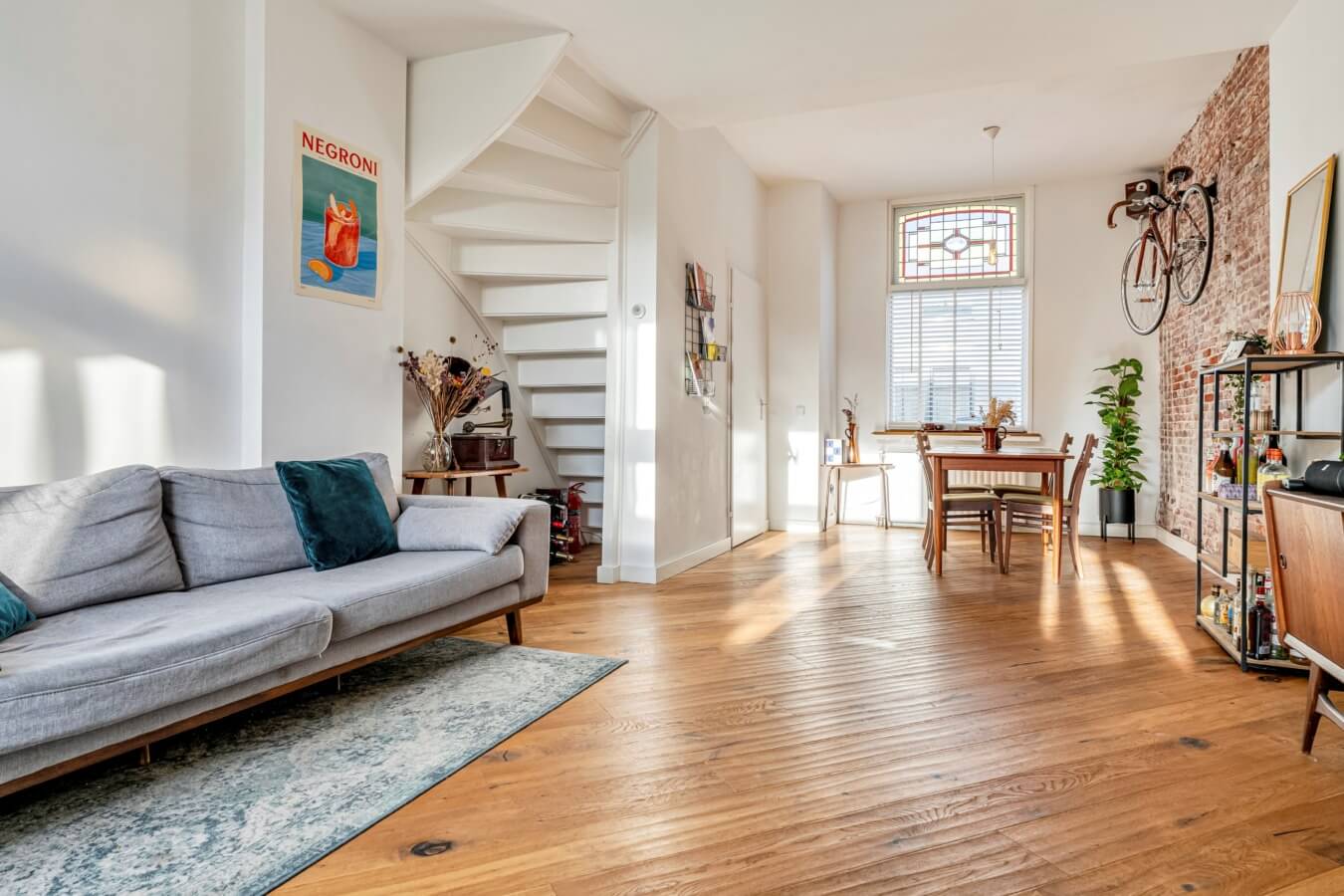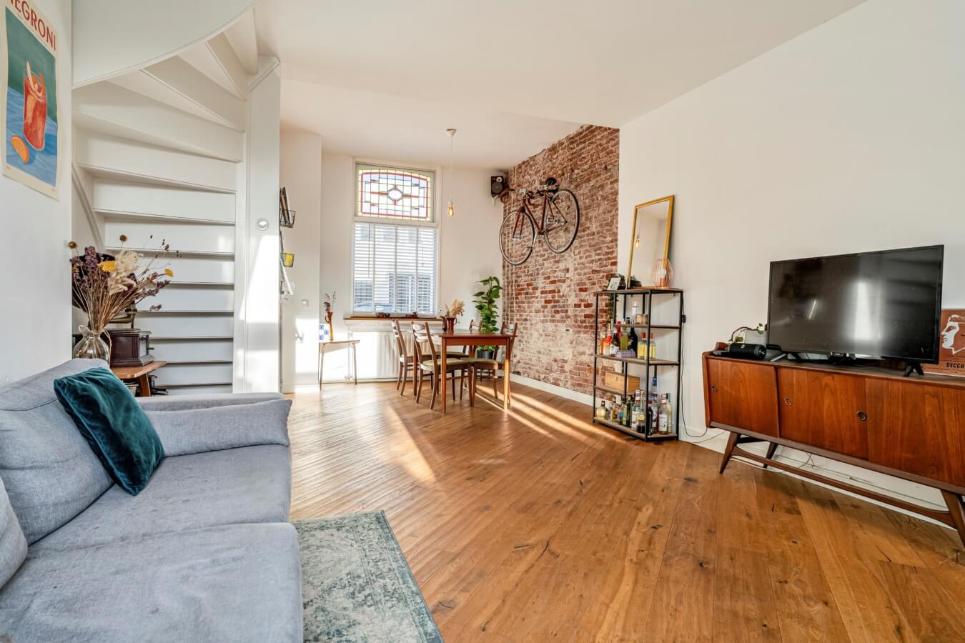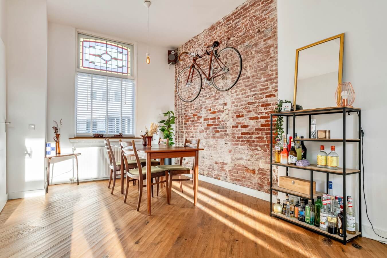 De woonkamer ademt sfeer en authenticiteit, aan de voorzijde is ruimte voor een royale eettafel, omlijst door ramen met glas-in-looddetails. De in het zicht gebrachte oude binnenmuur geeft de ruimte een stoer, industrieel accent en vormt een echte eyecatcher.